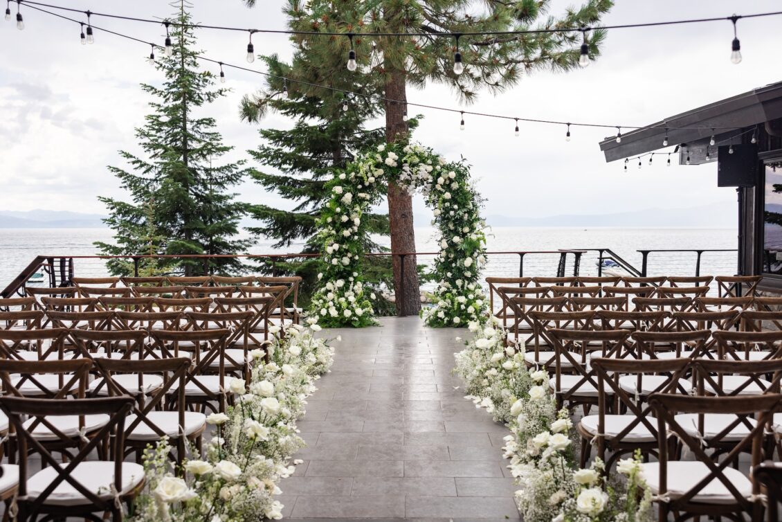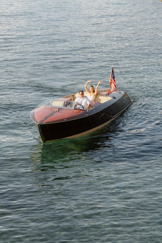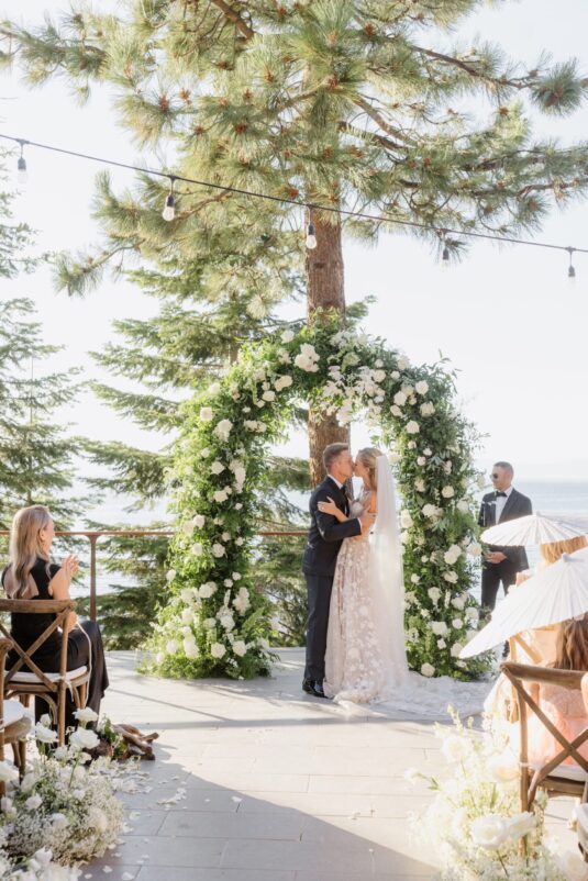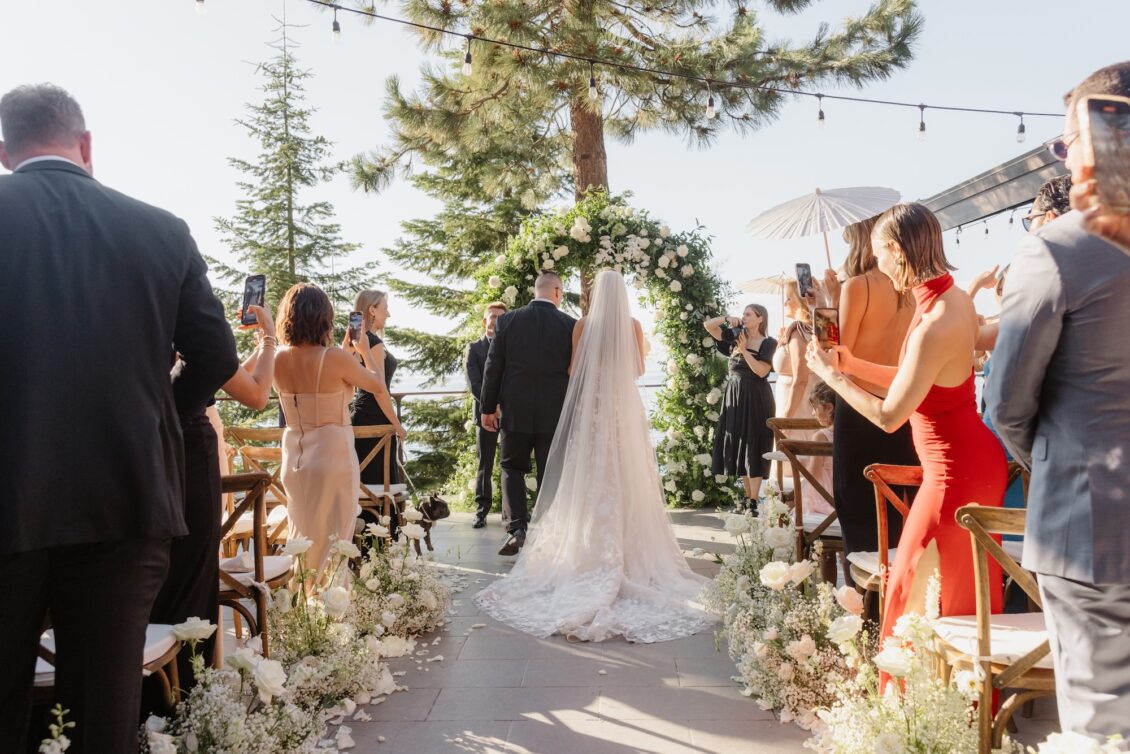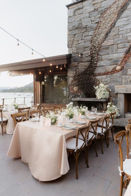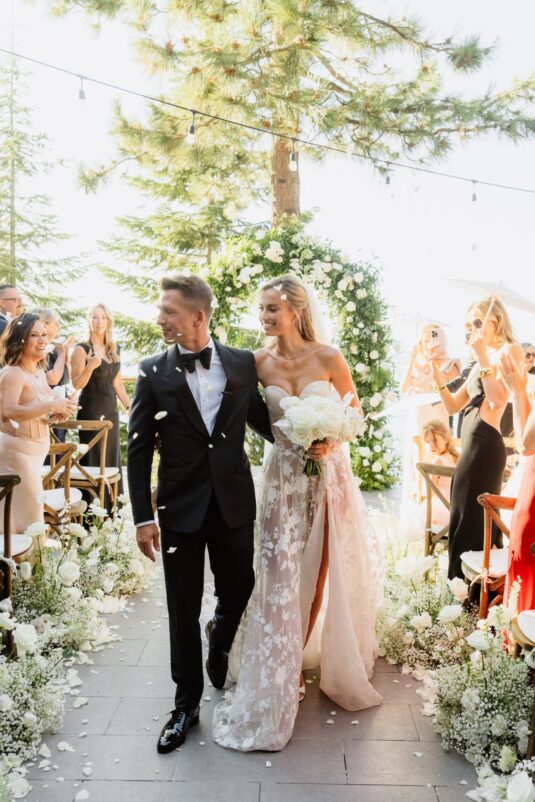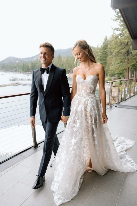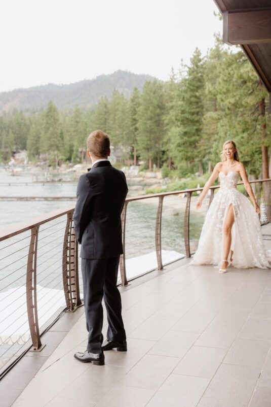 The festivities didn’t end there. Guests enjoyed a post-wedding beach BBQ with their favorite OC butcher, Aperol spritzes, and leisurely boat cruises across the lake—a perfect balance of luxury and laid-back charm. From the groom’s hilarious stint as MC to the poignant moment a hummingbird appeared during the bride’s walk down the aisle in honor of her late grandfather, every detail of this luxury destination wedding in Lake Tahoe was layered with meaning. It was not just a wedding—it was a once-in-a-lifetime celebration of love, style, and soul.