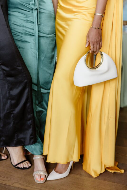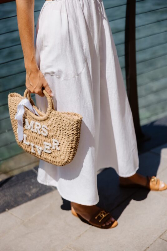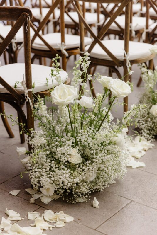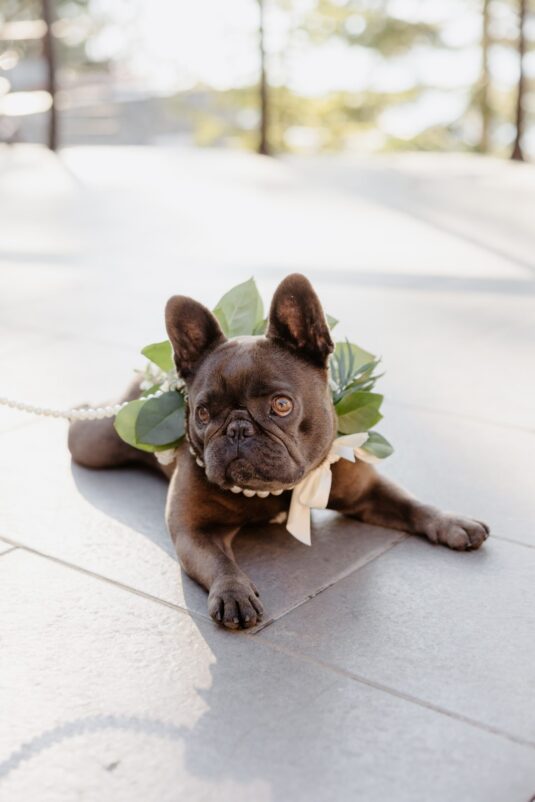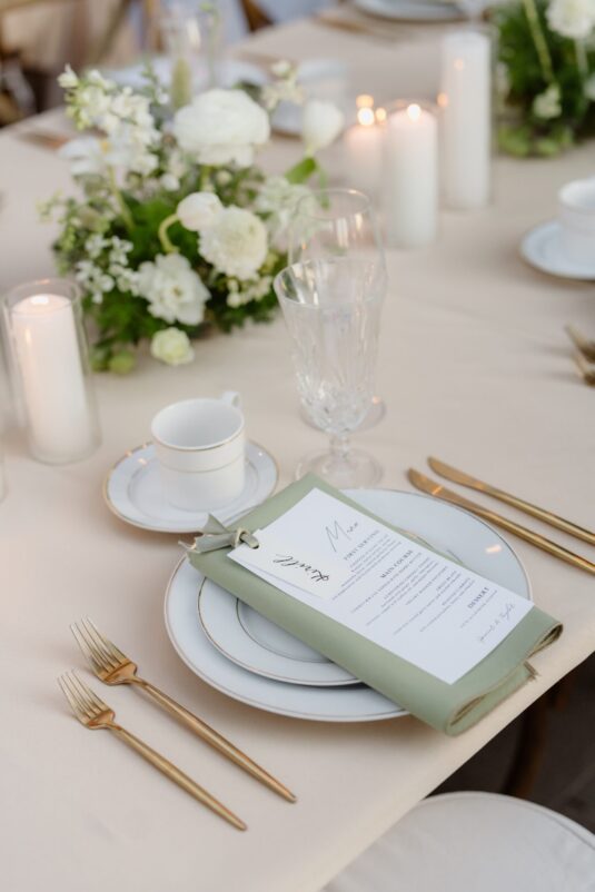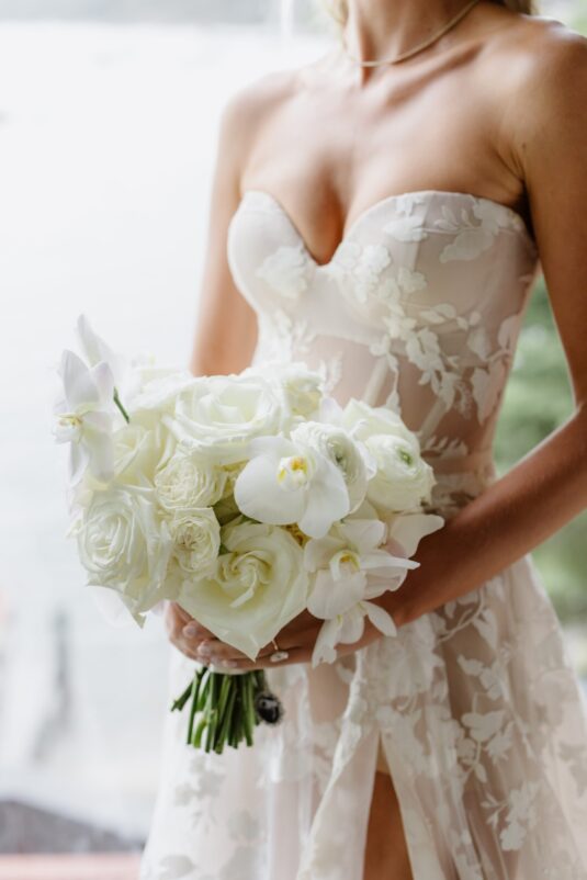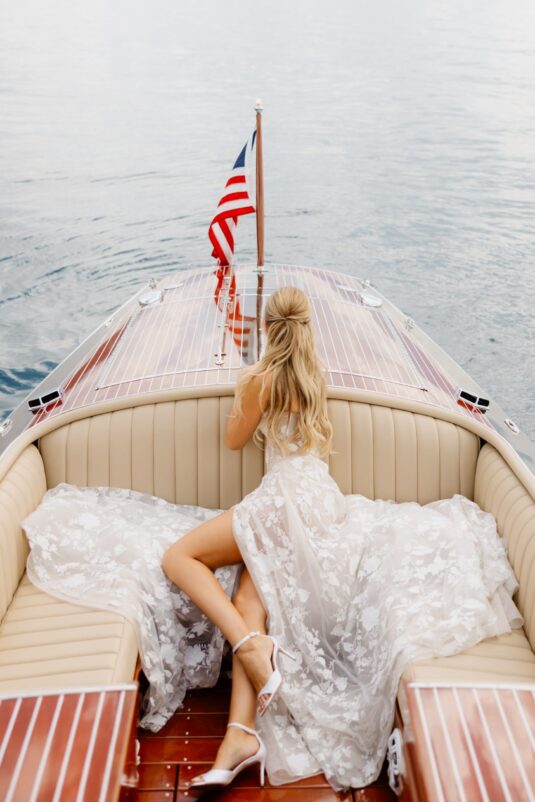 Arriving by boat to the hauntingly romantic strains of Lana Del Rey’s “Video Games,” the bride made her entrance down the dock like a runway, wearing the exquisite “Holly” gown by Galia Lahav. The dress, with its intricate lace, figure-hugging silhouette, and timeless-meets-sexy design, set the tone for a day where fashion and emotion intertwined seamlessly. The ceremony, officiated by the couple’s best friend, took place with panoramic lake views and the soft palette of olive green, cream, and white echoing the surrounding woods.