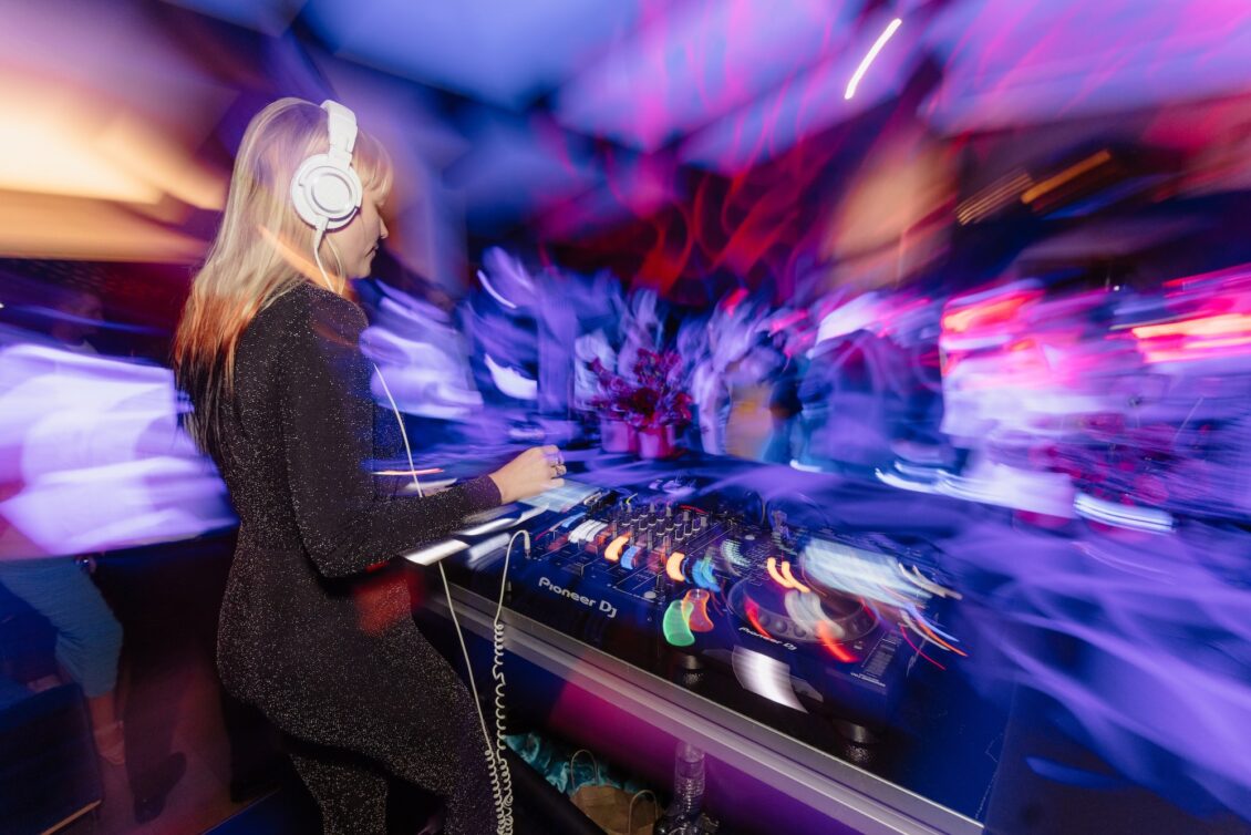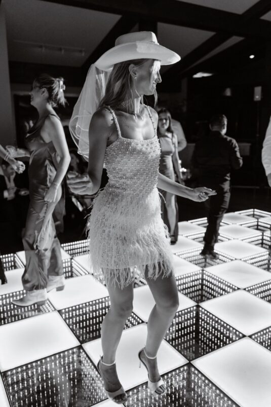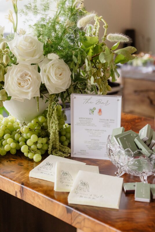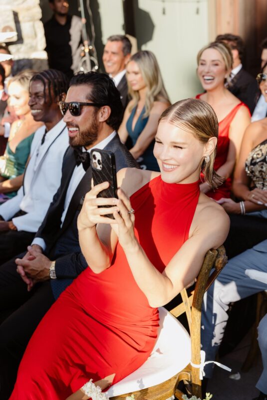 Dinner was a feast worthy of the occasion—grass-fed steaks, warm bread topped with flaky sea salt butter, and bacon-wrapped dates, paired with signature cocktails that told the couple’s story: the “Spencerita,” the “Taylor Tini,” and the “Virgin Valentina” (named after their beloved French bulldog). As the sun dipped below the mountains, the celebration transitioned to an after-party, where the bride changed into a dazzling Nadine Merabi look, and DJ Julia Sandstrom from Ibiza kept the dance floor alive well into the night.