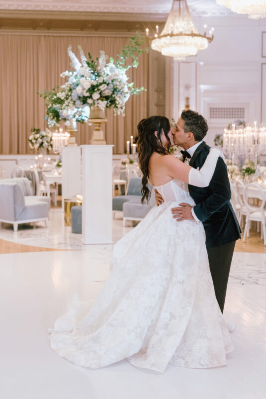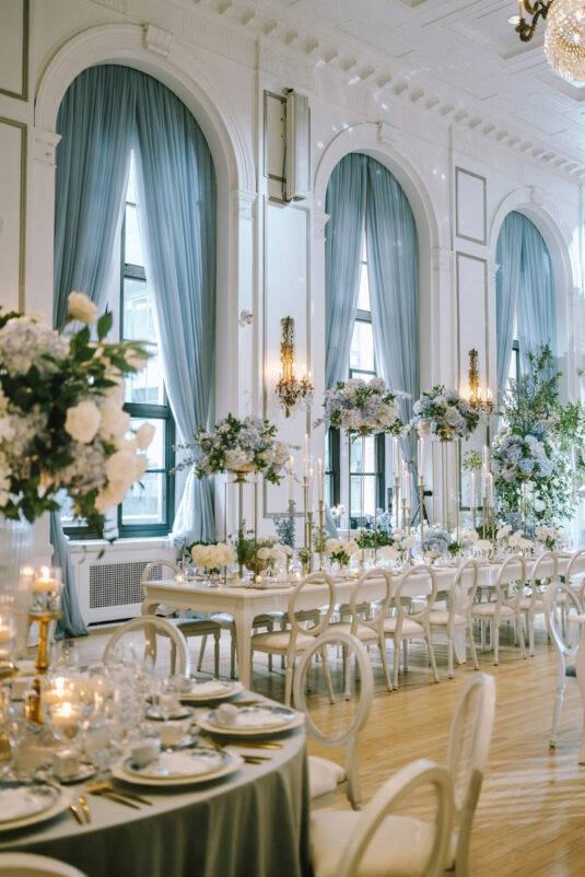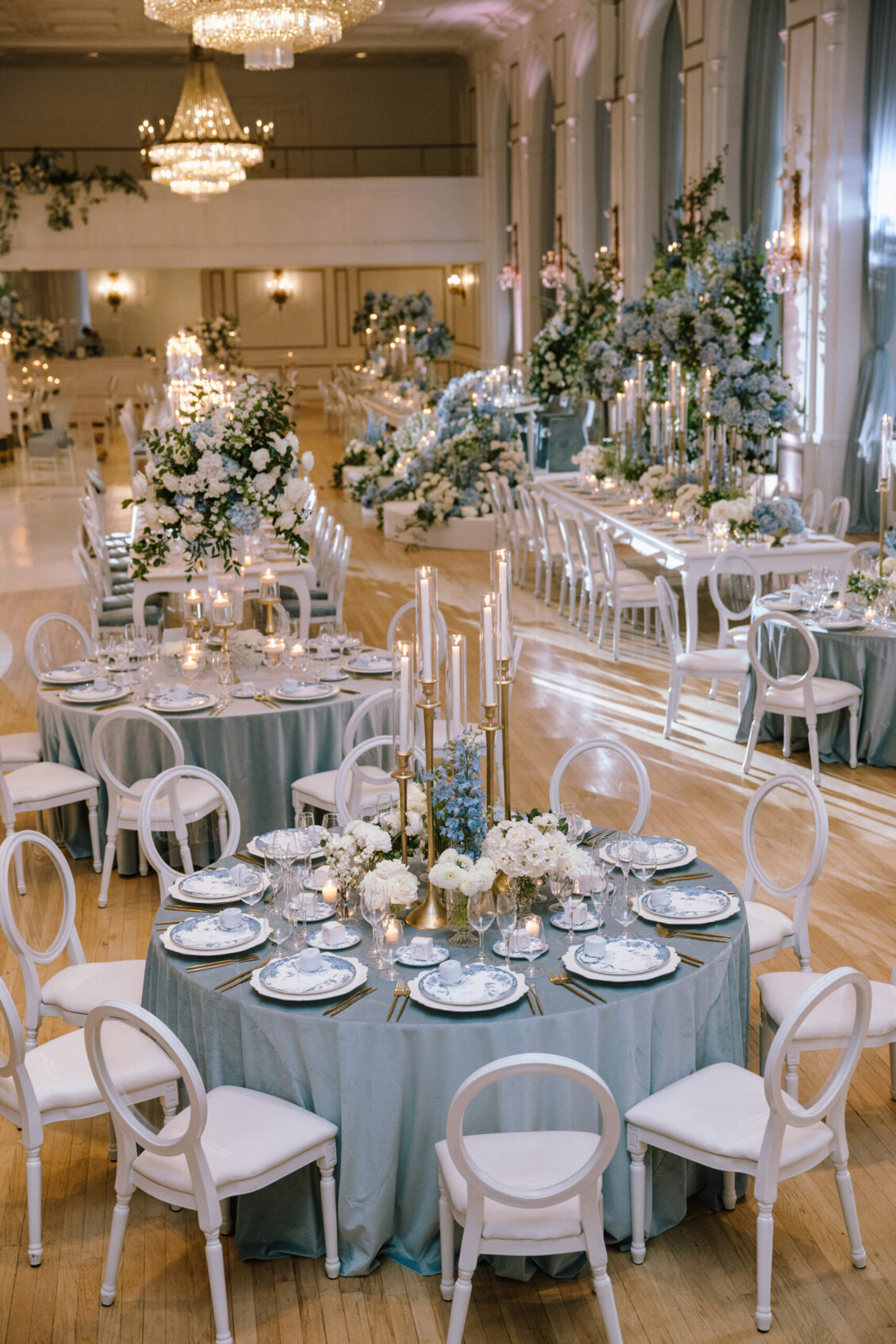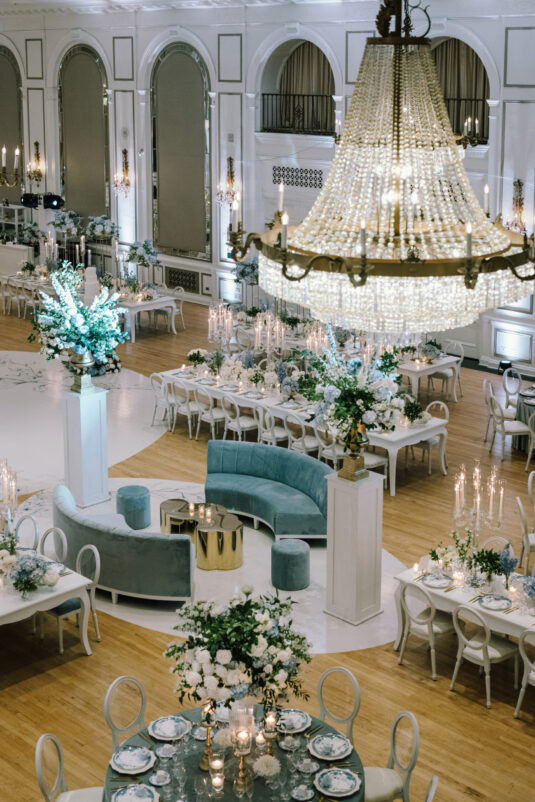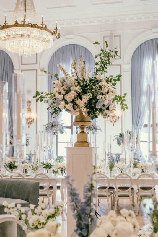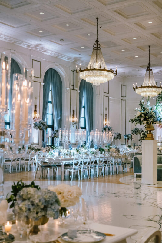 Desirée and Steven’s wedding at Toronto’s Fairmont Royal York combined timeless elegance with fresh Rococo style. Soft powder blue and gold accents elevated the historic ballroom, creating a chic, dreamy setting for over 400 guests. From the lush florals to the custom drapery, every detail perfectly captured their vision of classic meets contemporary.