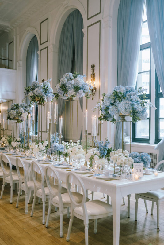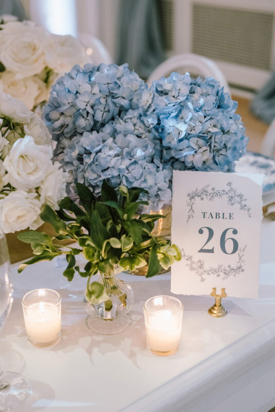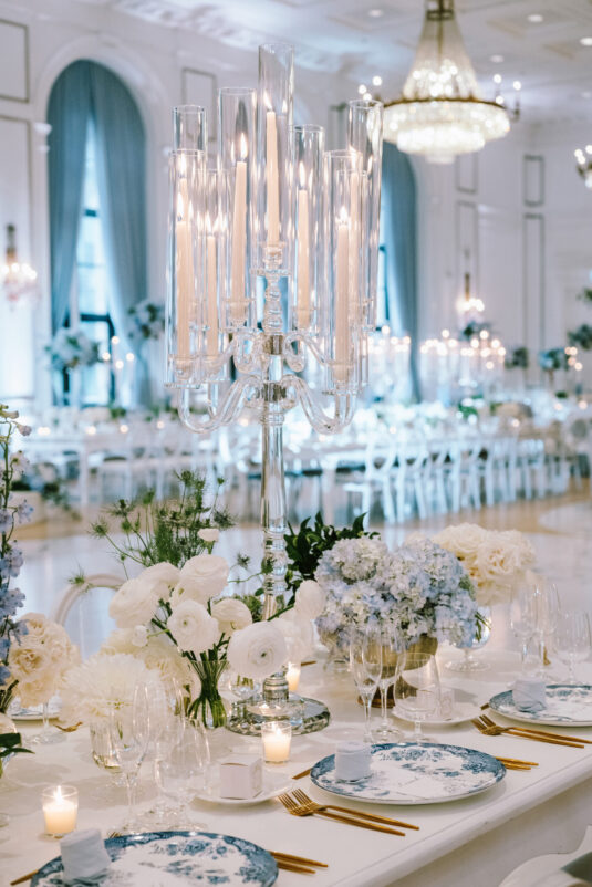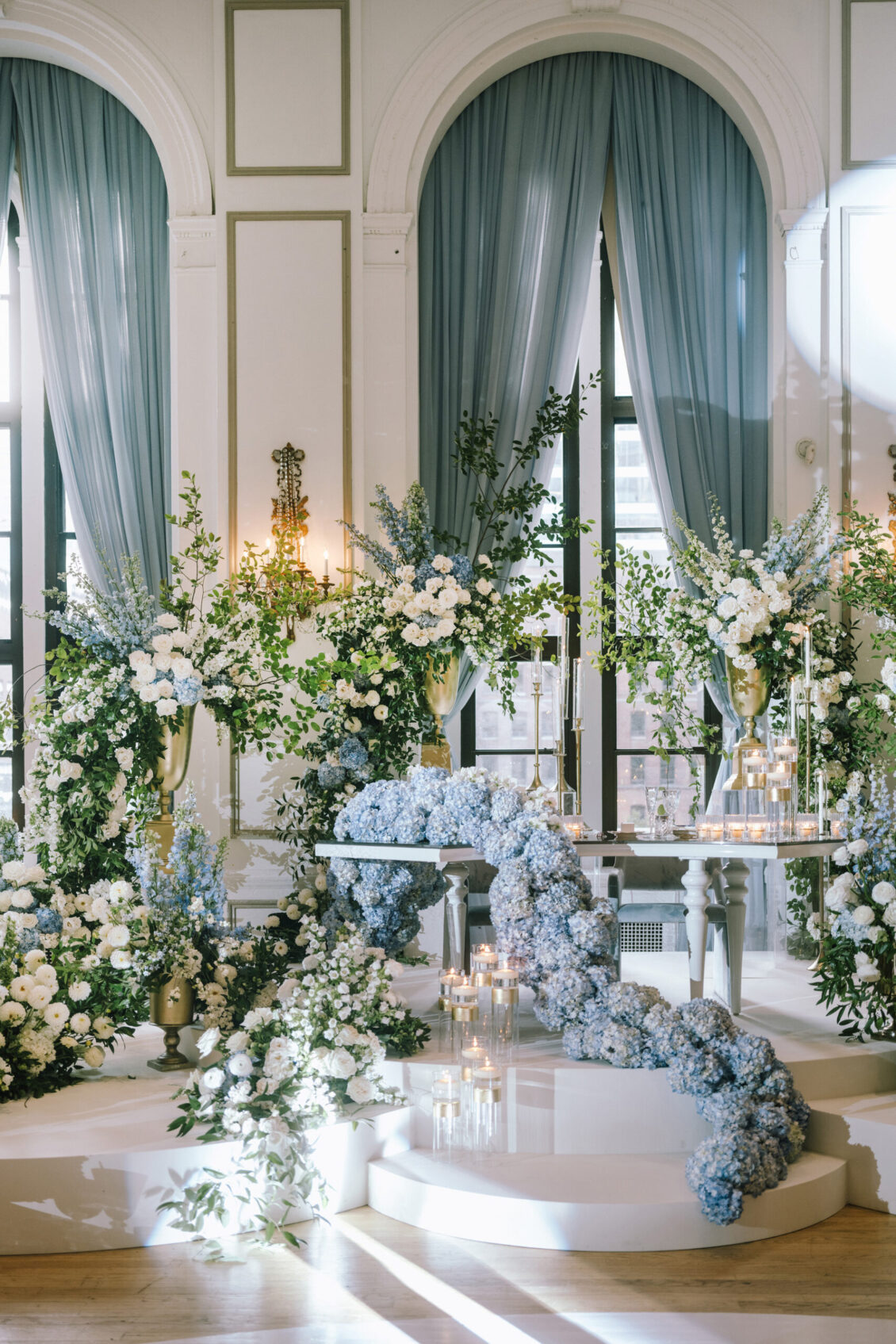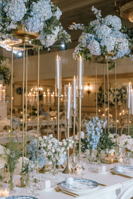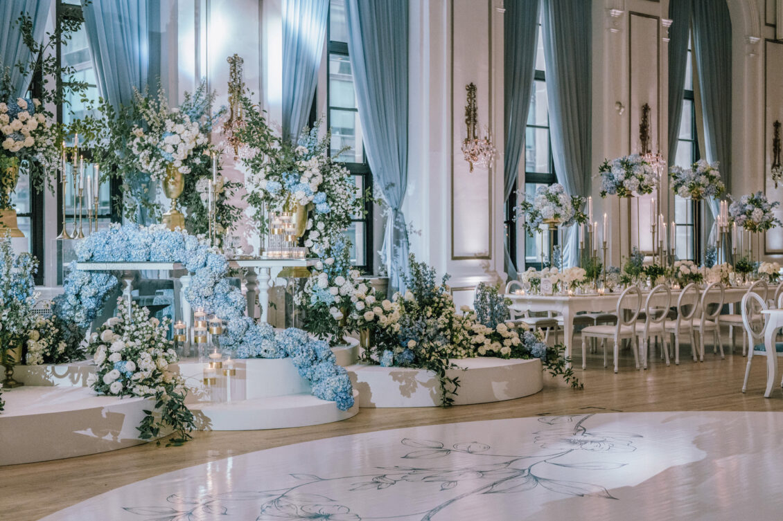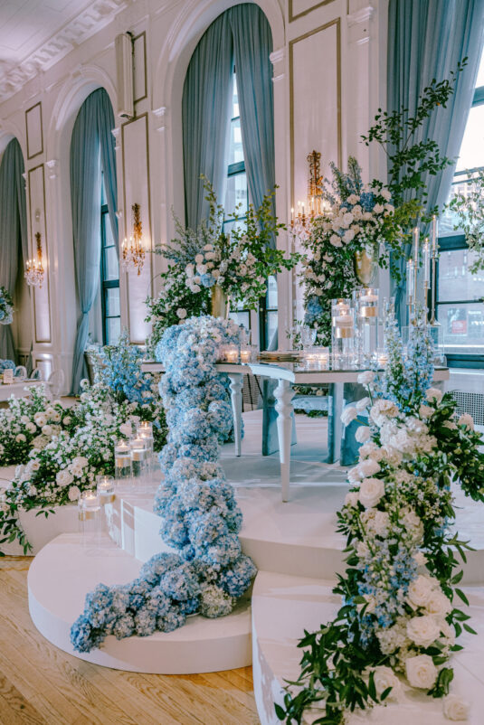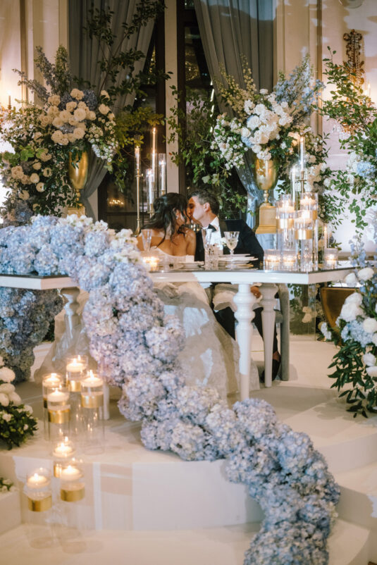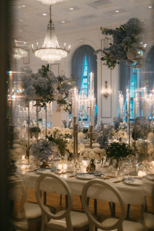 The floral design was nothing short of spectacular, with approximately 8,000 blooms used throughout the celebration. The installations featured 2,500 white roses, 1,750 blue hydrangea, 1,000 white campanula, 750 blue delphinium, 500 locally sourced white ranunculus, and 500 helleborus imported from Holland. At each place setting, napkins were carefully hand-folded into delicate rose shapes, echoing the floral motif and adding a personal, artful detail to the table design.