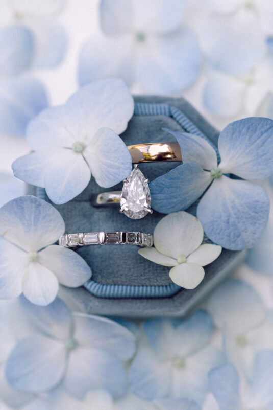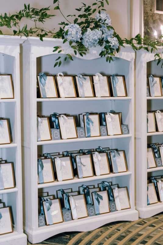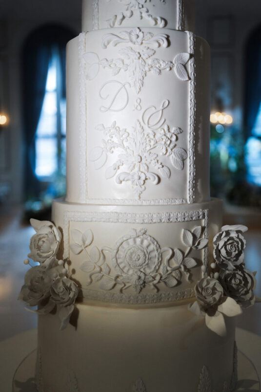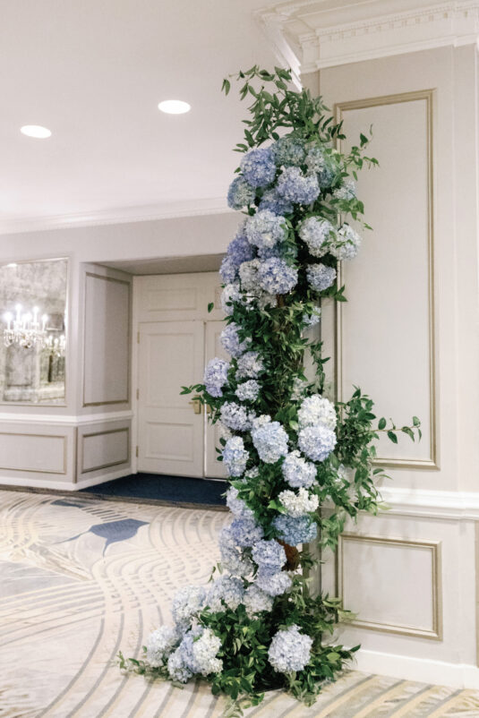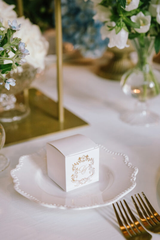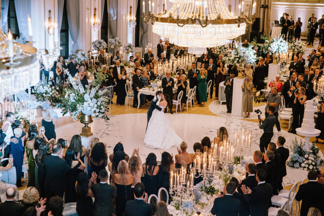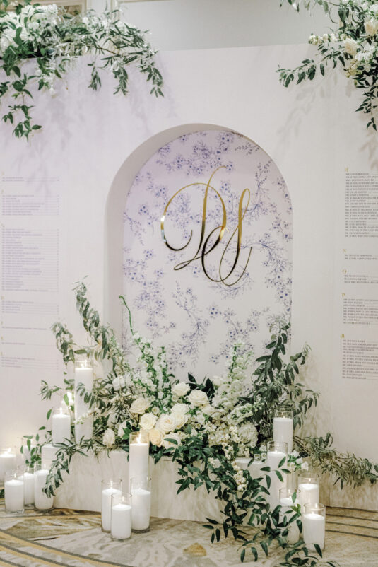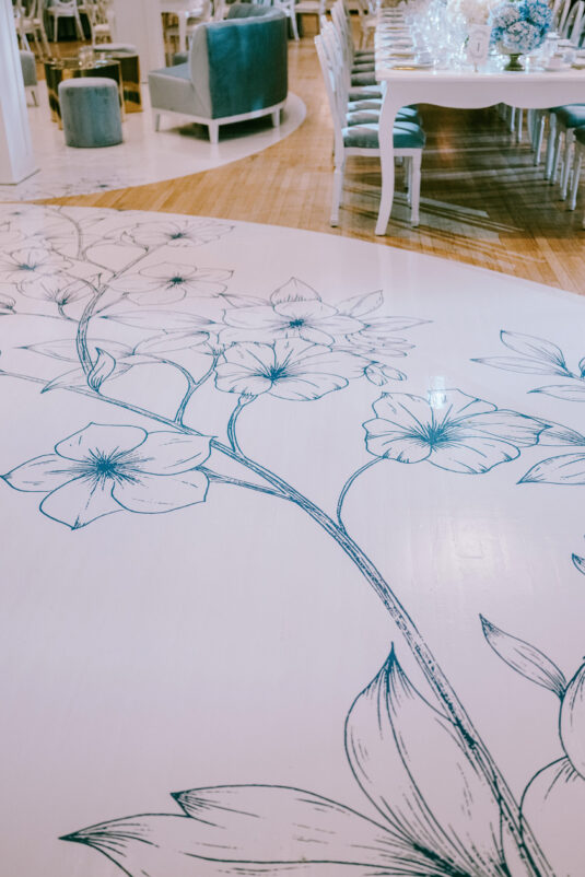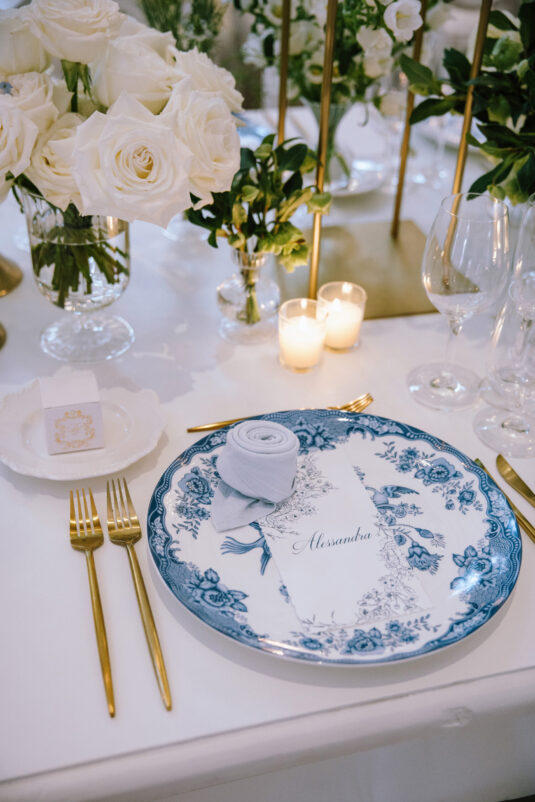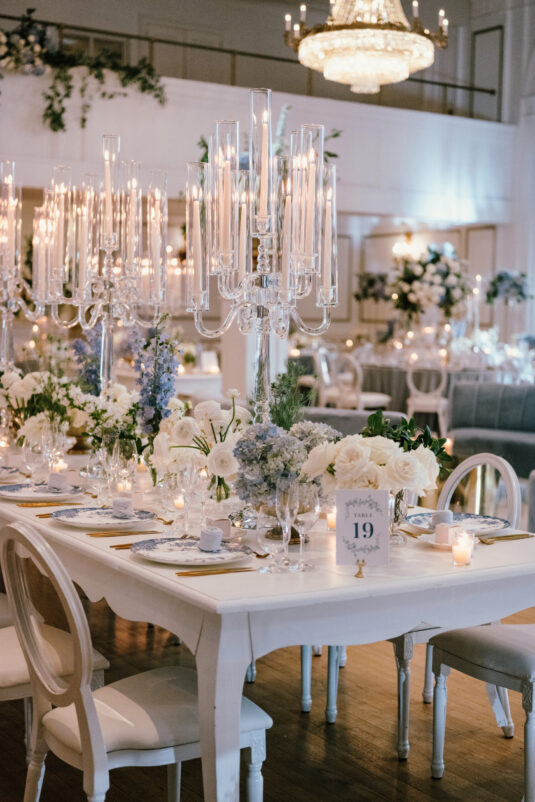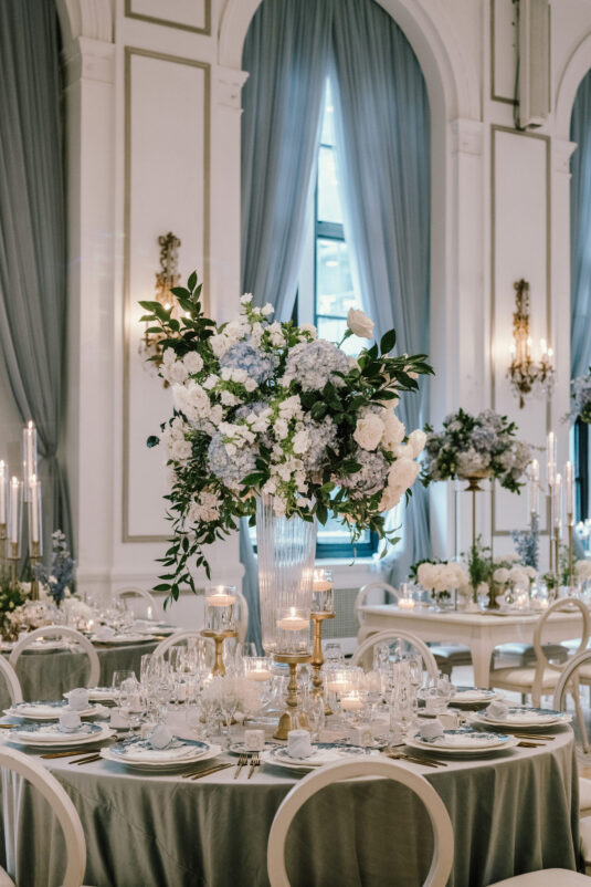 The floral design was nothing short of spectacular, with approximately 8,000 blooms used throughout the celebration. The installations featured 2,500 white roses, 1,750 blue hydrangea, 1,000 white campanula, 750 blue delphinium, 500 locally sourced white ranunculus, and 500 helleborus imported from Holland. At each place setting, napkins were carefully hand-folded into delicate rose shapes, echoing the floral motif and adding a personal, artful detail to the table design.