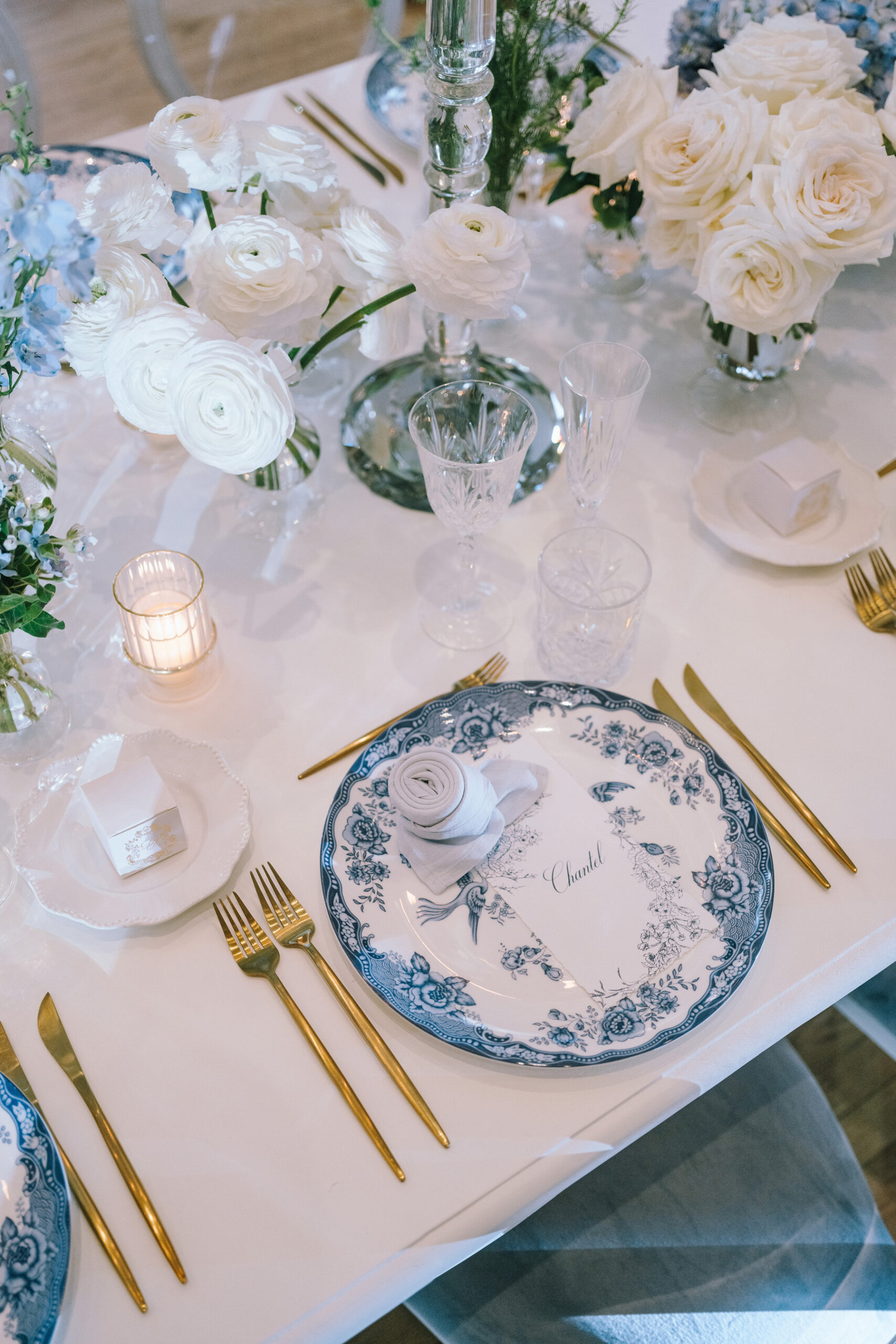 A formal table setting in Fresh Rococo Style features a blue and white floral plate, gold cutlery, crystal glassware, white flowers, a lit candle, and a rolled napkin on the plate—all arranged on a pristine white tablecloth.