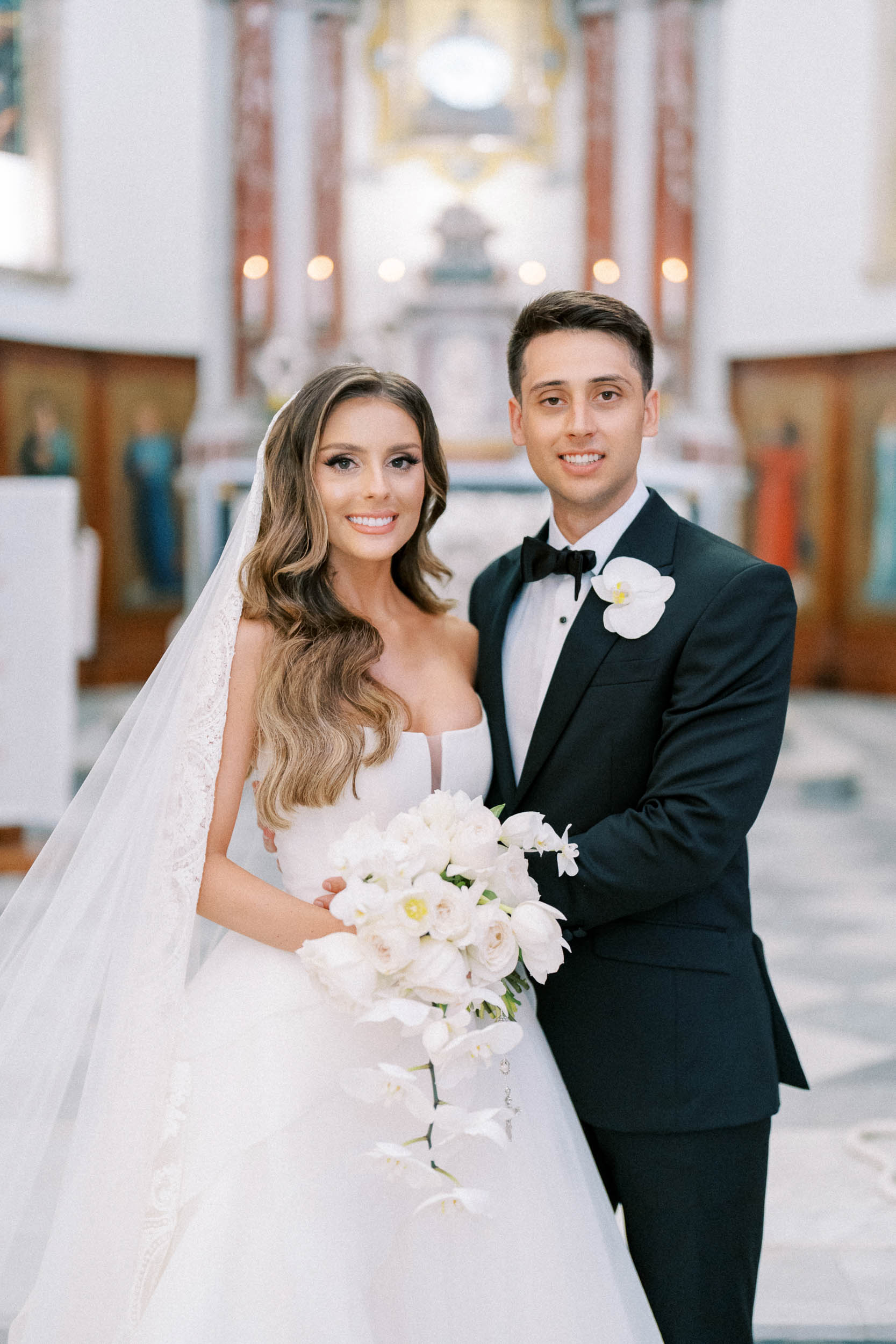 A bride in a white gown and veil stands next to a groom in a black tuxedo with a white boutonniere. Smiling, they hold a bouquet of white flowers at their Montenegro wedding at Boka Bay, inside a church adorned with beautiful paintings.