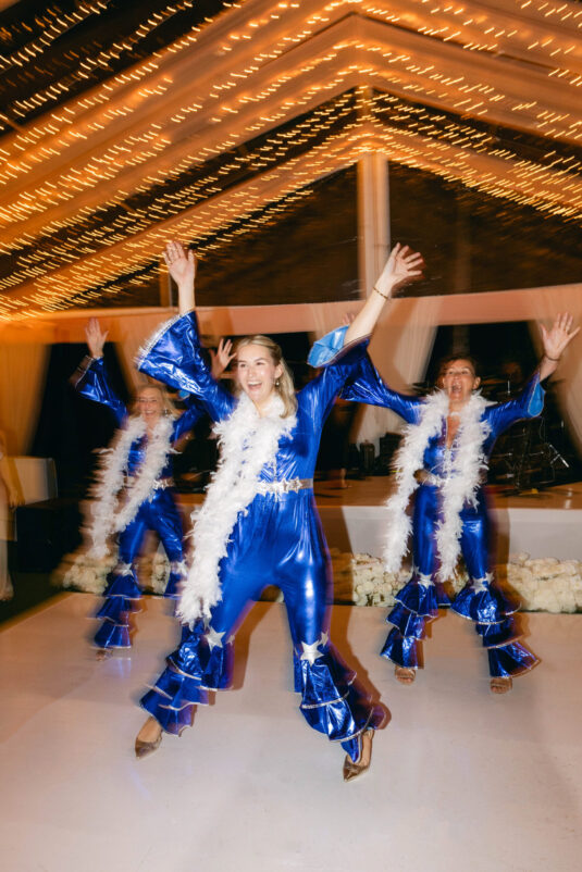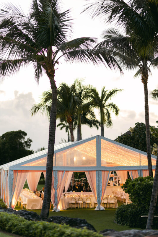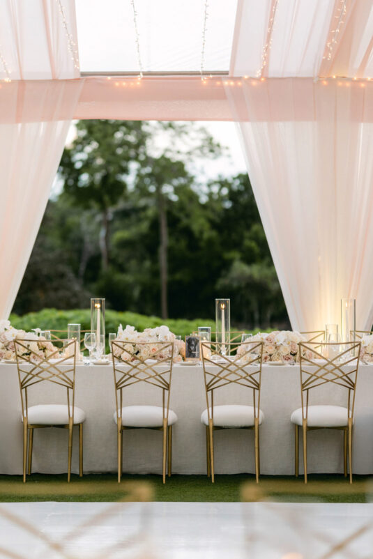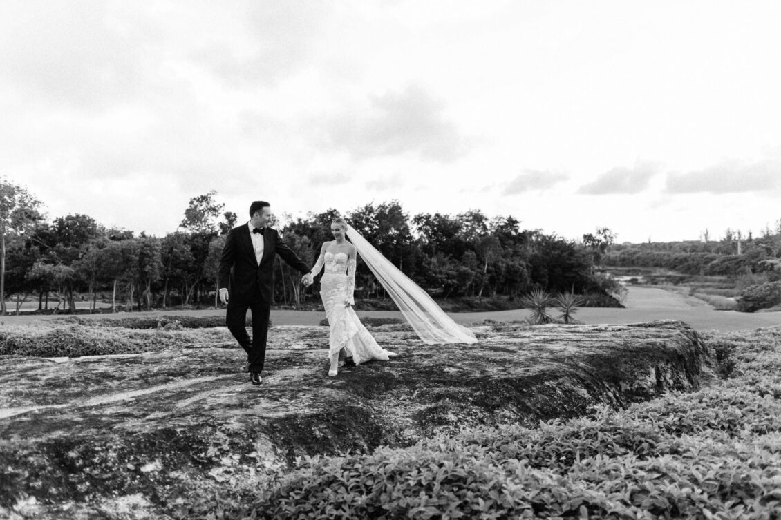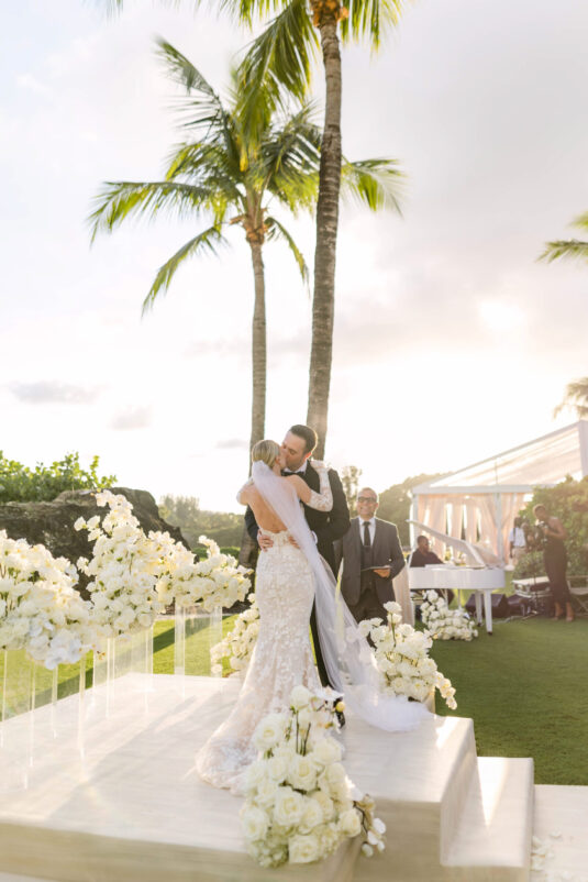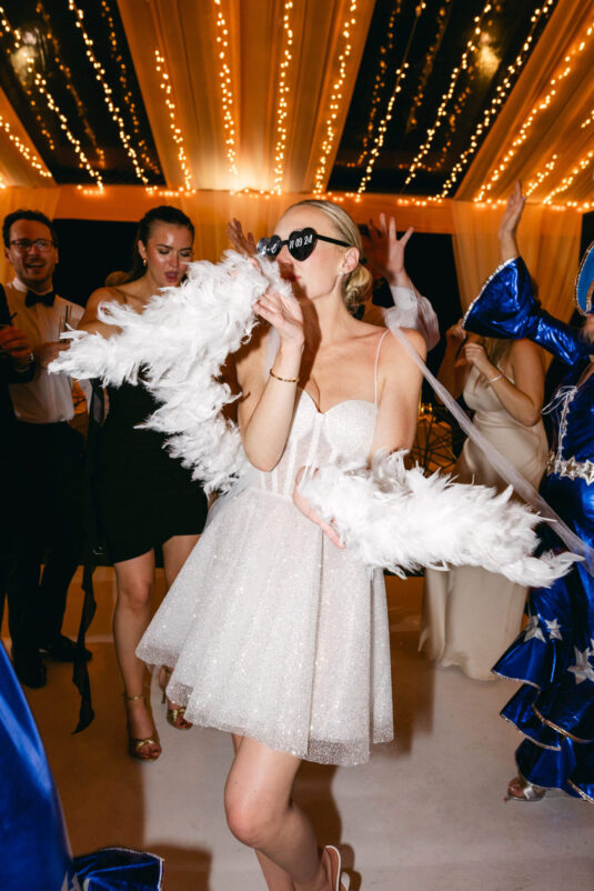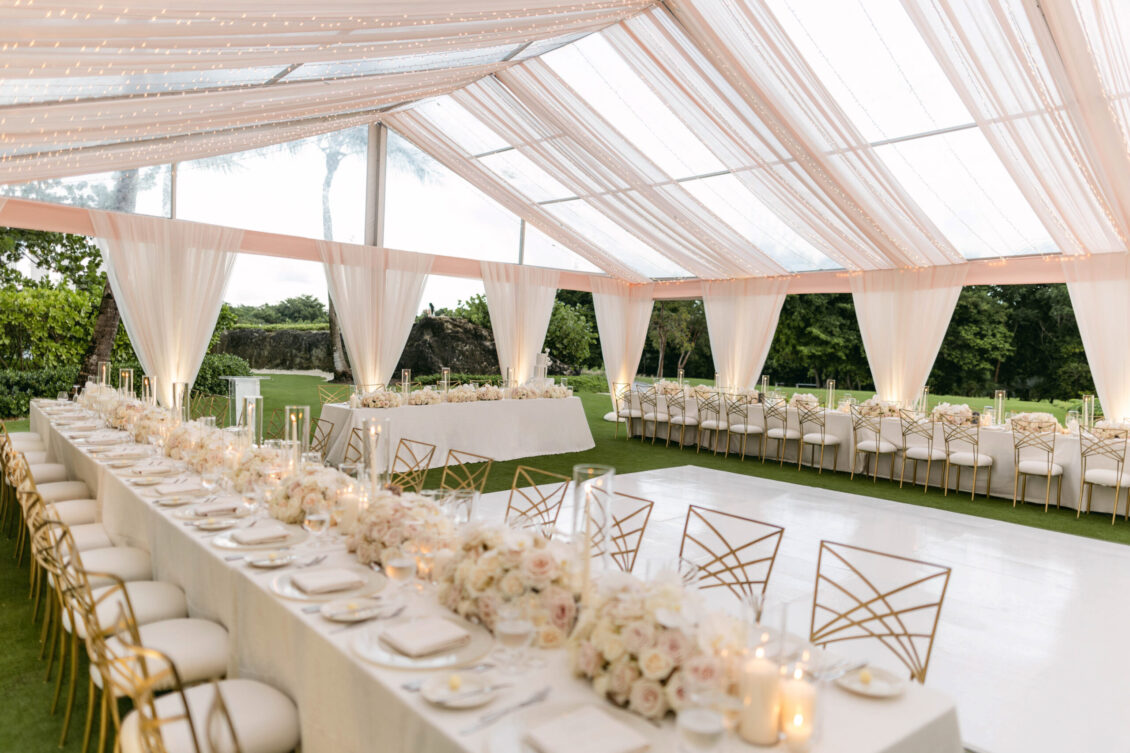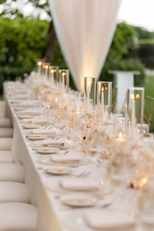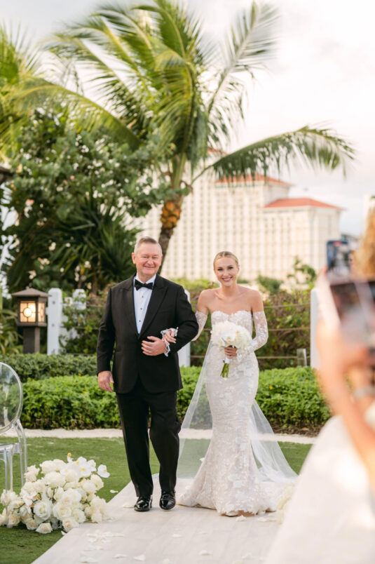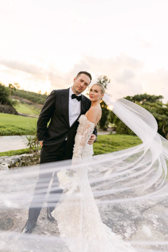 On the wedding day, Olivia prepared for her big moment surrounded by her mom and bridesmaids, slipping into a custom Mira Zwillinger gown that perfectly captured her personality and style. A heartfelt first look on the SLS grounds was followed by portraits across the golf course, complete with parasols and a soft island breeze. The ceremony on the Royal Blue Golf Club green was a vision of romance, lined with white florals and accompanied by live piano, culminating in a cocktail hour at the picturesque Water Tower. Dinner under a draped lawn tent featured soft blush and white florals, creating a dreamy, romantic atmosphere. As the sun set, the luxury destination wedding transitioned into a lively celebration, with the dance floor alive to music and a surprise Mamma Mia performance that had everyone on their feet.