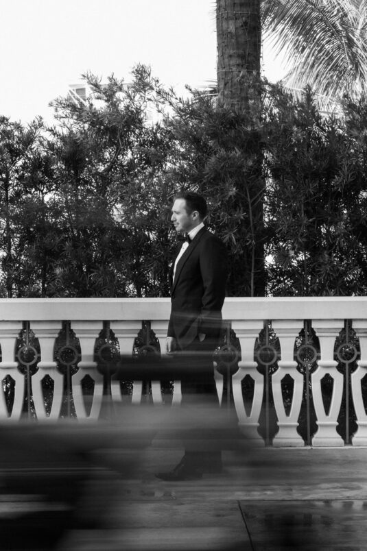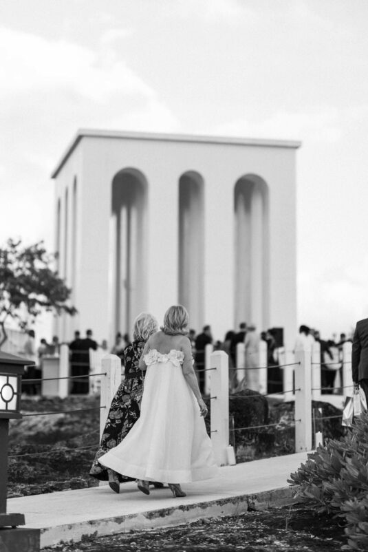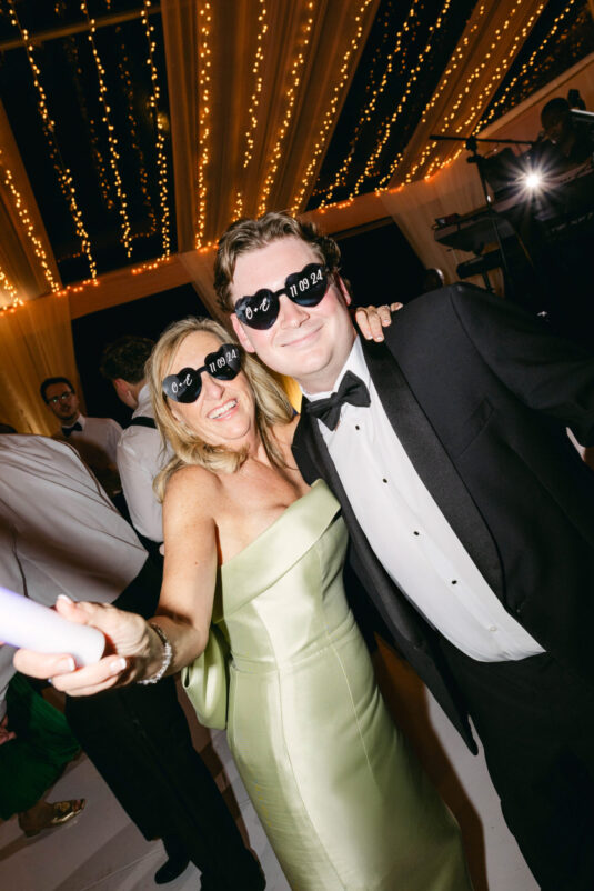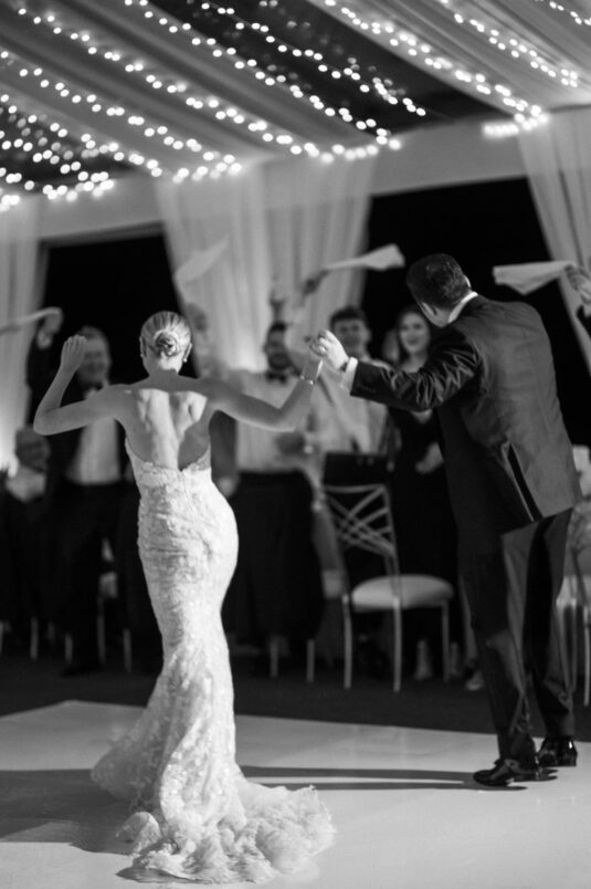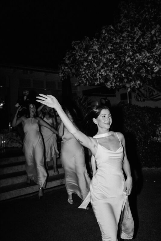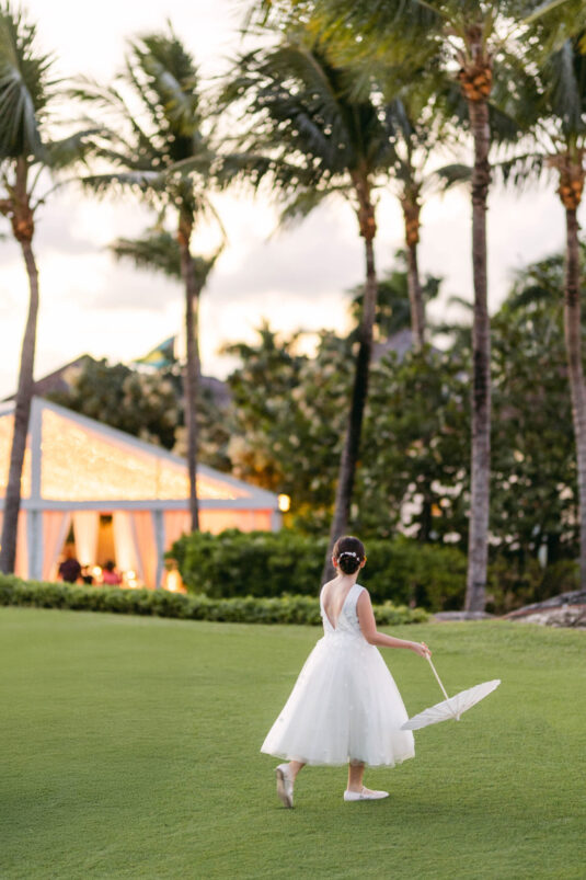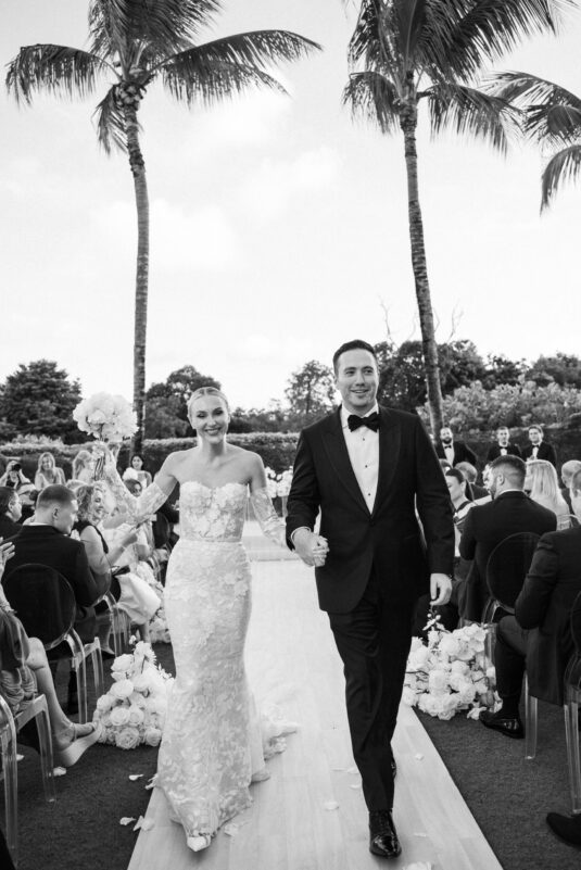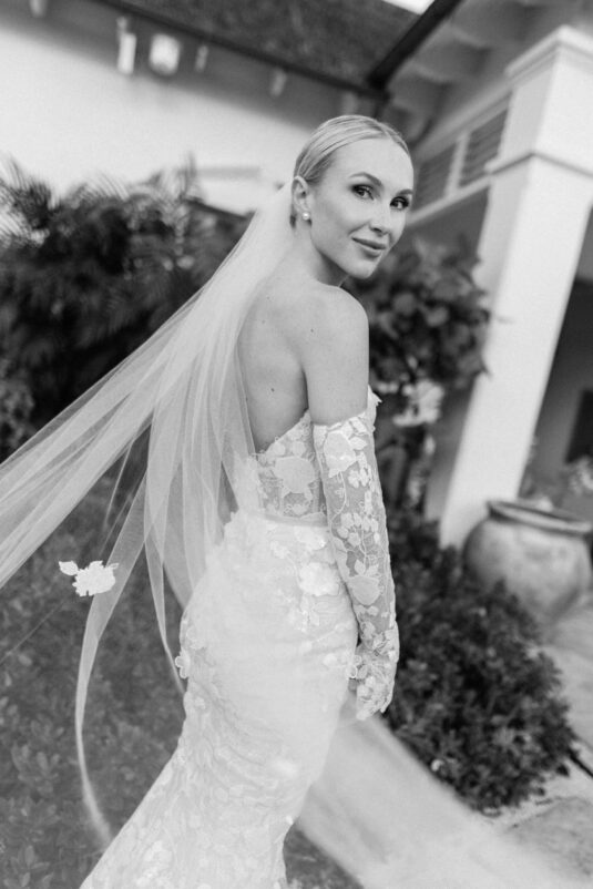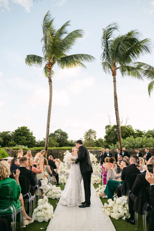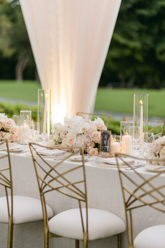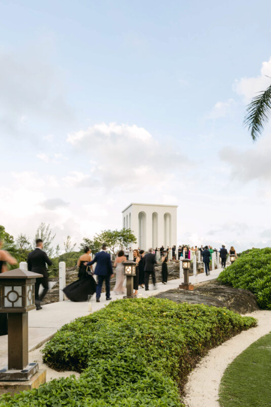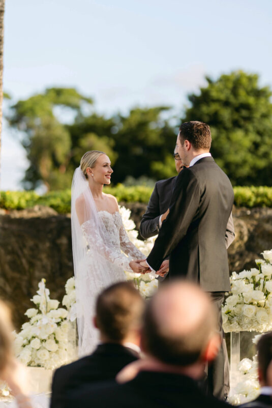 On the wedding day, Olivia prepared for her big moment surrounded by her mom and bridesmaids, slipping into a custom Mira Zwillinger gown that perfectly captured her personality and style. A heartfelt first look on the SLS grounds was followed by portraits across the golf course, complete with parasols and a soft island breeze. The ceremony on the Royal Blue Golf Club green was a vision of romance, lined with white florals and accompanied by live piano, culminating in a cocktail hour at the picturesque Water Tower. Dinner under a draped lawn tent featured soft blush and white florals, creating a dreamy, romantic atmosphere. As the sun set, the luxury destination wedding transitioned into a lively celebration, with the dance floor alive to music and a surprise Mamma Mia performance that had everyone on their feet.