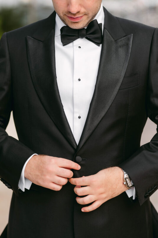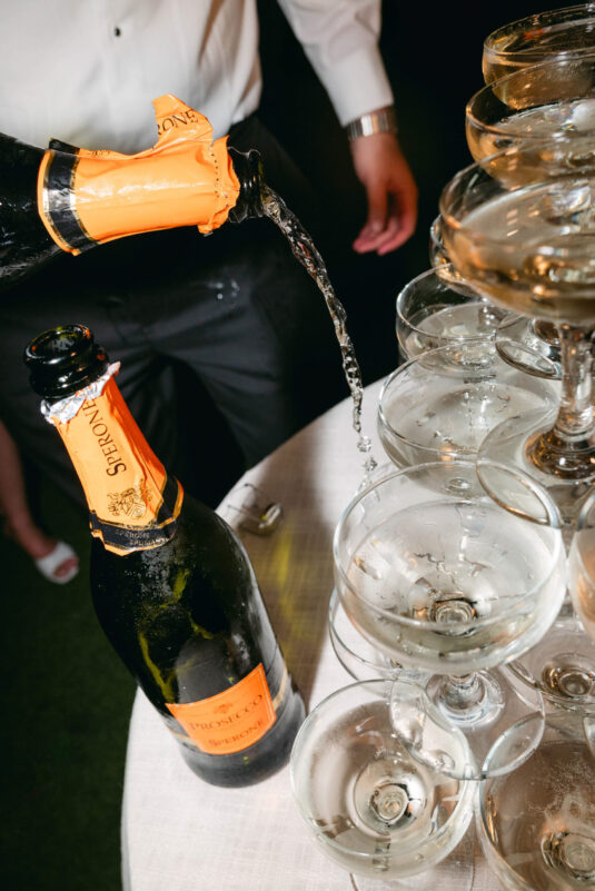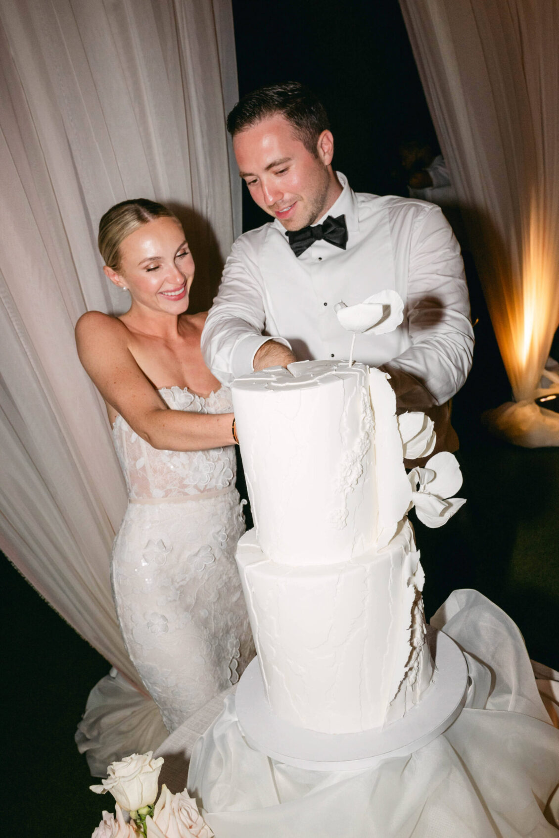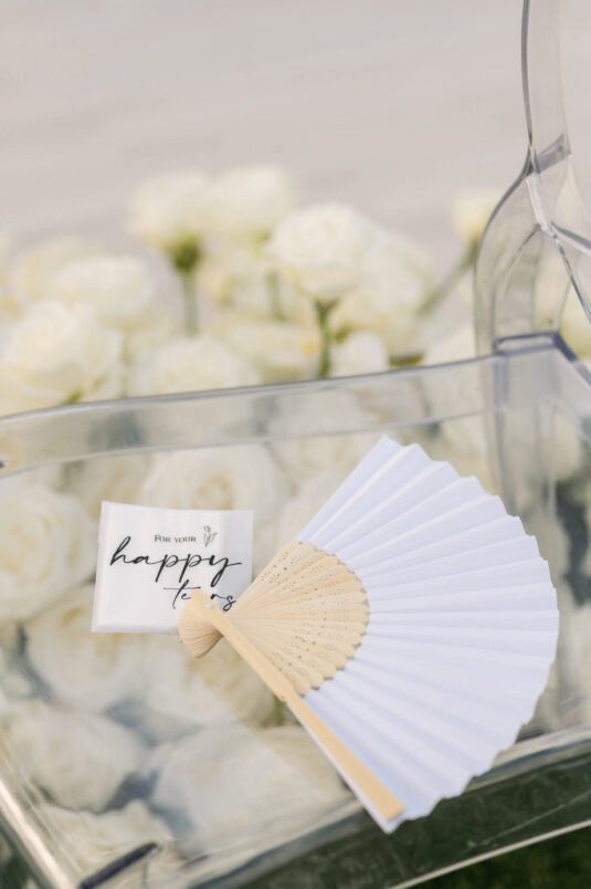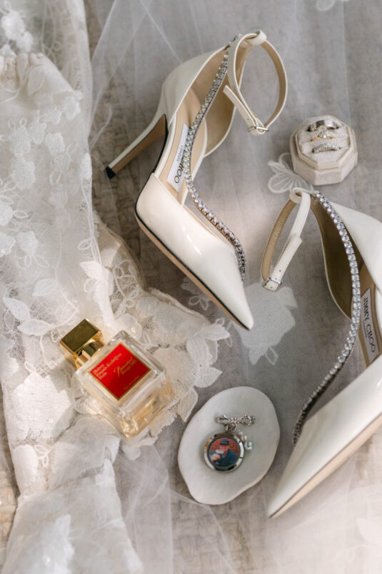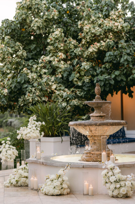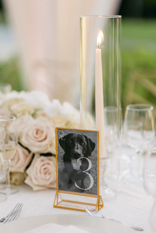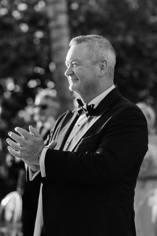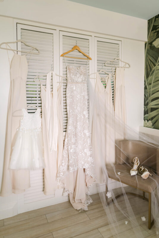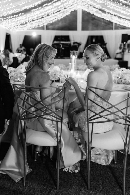 On the wedding day, Olivia prepared for her big moment surrounded by her mom and bridesmaids, slipping into a custom Mira Zwillinger gown that perfectly captured her personality and style. A heartfelt first look on the SLS grounds was followed by portraits across the golf course, complete with parasols and a soft island breeze. The ceremony on the Royal Blue Golf Club green was a vision of romance, lined with white florals and accompanied by live piano, culminating in a cocktail hour at the picturesque Water Tower. Dinner under a draped lawn tent featured soft blush and white florals, creating a dreamy, romantic atmosphere. As the sun set, the luxury destination wedding transitioned into a lively celebration, with the dance floor alive to music and a surprise Mamma Mia performance that had everyone on their feet.