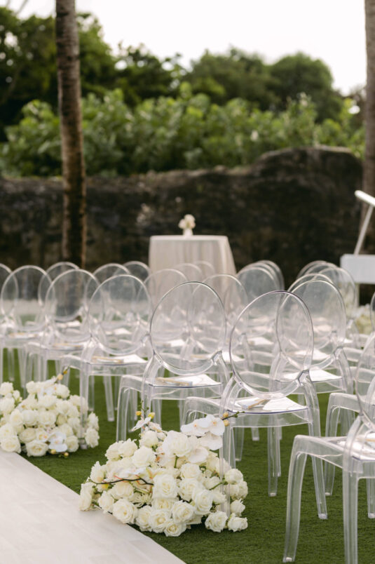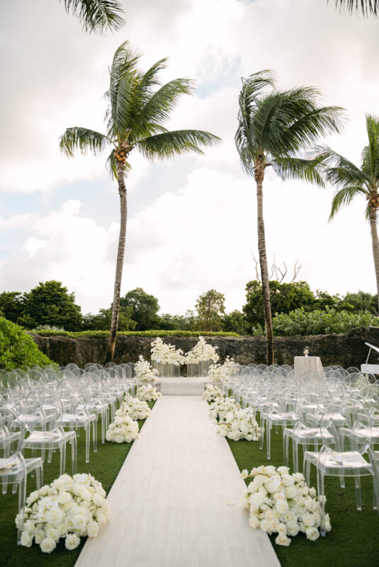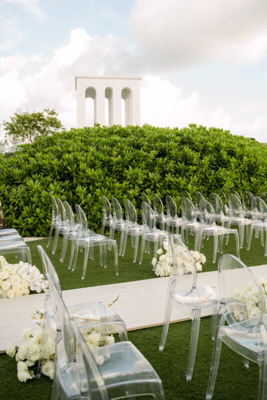 , enlisting Laura Atendido to bring their vision of a chic, elevated island celebration to life. The couple chose the exclusive enclave of the Royal Blue Golf Club and SLS Hotel within the Baha Mar complex, combining the best of intimate luxury with stunning Bahamian scenery. The festivities kicked off with a rooftop welcome party at SLS’s Skybar, where guests enjoyed cocktails against panoramic ocean views, setting a stylish and relaxed tone for the weekend ahead.