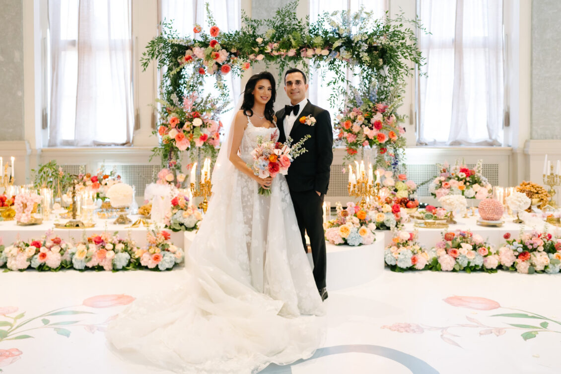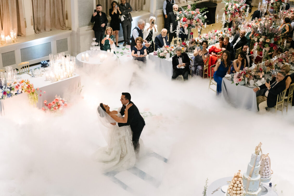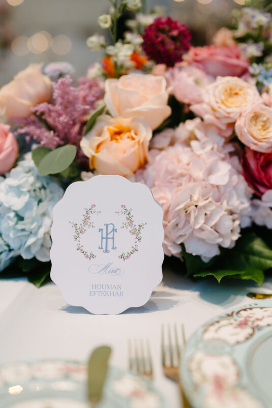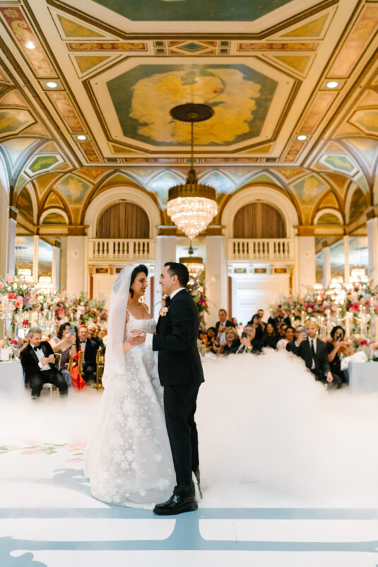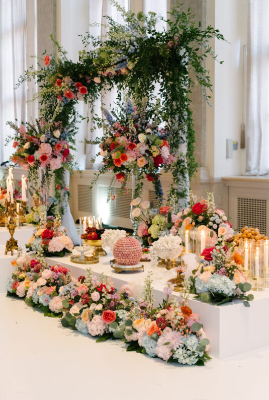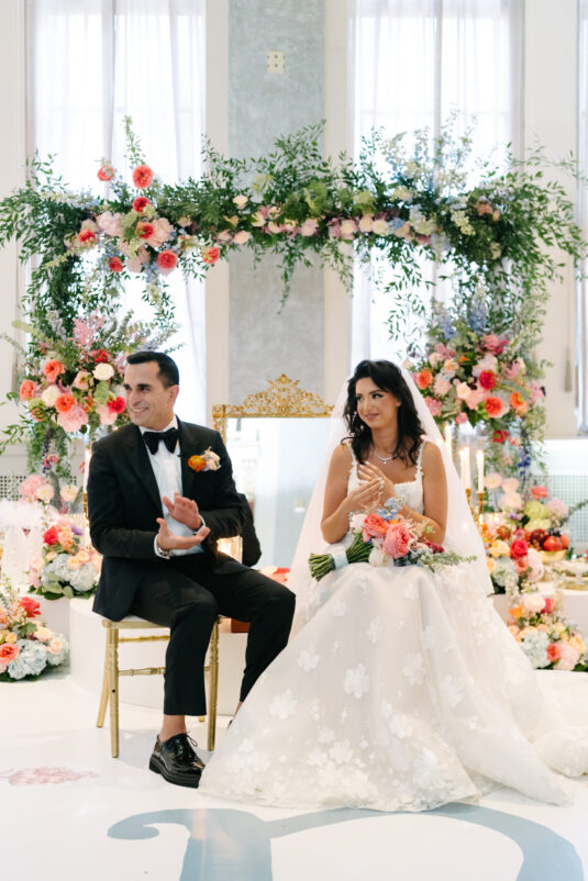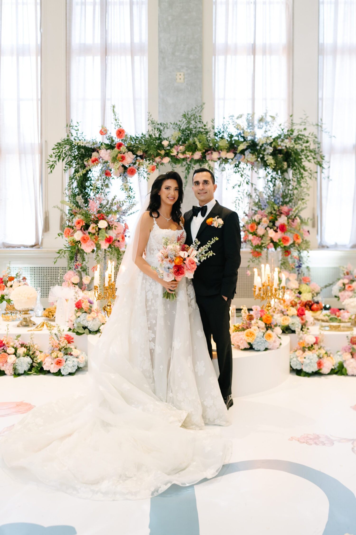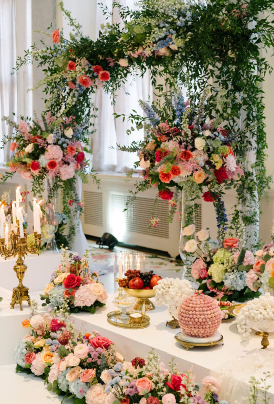 Designed by the bride in collaboration with her planner, the celebration blended Victorian elegance with couture-level glamour and nods to the couple’s Persian heritage. Guests were welcomed into a floral dreamscape, with hundreds of blooms flown in from the Netherlands cascading beneath the historic painted ceiling of the Royal York’s ballroom. Custom Victorian-inspired china, pastel-hued arrangements, and towering candelabras created a scene reminiscent of a European château, while a live violinist set an enchanting soundtrack for the ceremony. The couple’s sofreh aghd honored their cultural traditions, while a Persian tea station added an intimate and meaningful touch.