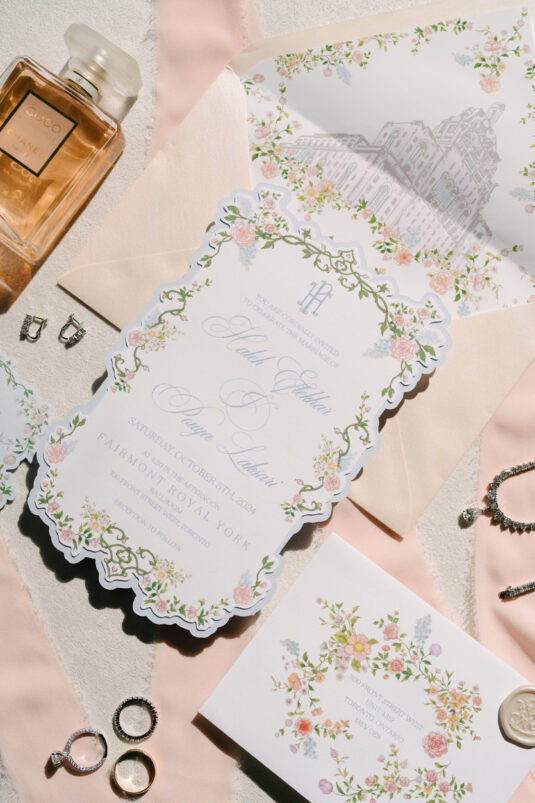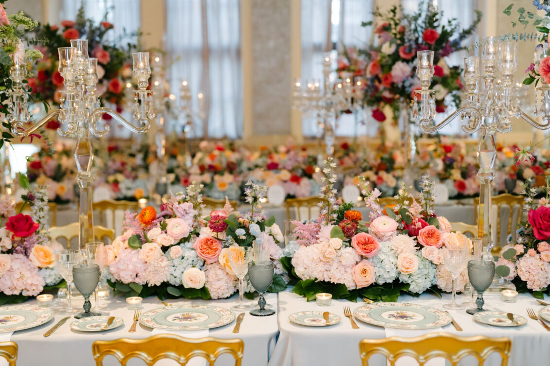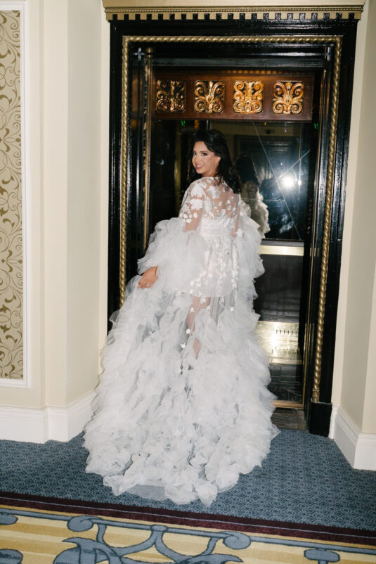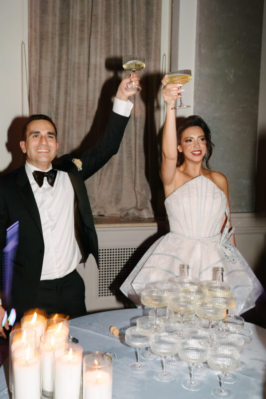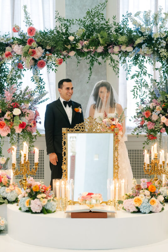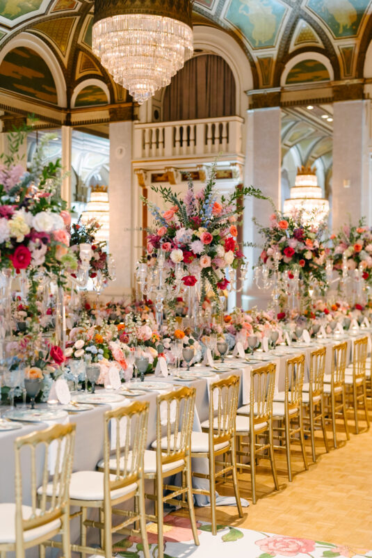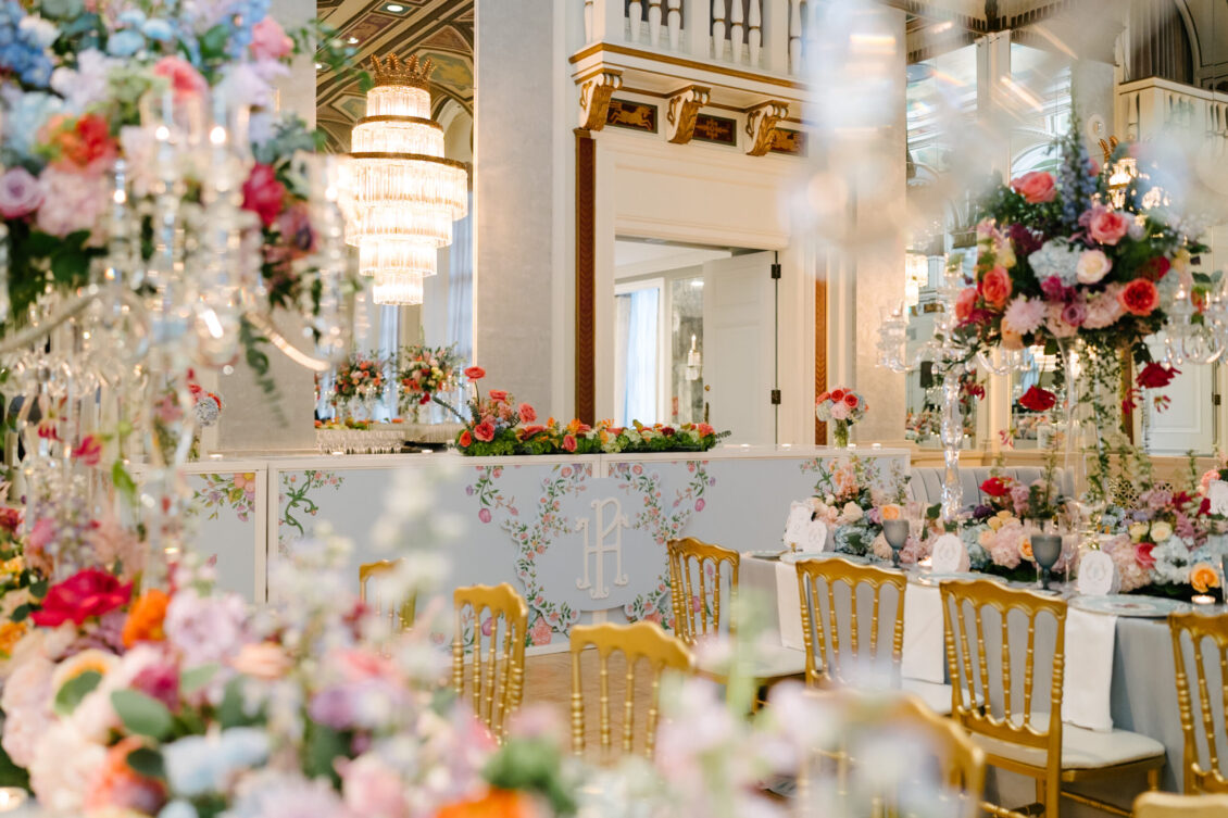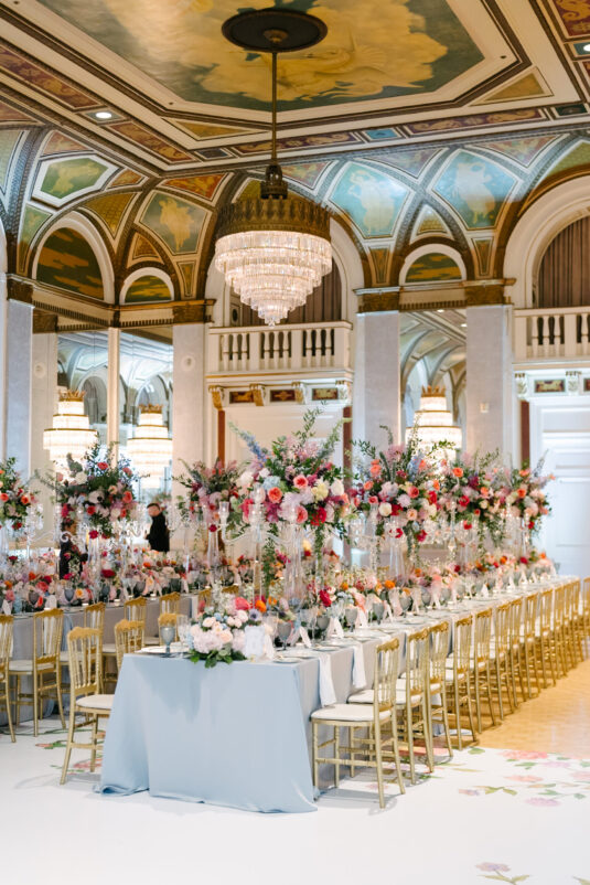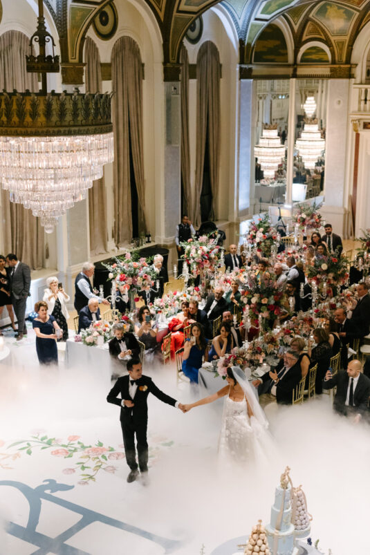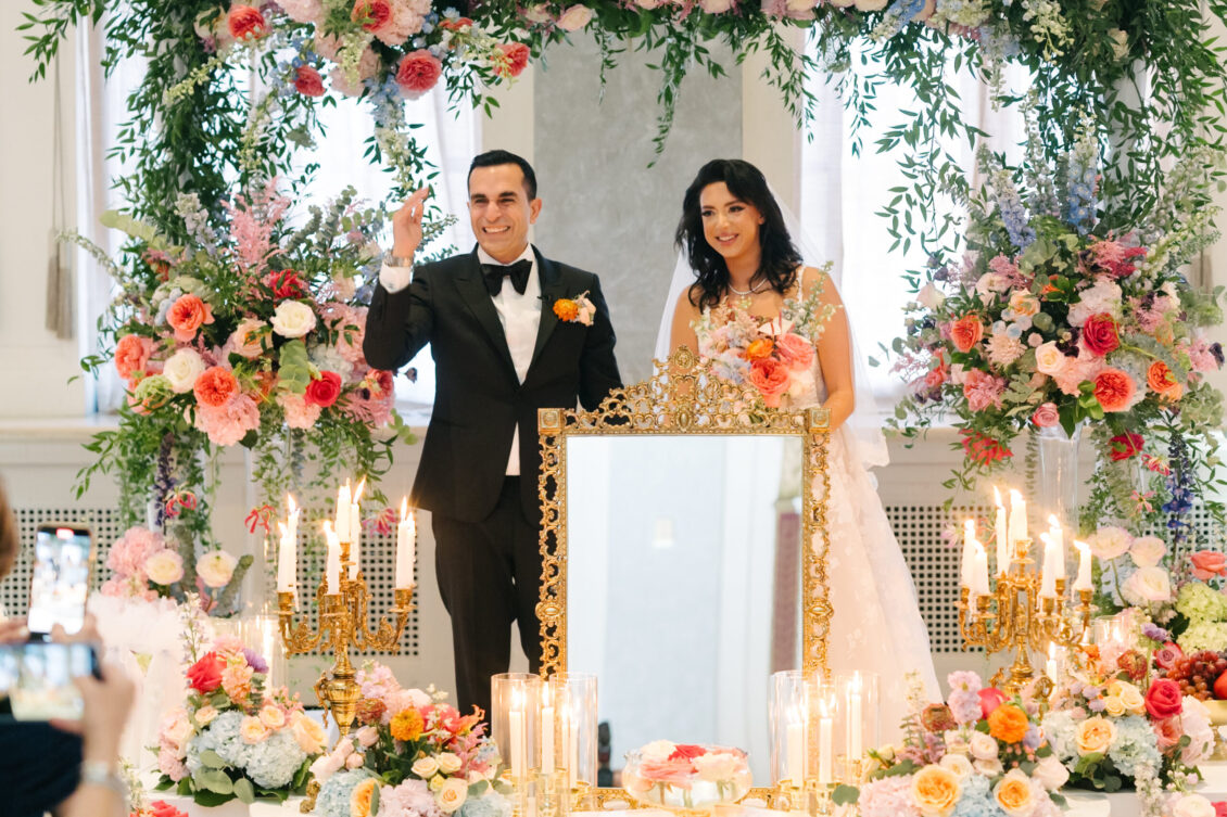 Designed by the bride in collaboration with her planner, the celebration blended Victorian elegance with couture-level glamour and nods to the couple’s Persian heritage. Guests were welcomed into a floral dreamscape, with hundreds of blooms flown in from the Netherlands cascading beneath the historic painted ceiling of the Royal York’s ballroom. Custom Victorian-inspired china, pastel-hued arrangements, and towering candelabras created a scene reminiscent of a European château, while a live violinist set an enchanting soundtrack for the ceremony. The couple’s sofreh aghd honored their cultural traditions, while a Persian tea station added an intimate and meaningful touch.