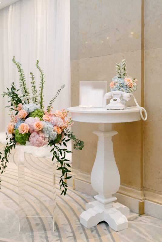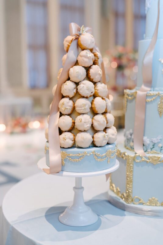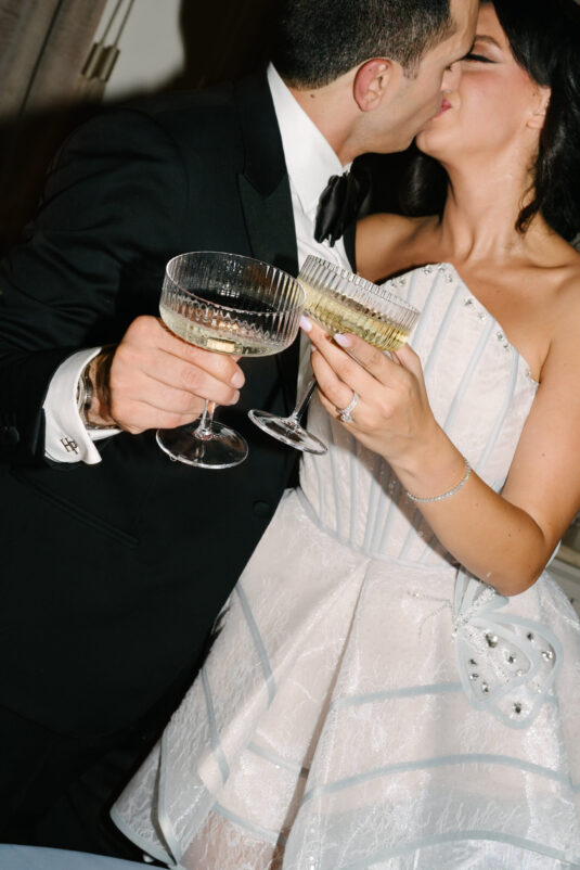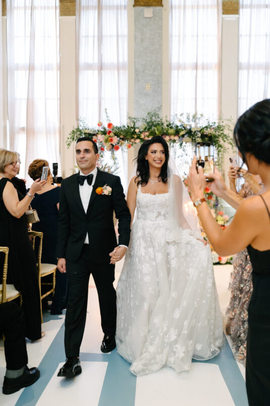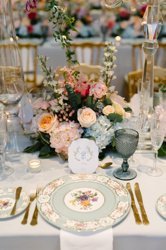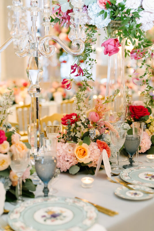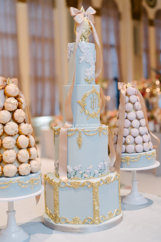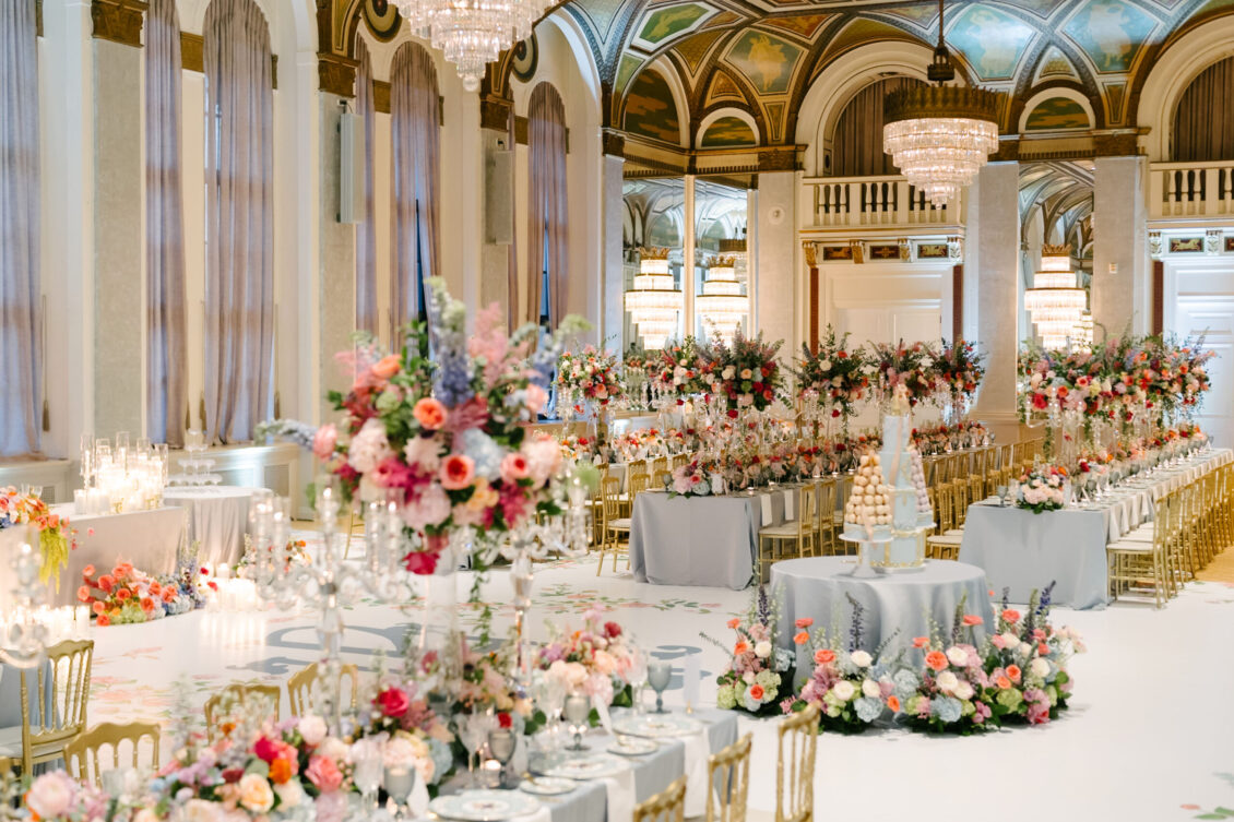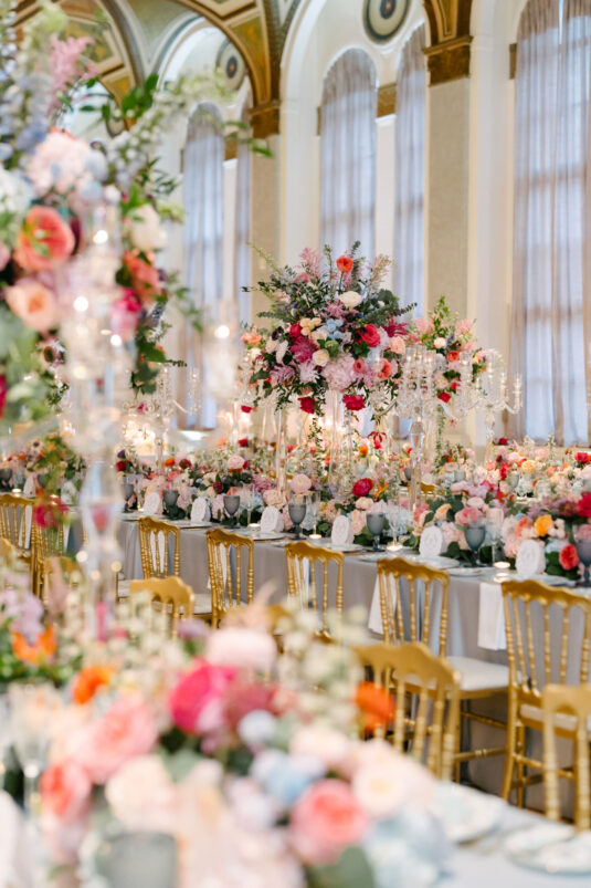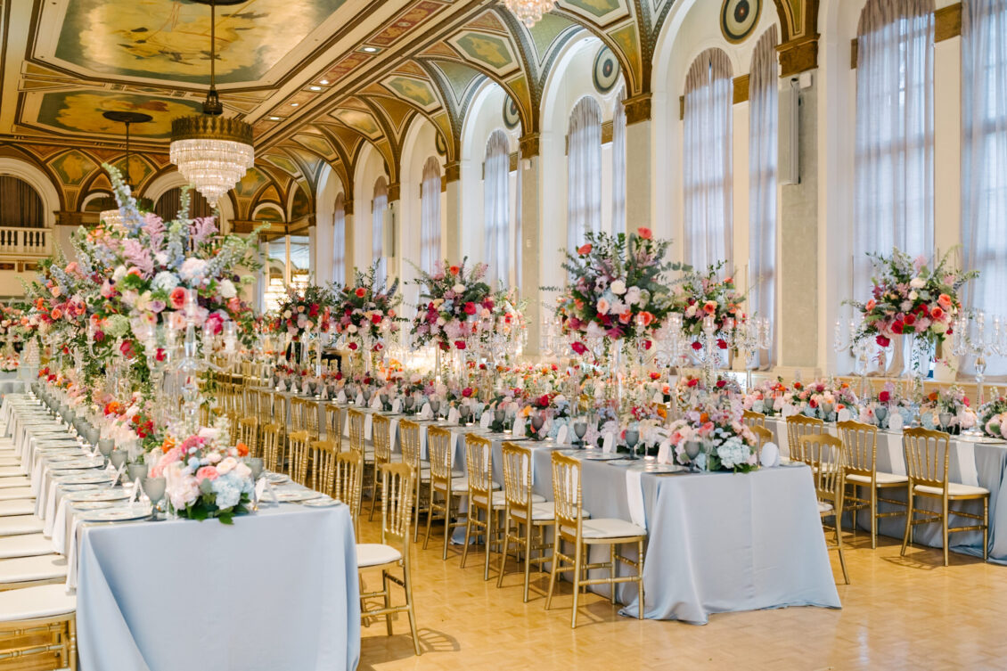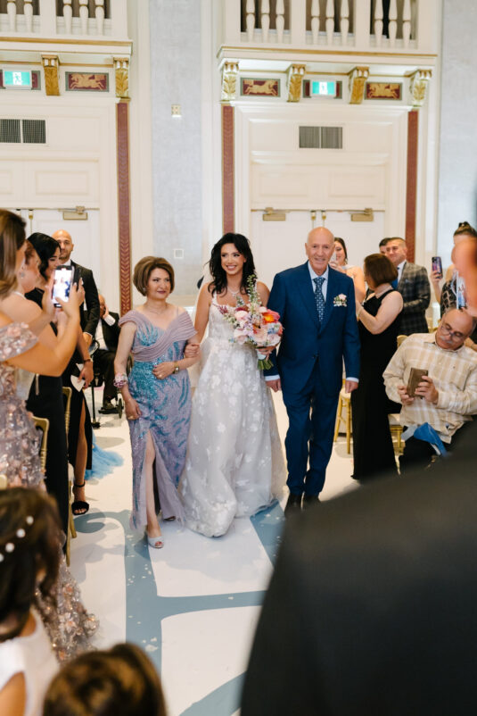 Designed by the bride in collaboration with her planner, the celebration blended Victorian elegance with couture-level glamour and nods to the couple’s Persian heritage. Guests were welcomed into a floral dreamscape, with hundreds of blooms flown in from the Netherlands cascading beneath the historic painted ceiling of the Royal York’s ballroom. Custom Victorian-inspired china, pastel-hued arrangements, and towering candelabras created a scene reminiscent of a European château, while a live violinist set an enchanting soundtrack for the ceremony. The couple’s sofreh aghd honored their cultural traditions, while a Persian tea station added an intimate and meaningful touch.