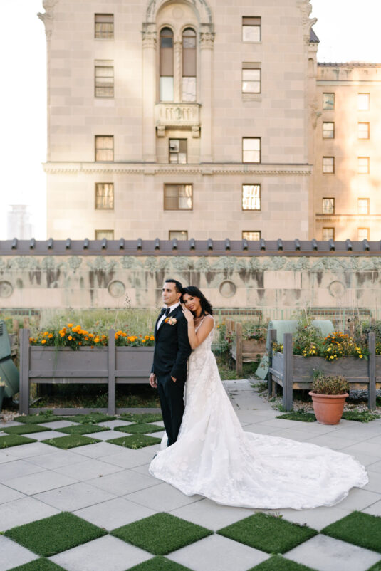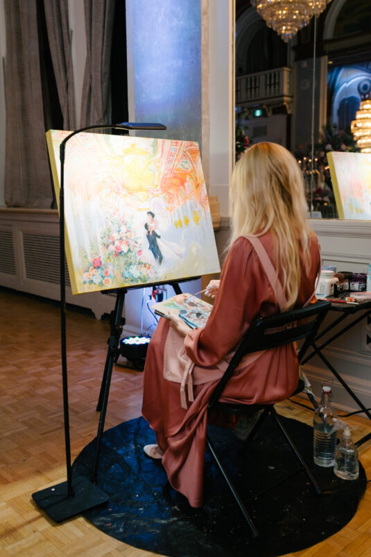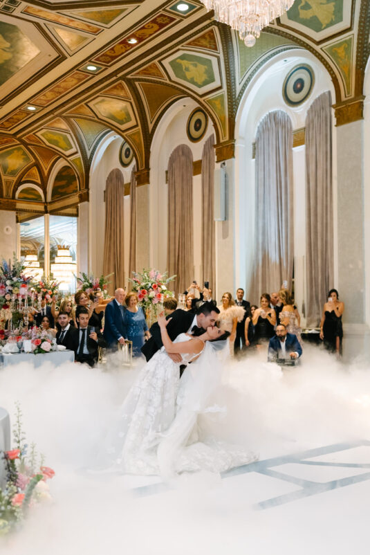 The bride wore a floral embroidered gown paired with a custom veil shipped from Ukraine, later changing into a second, playful princess-style dress for the reception. A surprise live drummer ignited the dance floor, while thoughtful touches like satin-tied ballet flats for guests ensured everyone could celebrate in comfort. From a cinematic first dance to “Die With a Smile,” to a live painter capturing the magic on canvas, every detail of this Fairmont Royal York wedding felt intentional, soulful, and unforgettable. In a final gesture of love, the couple donated their florals to local retirement homes and shelters, extending the joy far beyond the ballroom.