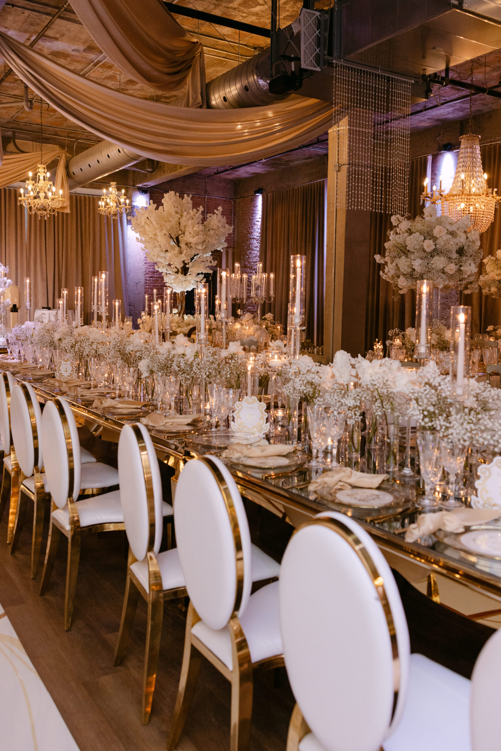 Elegant banquet hall at Espace Gare Viger with a long dining table set for an opulent wedding, featuring gold and white chairs, tall candles, glassware, floral centerpieces, chandeliers, and gold drapery for a luxurious Montreal wedding atmosphere.