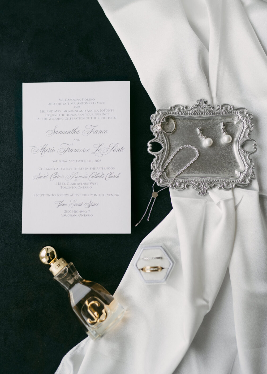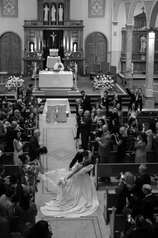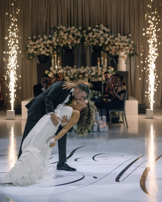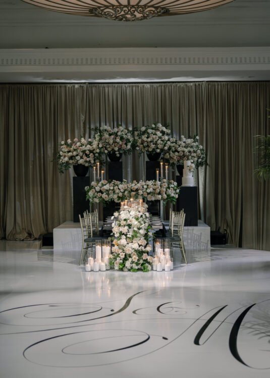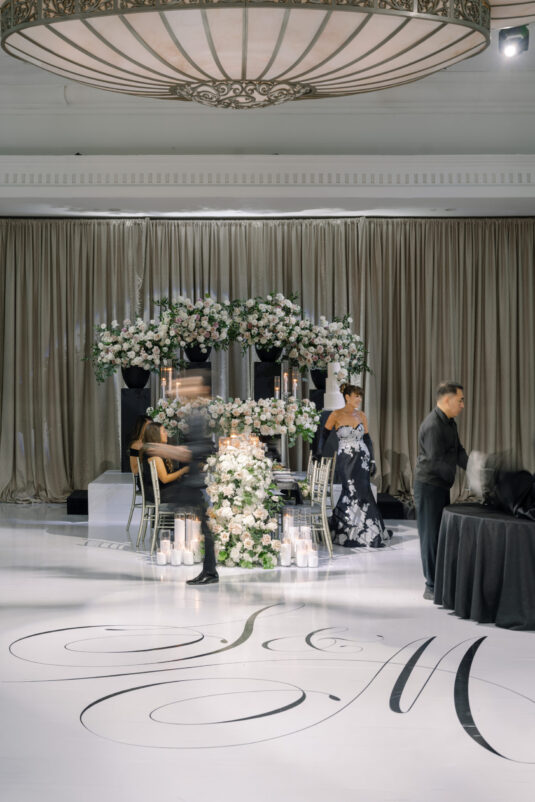 Every moment of this romantic and modern Toronto ballroom wedding was layered with intention and personal storytelling. Samantha made a breathtaking entrance into the church to the sound of a live violinist playing from above, a cinematic moment that set the tone for the day. The celebration unfolded with bespoke details including a custom monogrammed dance floor, dramatic fire elements during the first dance, and a grand late-night Italian feast complete with porchetta, Brio Italian sodas, and a decadent pastry tower.