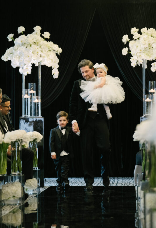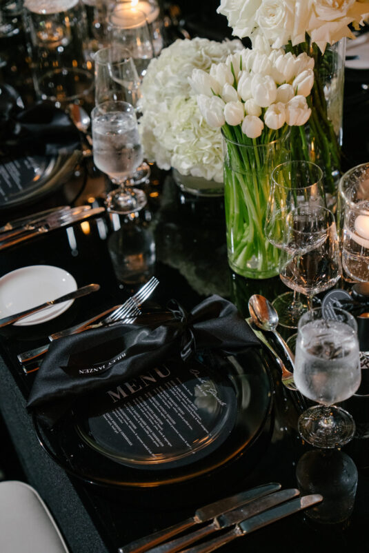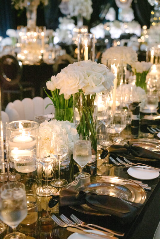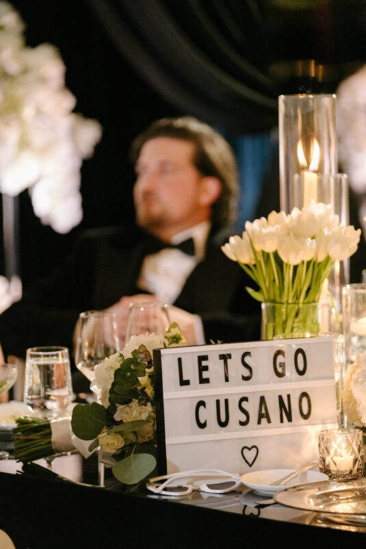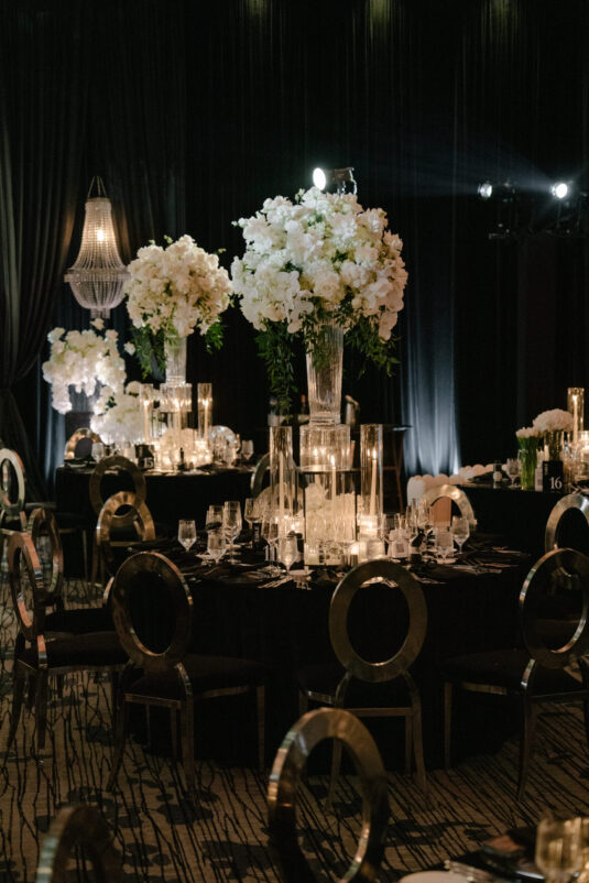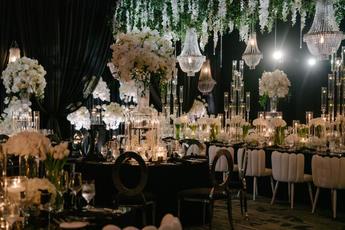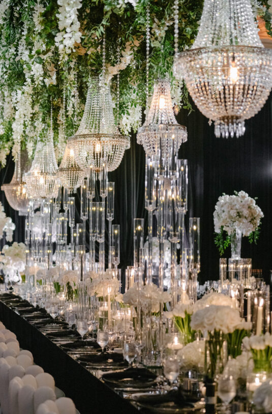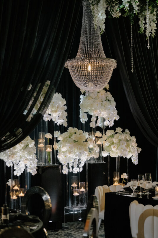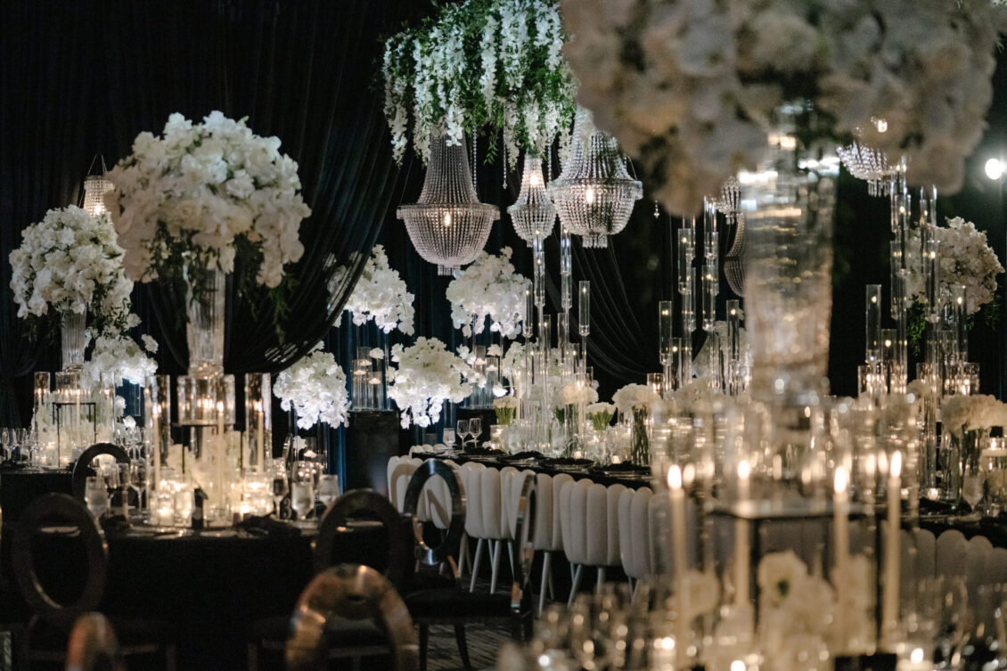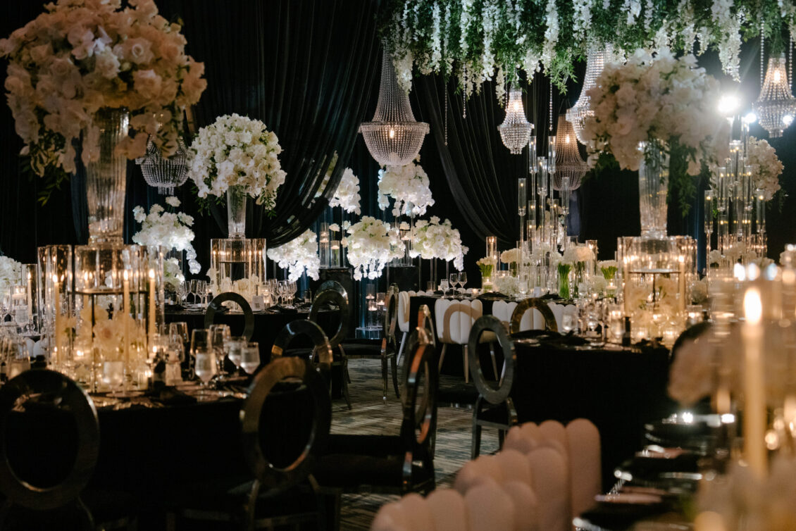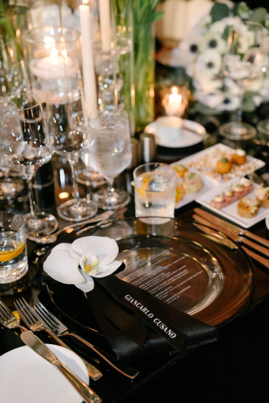 For the reception, the ballroom was reimagined as a dramatic black-draped haven—a design concept that merged timeless romance with contemporary sophistication. Lush ceiling greenery, floating crystals, and soft candlelight framed a seven-course dinner that reflected Daniela and Giancarlo’s shared love for fine dining. Each guest’s name appeared on a silk ribbon tied in a perfect bow, a small but exquisite detail that spoke volumes about the couple’s attention to elegance.