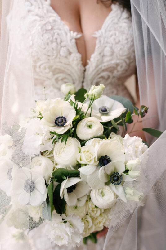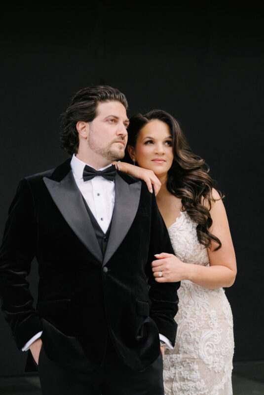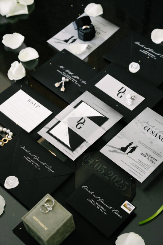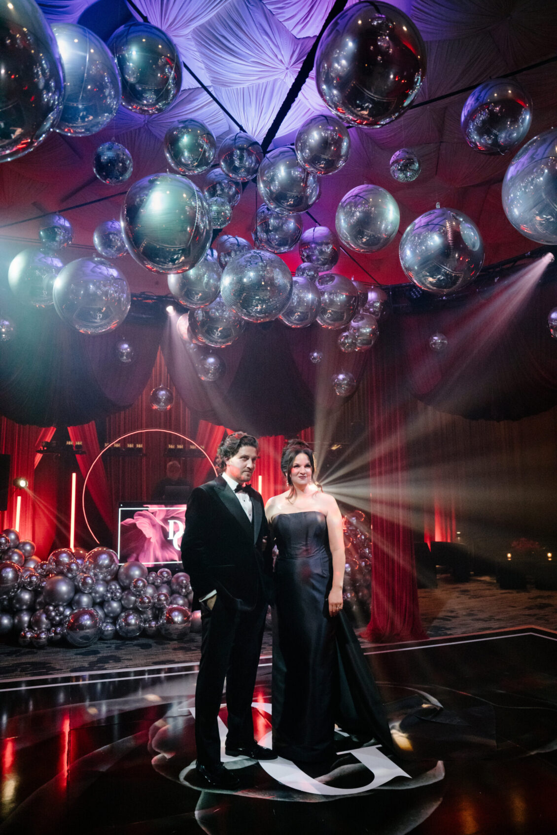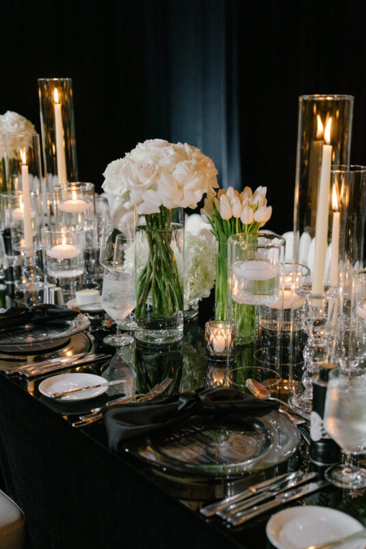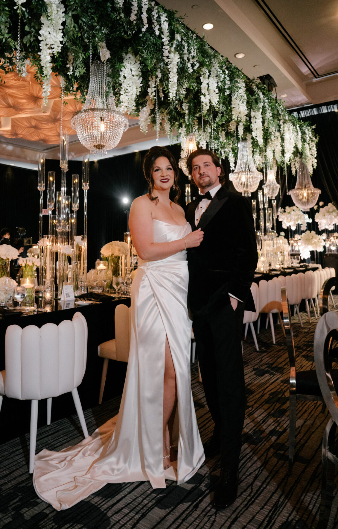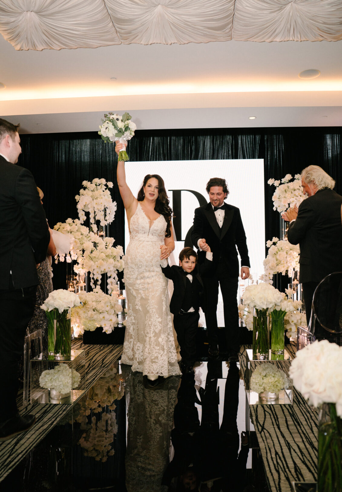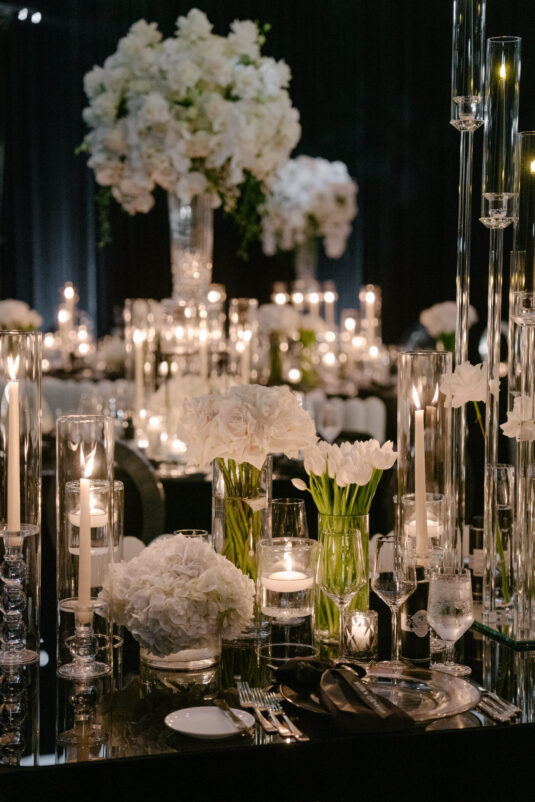 For the reception, the ballroom was reimagined as a dramatic black-draped haven—a design concept that merged timeless romance with contemporary sophistication. Lush ceiling greenery, floating crystals, and soft candlelight framed a seven-course dinner that reflected Daniela and Giancarlo’s shared love for fine dining. Each guest’s name appeared on a silk ribbon tied in a perfect bow, a small but exquisite detail that spoke volumes about the couple’s attention to elegance.