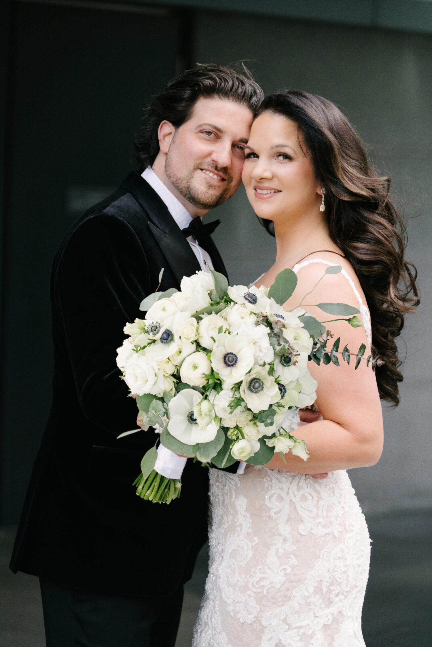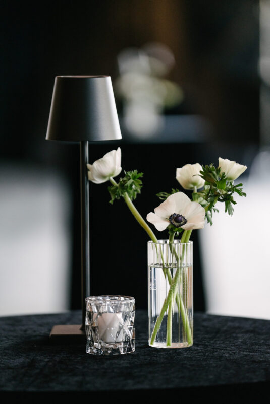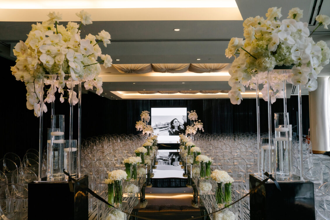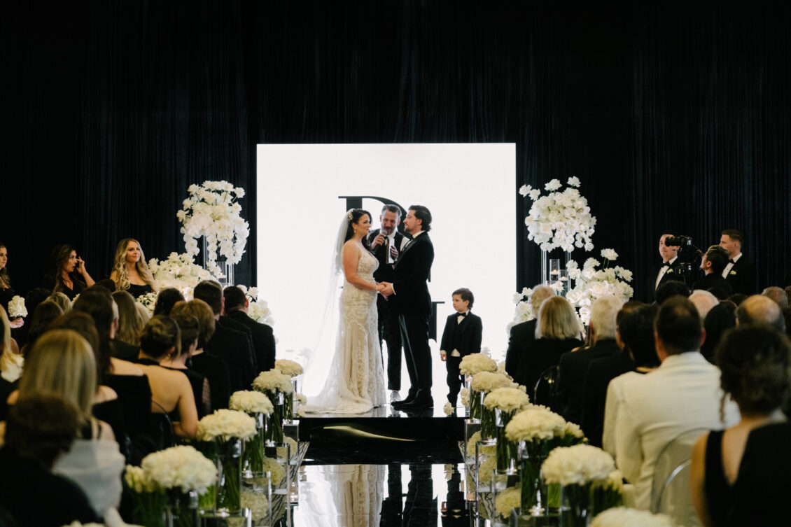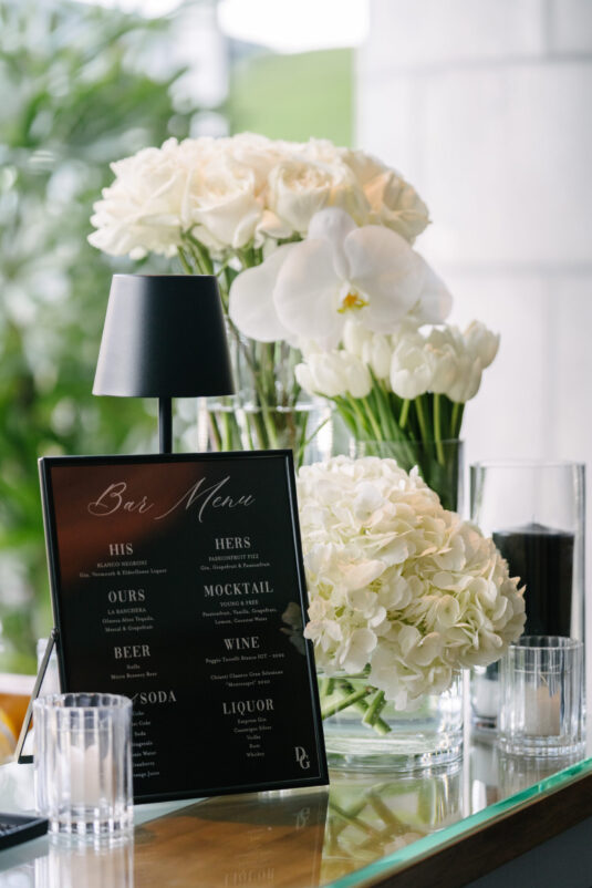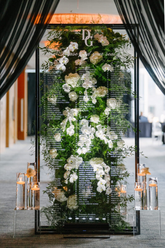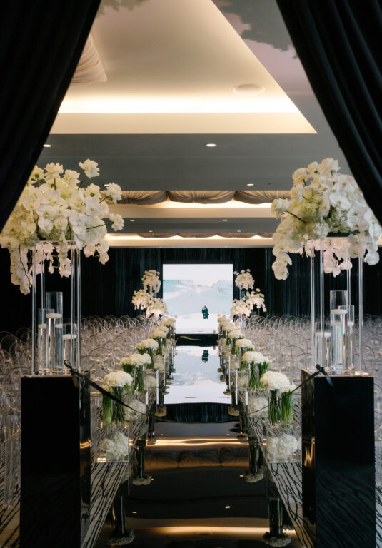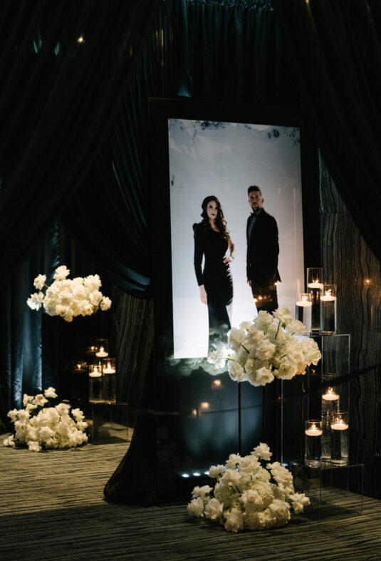 The day began in a candlelit ceremony space where their helicopter-mountaintop engagement video set the emotional tone. As Daniela made her grand entrance, guests watched the love story unfold on screen before witnessing the couple exchange heartfelt vows beneath a canopy of cascading orchids and spring tulips. The celebration continued with cocktails and canapés in a modern lounge foyer, complete with curated vignettes, a portrait booth, and an audio guestbook that encouraged guests to share personalized messages.