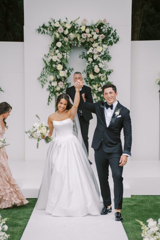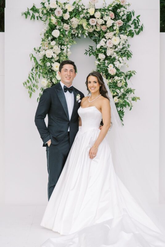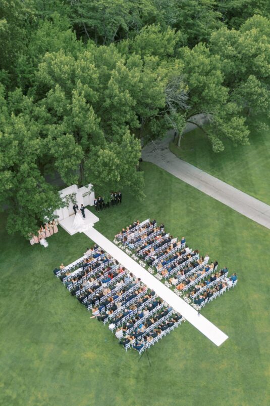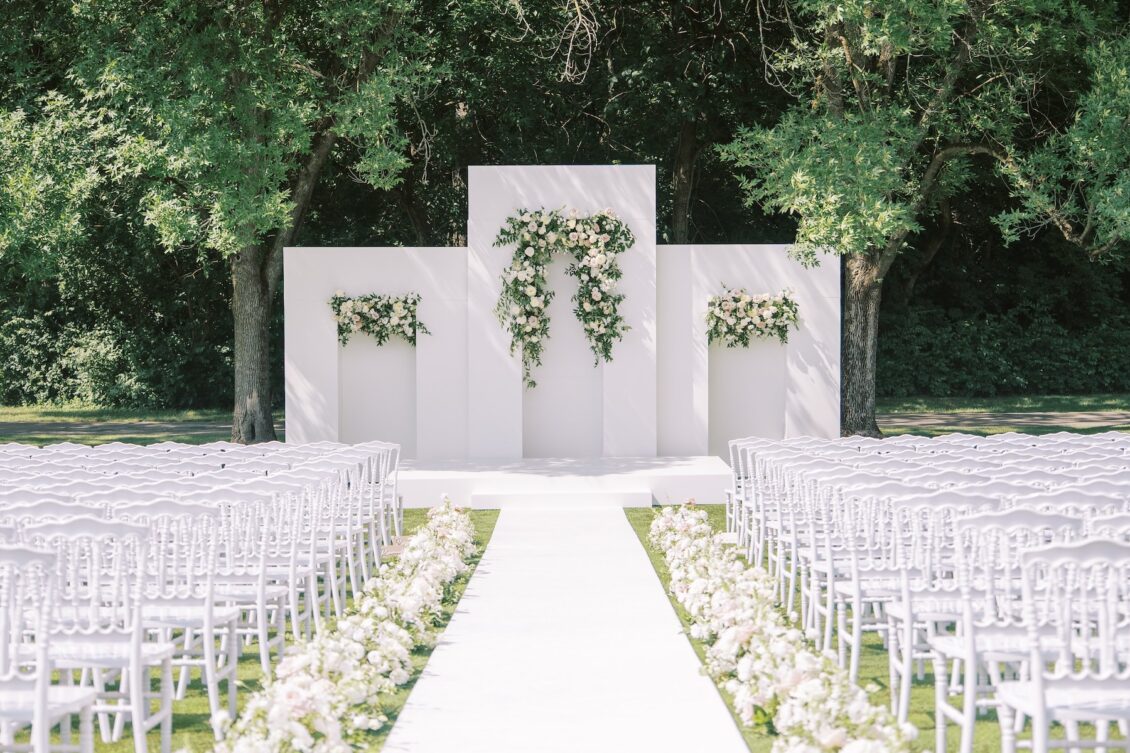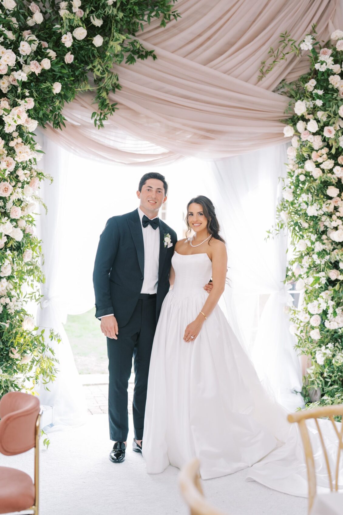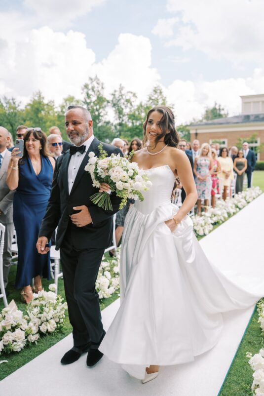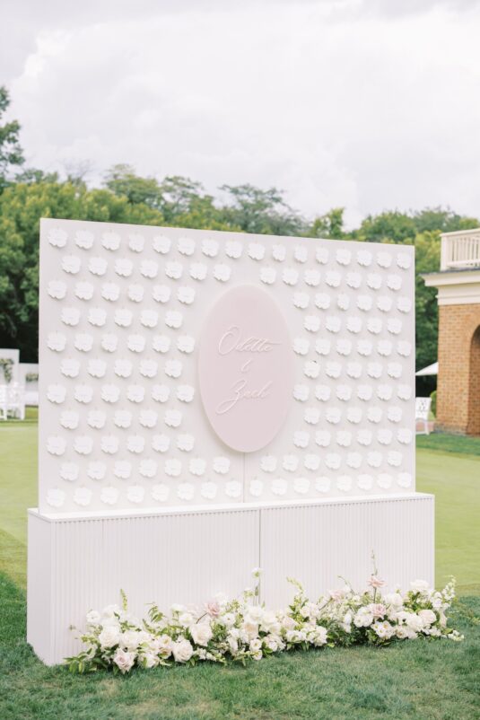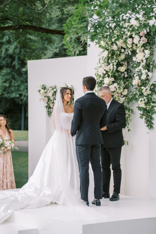 The couple turned to MMJ Events to bring their shared vision of “timeless elegance” to life – an aesthetic that would look as striking in fifty years as it does today. Set against the manicured lawns and stately architecture of the New Albany Country Club, the celebration unfolded beneath clear skies and soft light, a stroke of luck given the day’s unpredictable forecast. Guests gathered on the golf course lawn, where arched floral walls framed the ceremony and a world-class violinist serenaded the bride’s walk down the aisle. Odette, radiant in a Roma Sposa gown, epitomized modern fairy-tale grace.