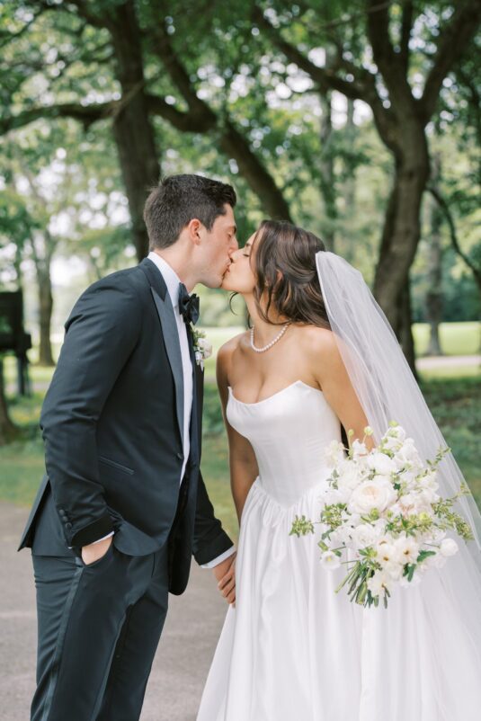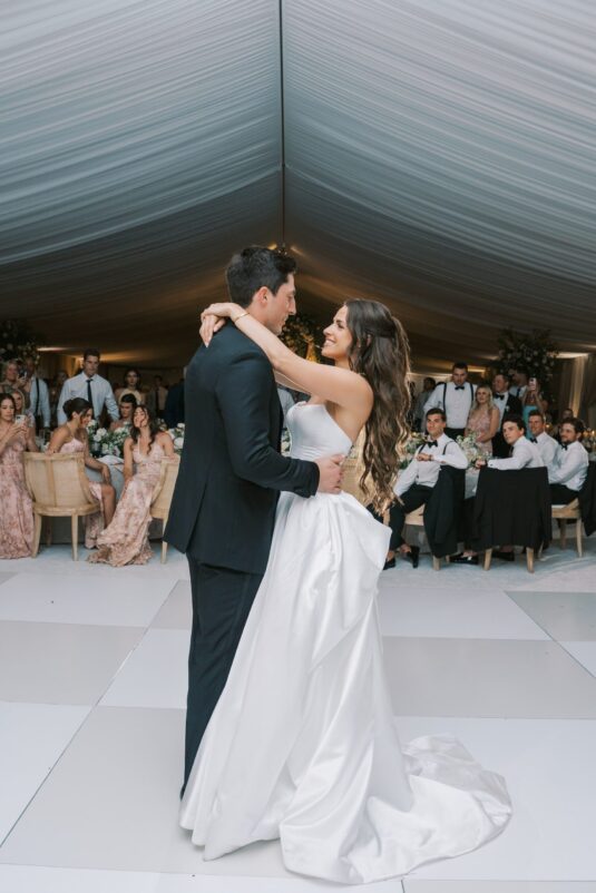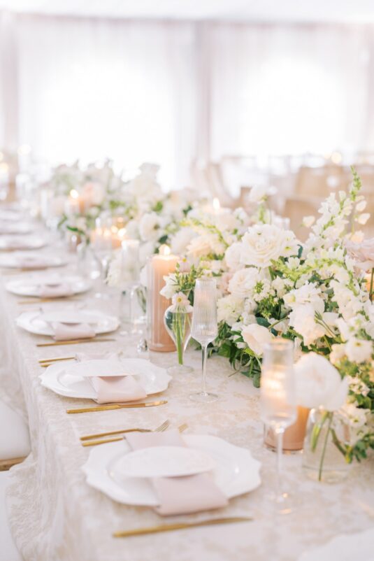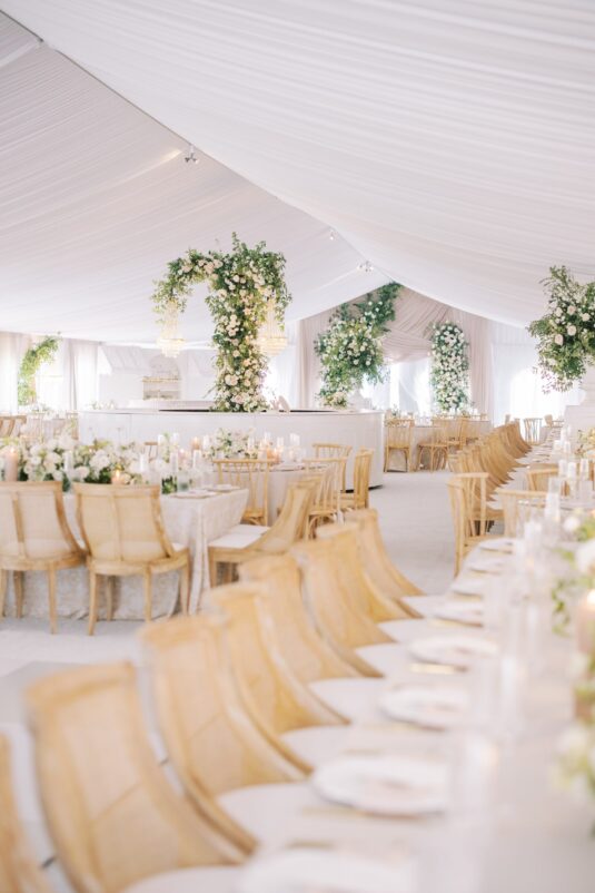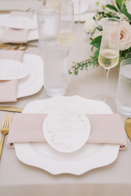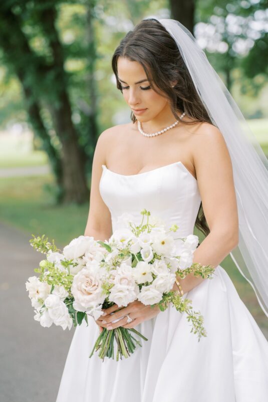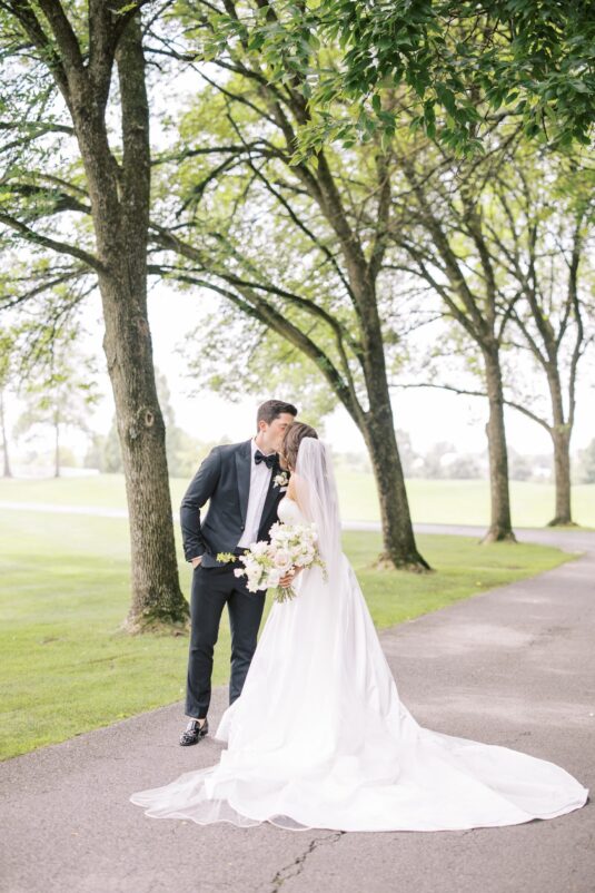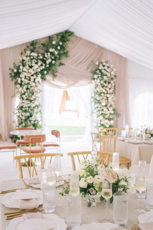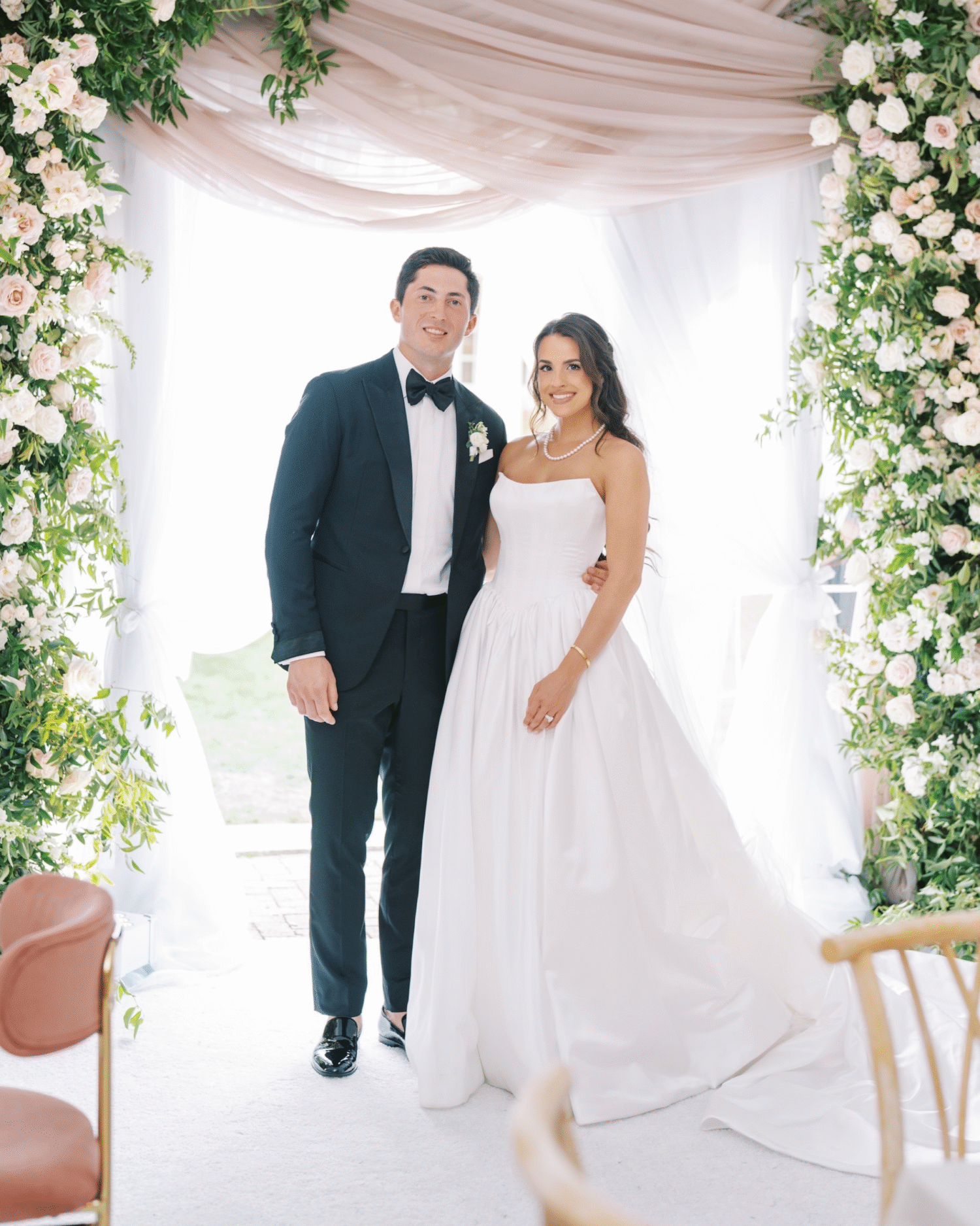 The couple turned to MMJ Events to bring their shared vision of “timeless elegance” to life – an aesthetic that would look as striking in fifty years as it does today. Set against the manicured lawns and stately architecture of the New Albany Country Club, the celebration unfolded beneath clear skies and soft light, a stroke of luck given the day’s unpredictable forecast. Guests gathered on the golf course lawn, where arched floral walls framed the ceremony and a world-class violinist serenaded the bride’s walk down the aisle. Odette, radiant in a Roma Sposa gown, epitomized modern fairy-tale grace.