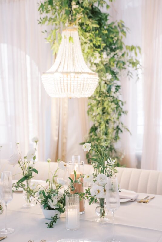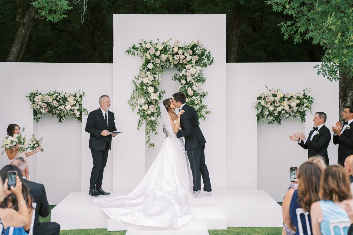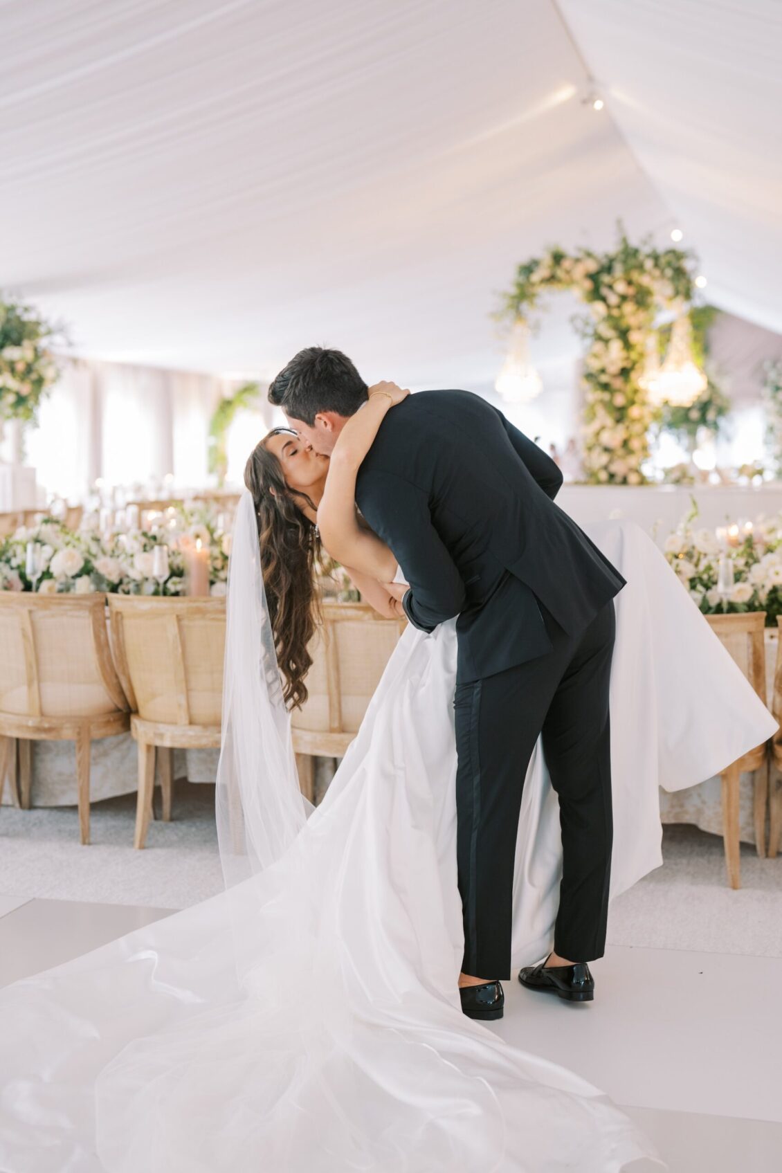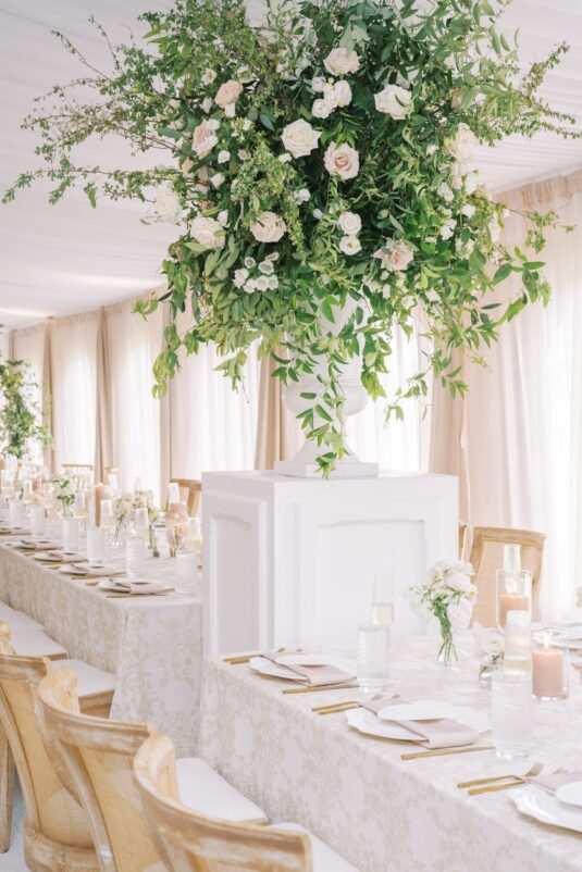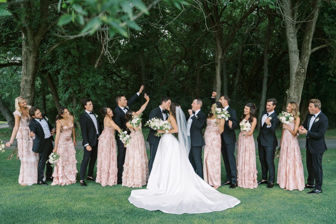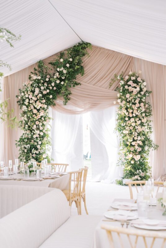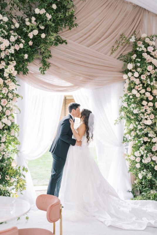 The couple turned to MMJ Events to bring their shared vision of “timeless elegance” to life – an aesthetic that would look as striking in fifty years as it does today. Set against the manicured lawns and stately architecture of the New Albany Country Club, the celebration unfolded beneath clear skies and soft light, a stroke of luck given the day’s unpredictable forecast. Guests gathered on the golf course lawn, where arched floral walls framed the ceremony and a world-class violinist serenaded the bride’s walk down the aisle. Odette, radiant in a Roma Sposa gown, epitomized modern fairy-tale grace.