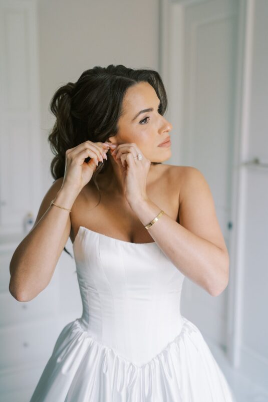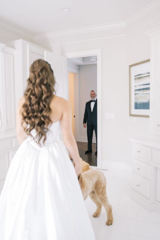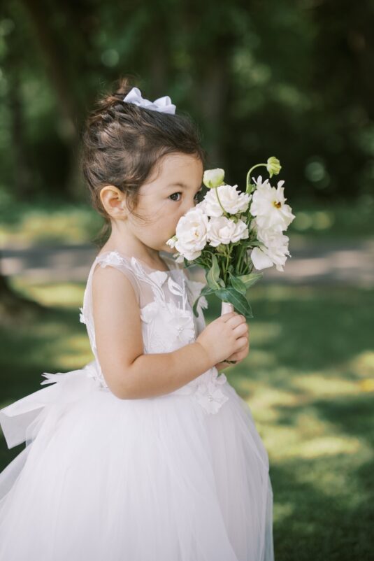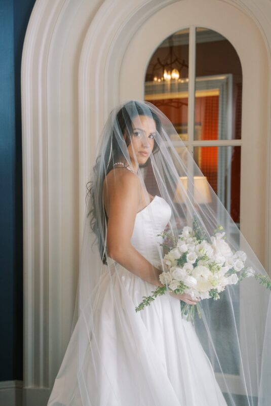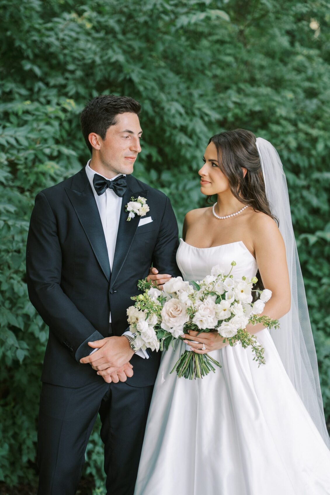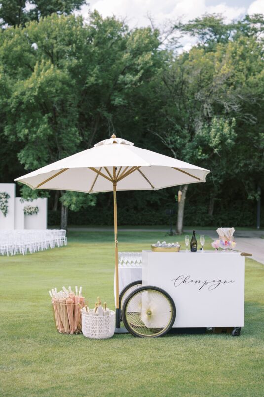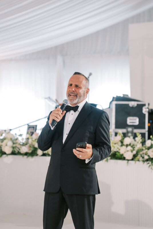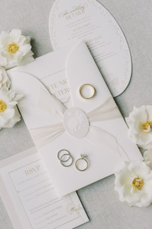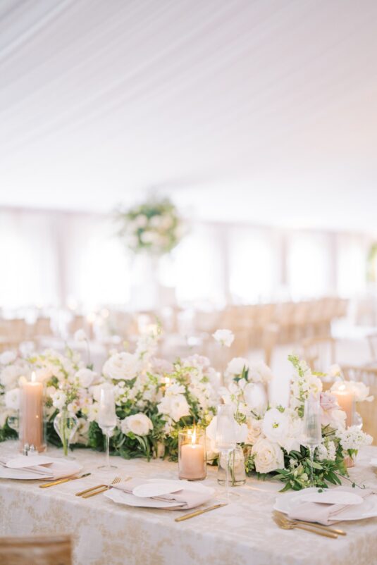 The couple turned to MMJ Events to bring their shared vision of “timeless elegance” to life – an aesthetic that would look as striking in fifty years as it does today. Set against the manicured lawns and stately architecture of the New Albany Country Club, the celebration unfolded beneath clear skies and soft light, a stroke of luck given the day’s unpredictable forecast. Guests gathered on the golf course lawn, where arched floral walls framed the ceremony and a world-class violinist serenaded the bride’s walk down the aisle. Odette, radiant in a Roma Sposa gown, epitomized modern fairy-tale grace.