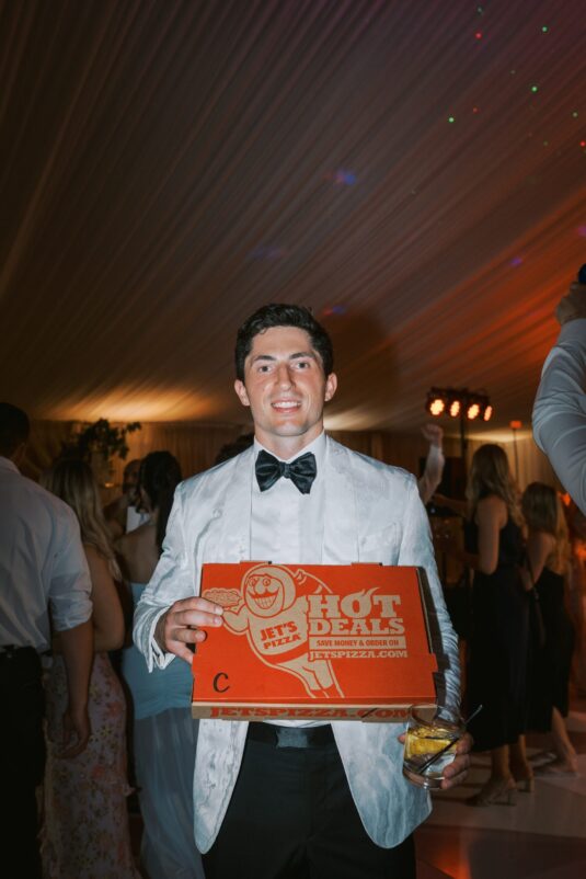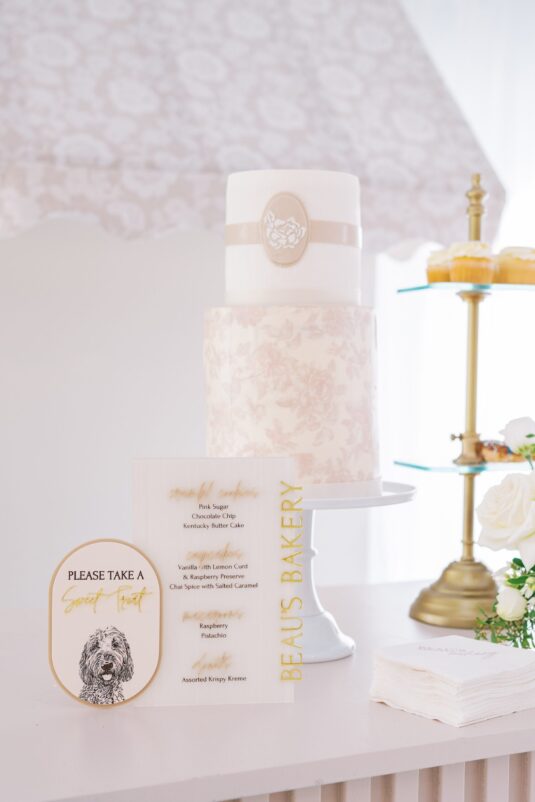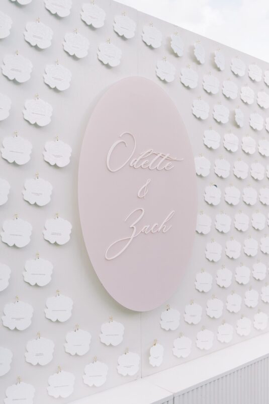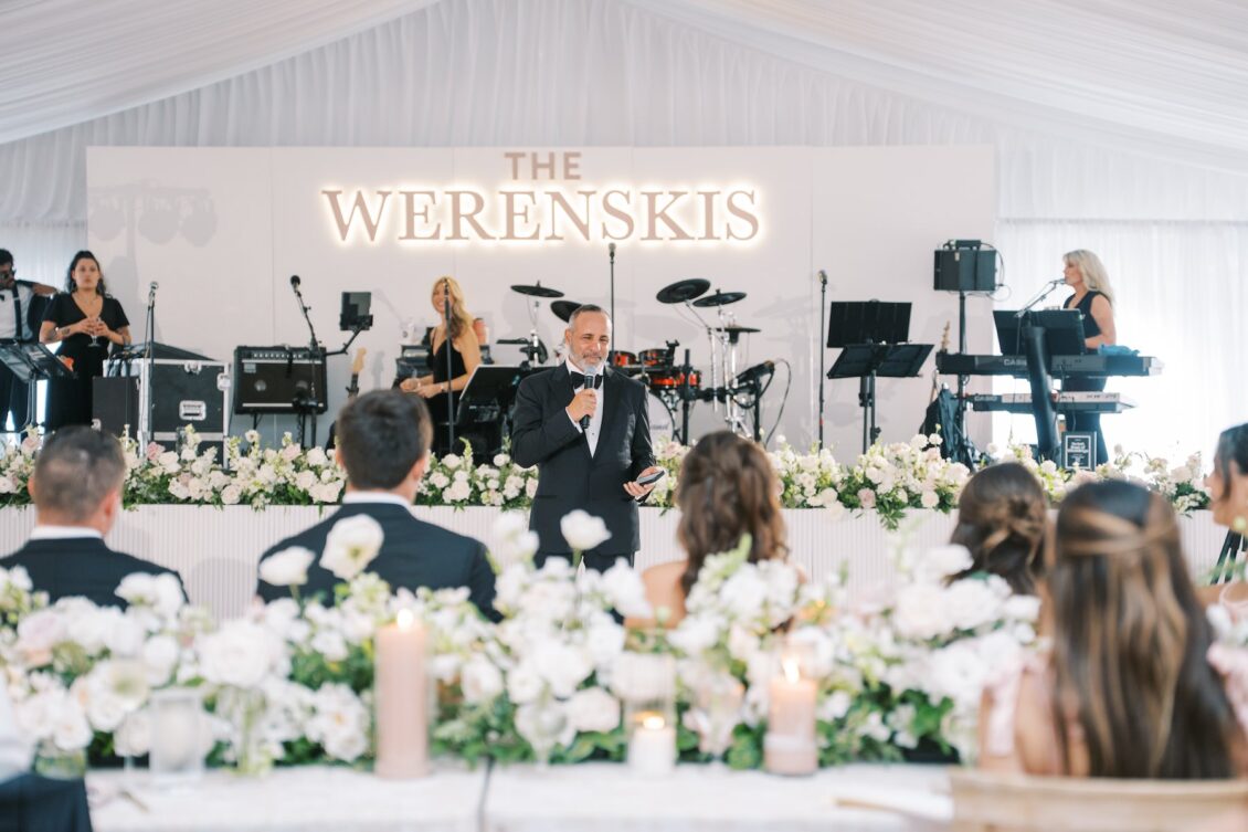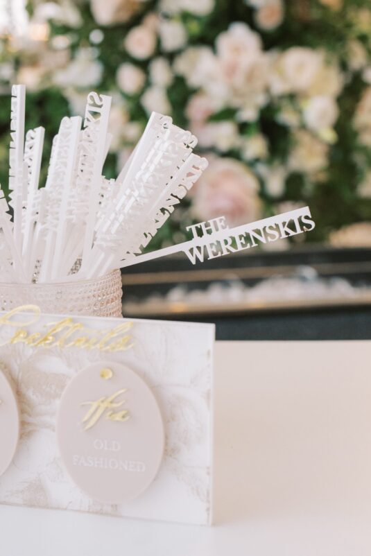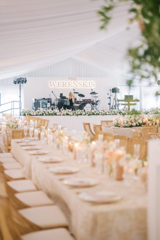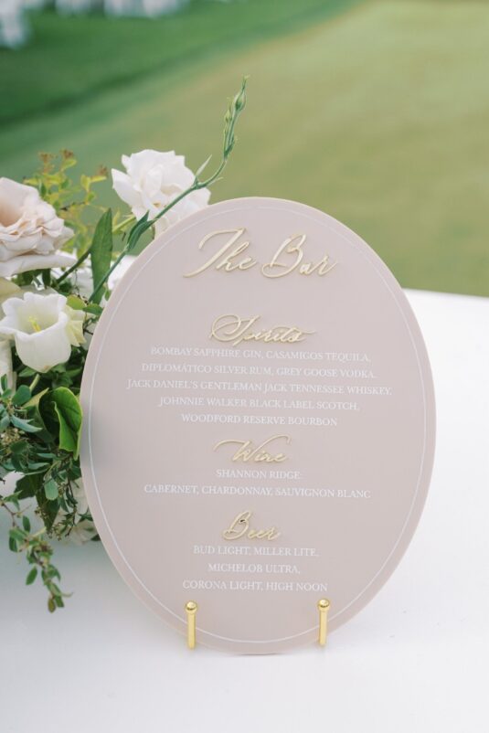 Post-ceremony, the celebration moved up the grand staircase for cocktails overlooking the course. Every vignette – custom bars, engraved acrylic roses, and fluted escort displays – reflected a thoughtful continuity of design, echoing the couple’s invitation suite. The tented reception channeled warmth and grandeur in equal measure: oak chairs, banquettes, lush florals, candlelight, and a bespoke chandelier installation that illuminated a circular bar anchoring the space. For dessert, guests delighted in Beau’s Bakery, a whimsical homage to the couple’s golden doodle, before the night crescendoed with a live hometown band, Jet’s Pizza late-night bites, and a checkered dance floor beneath a glowing “The Werenski’s” sign.