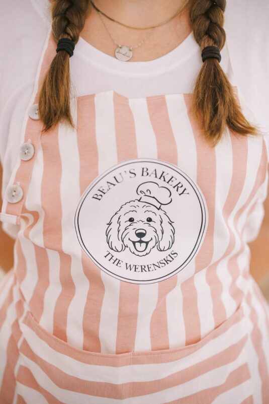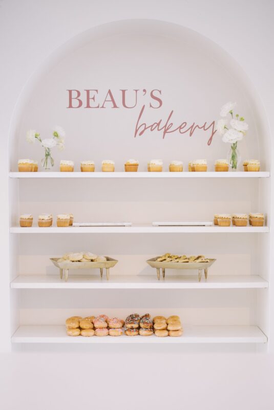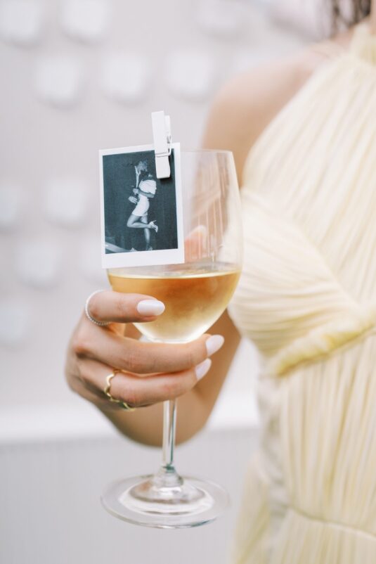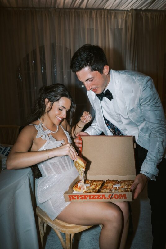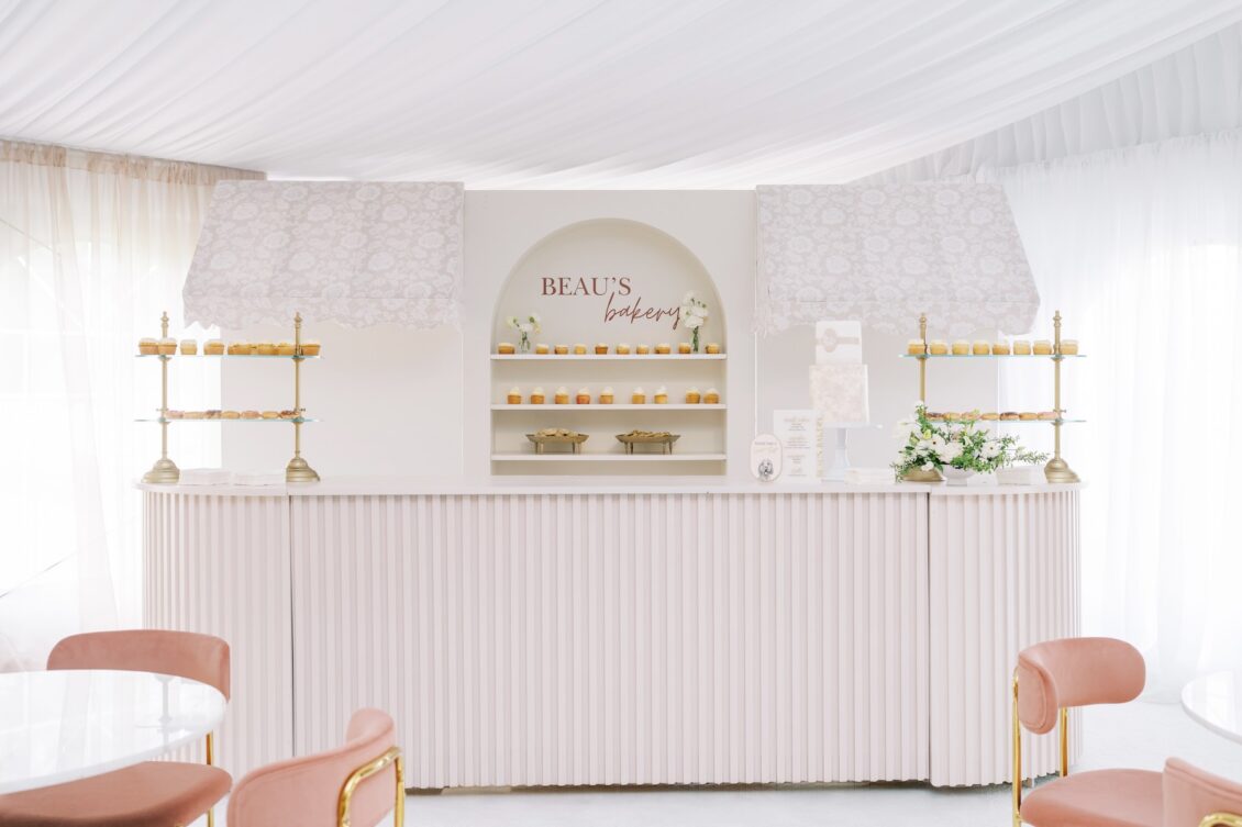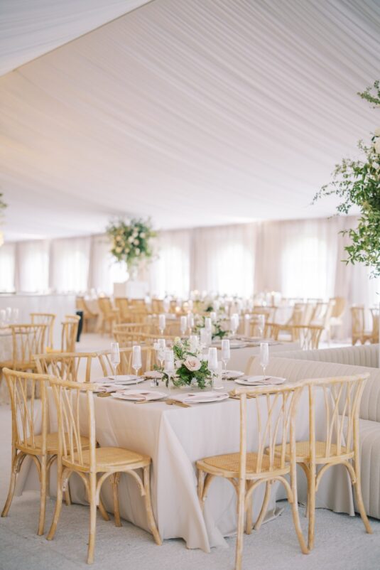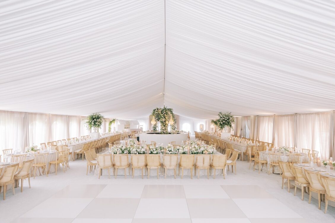 Post-ceremony, the celebration moved up the grand staircase for cocktails overlooking the course. Every vignette – custom bars, engraved acrylic roses, and fluted escort displays – reflected a thoughtful continuity of design, echoing the couple’s invitation suite. The tented reception channeled warmth and grandeur in equal measure: oak chairs, banquettes, lush florals, candlelight, and a bespoke chandelier installation that illuminated a circular bar anchoring the space. For dessert, guests delighted in Beau’s Bakery, a whimsical homage to the couple’s golden doodle, before the night crescendoed with a live hometown band, Jet’s Pizza late-night bites, and a checkered dance floor beneath a glowing “The Werenski’s” sign.