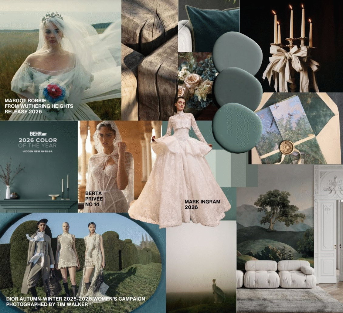 The upcoming 2026 film adaptation of Wuthering Heights by Emerald Fennell, starring Margot Robbie and Jacob Elordi, is set to reignite a wave of Brontë-inspired, gothic-romantic influence. Expect to see design trends echoing the windswept Yorkshire moors—stormy passion expressed through weathered woods, stone walls, and mist-draped landscapes. Fashion will follow suit with Basque waists, dramatic ballgowns, and romantic bows making a striking return. A moody palette of “Hidden Gem” (Behr’s 2026 Color of the Year), weathered greys, muted jade, deep teal, and landscape green will define this evocative aesthetic, blending nature’s untamed beauty with dark romanticism.