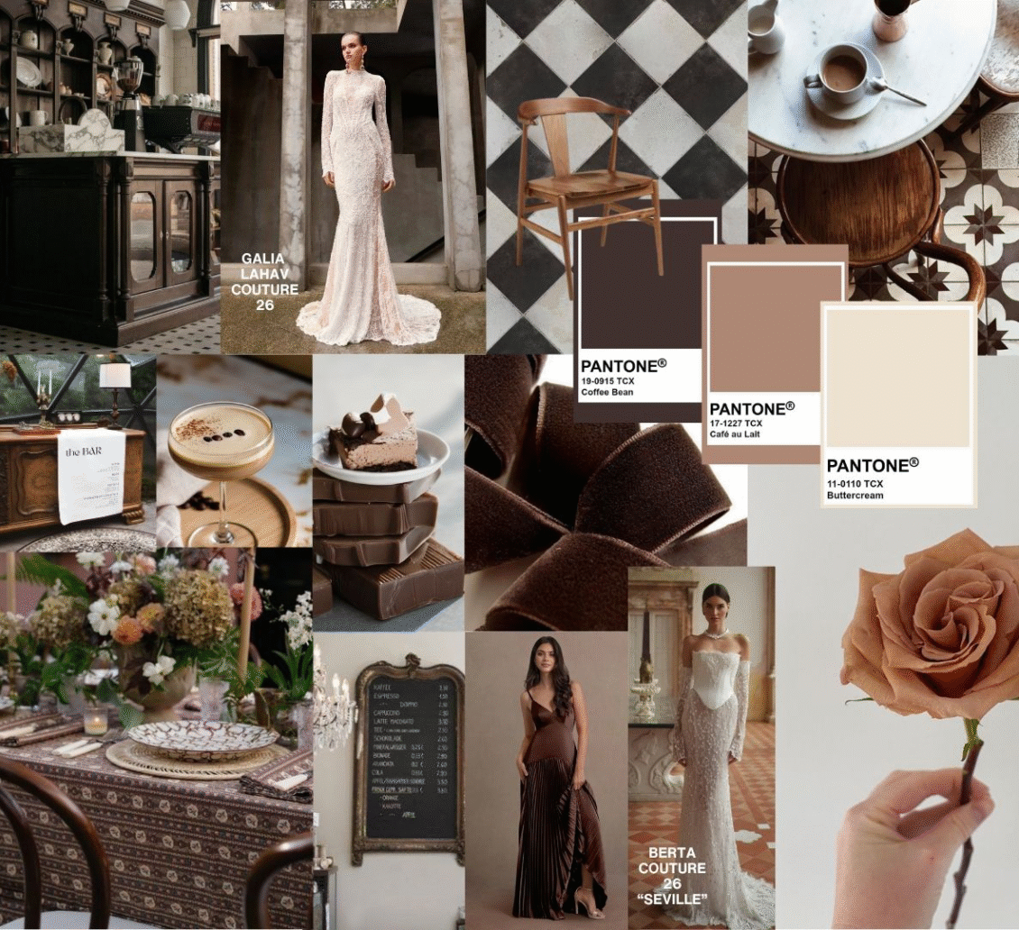 Brown has officially become the new neutral. After several seasons on the fashion runways, this cozy and grounding color is now taking over bridesmaid dresses, floral palettes, and wedding décor. We predict even more of the “Coffee House Revival” as a defining event aesthetic for 2026, from mocha and espresso to oat milk beige. Beyond color, a coffee house vibe brings a mood of intellectualism where community and ritual matter more than spectacle.