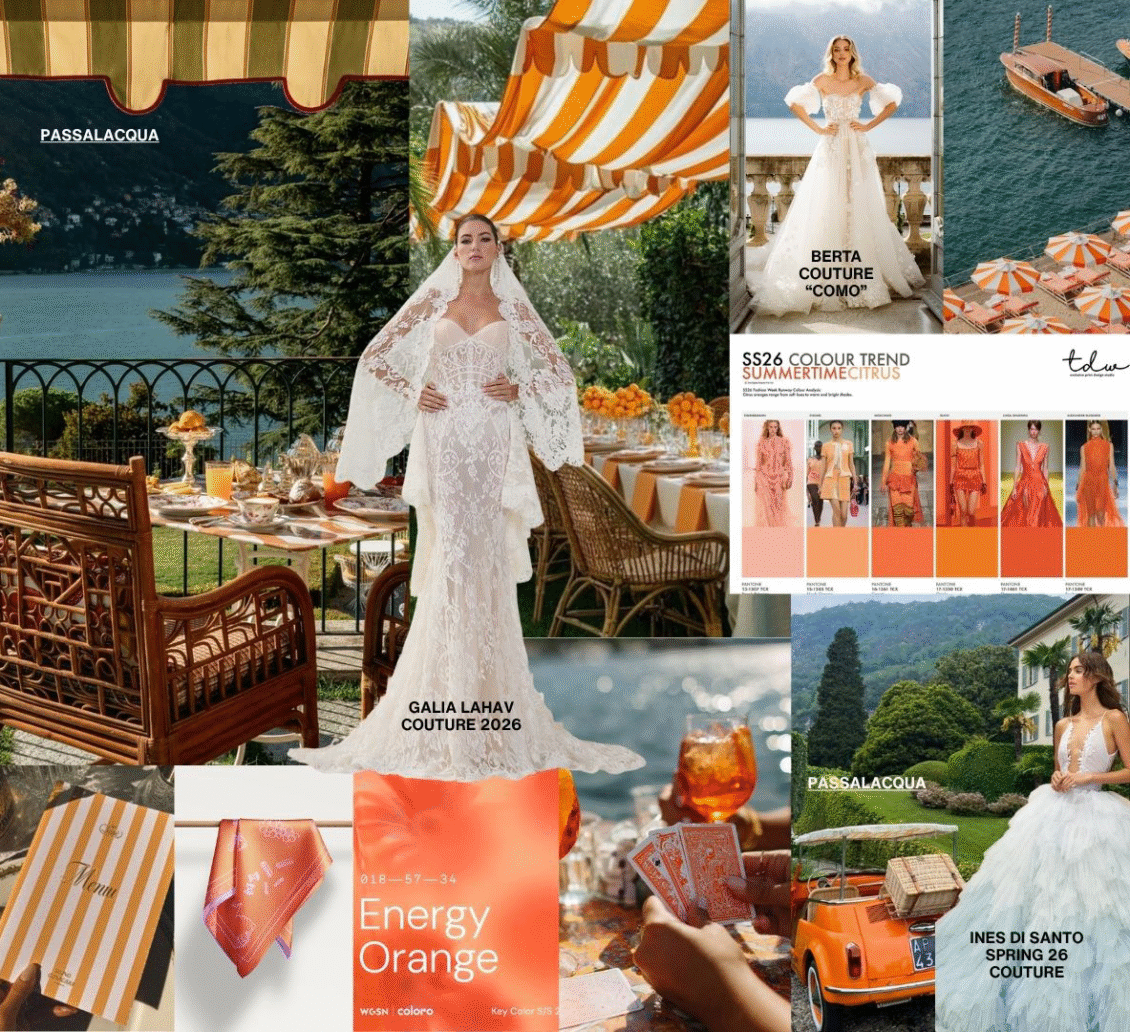 The Lake Como Effect is impossible to ignore! Our feeds are awash with sunlit imagery of this dream destination (hello, @BeccaxBloom), where iconic villas and storied hotels continue to inspire weddings around the world. This effortlessly elegant lakeside aesthetic—timeless, cinematic, and impossibly chic—is spilling into everything from fashion to floral design. Looking ahead, we’re forecasting a Dolce Vita revival as sun-drenched orange and melon hues take center stage for summer 2027. Coloro & WGSN’s S/S 2027 Key Colour, Energy Orange (Coloro code 018-57-34), captures the mood perfectly: a high-vibrancy hue radiating optimism, confidence, and resilience. Styling will embrace body-hugging bodices with old-world sensuality, sweeping trains, statement sleeves, and couture volume, while palettes will glow with sun-warmed citrus tones balanced by soft neutrals and golden light.