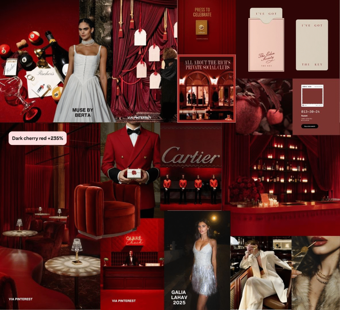 Another look defining the moment is the rise in weddings that feel more like private members’ clubs than traditional receptions with deep and dramatic dark cherry red, glossy maroon, burgundy velvet and brass accents. Picture reception spaces that encourage intimate conversation, layered with tailored design details such as custom monograms, cozy booth-style seating, and richly upholstered furnishings. Couples are also embracing secret-style after parties tucked away behind velvet curtains or password-only entrances. The mood is polished yet playful, tailored, exclusive, and immersive, designed to make guests feel like insiders at a one-night-only club.