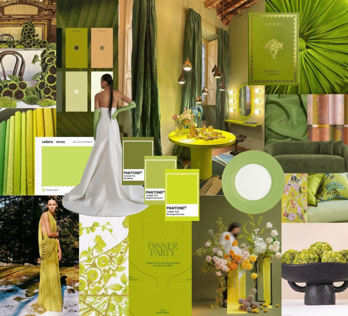 Chartreuse surges into the spotlight for 2026, charged with bold energy and unapologetic vibrancy. Anchoring the story is Coloro + WGSN’s Key Color A/W 26/27, “Green Glow,” a zesty lime tone that captures optimism and modern edge. Paired with citrus hues and moody greens, this palette buzzes with life, pushing past traditional pastels into high-voltage territory.