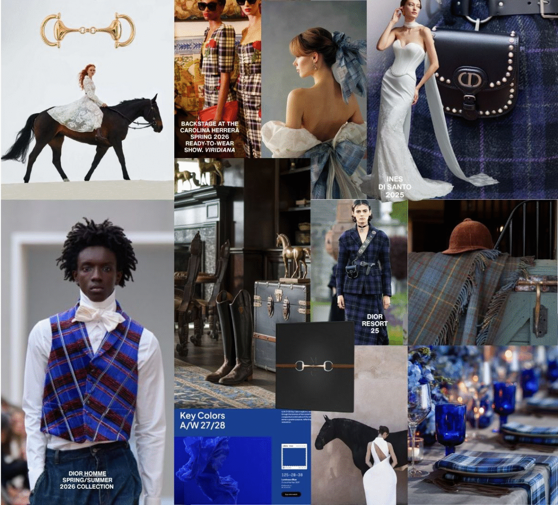 Plaid is having a full-blown moment—seen everywhere at New York Fashion Week this September 2025, from the runways to the front row. With equestrian undertones galloping through fashion, heritage checks are being reimagined through the lens of aristocratic codes—think bridles, riding boots, and impeccably tailored suiting. The look gains fresh momentum when paired with Coloro’s Key Color for A/W 27/28, Luminous Blue, an electrifying shade that injects a modern edge into classic tartans and traditional tailoring. Styling takes cues from equestrian elegance with heritage checks, structured silhouettes, and bridled details refined for a contemporary audience. The palette unites tartan plaids and saddle browns with hits of Luminous Blue, black leather, and cobalt-glass accents, creating a balance between timeless tradition and bold sophistication.