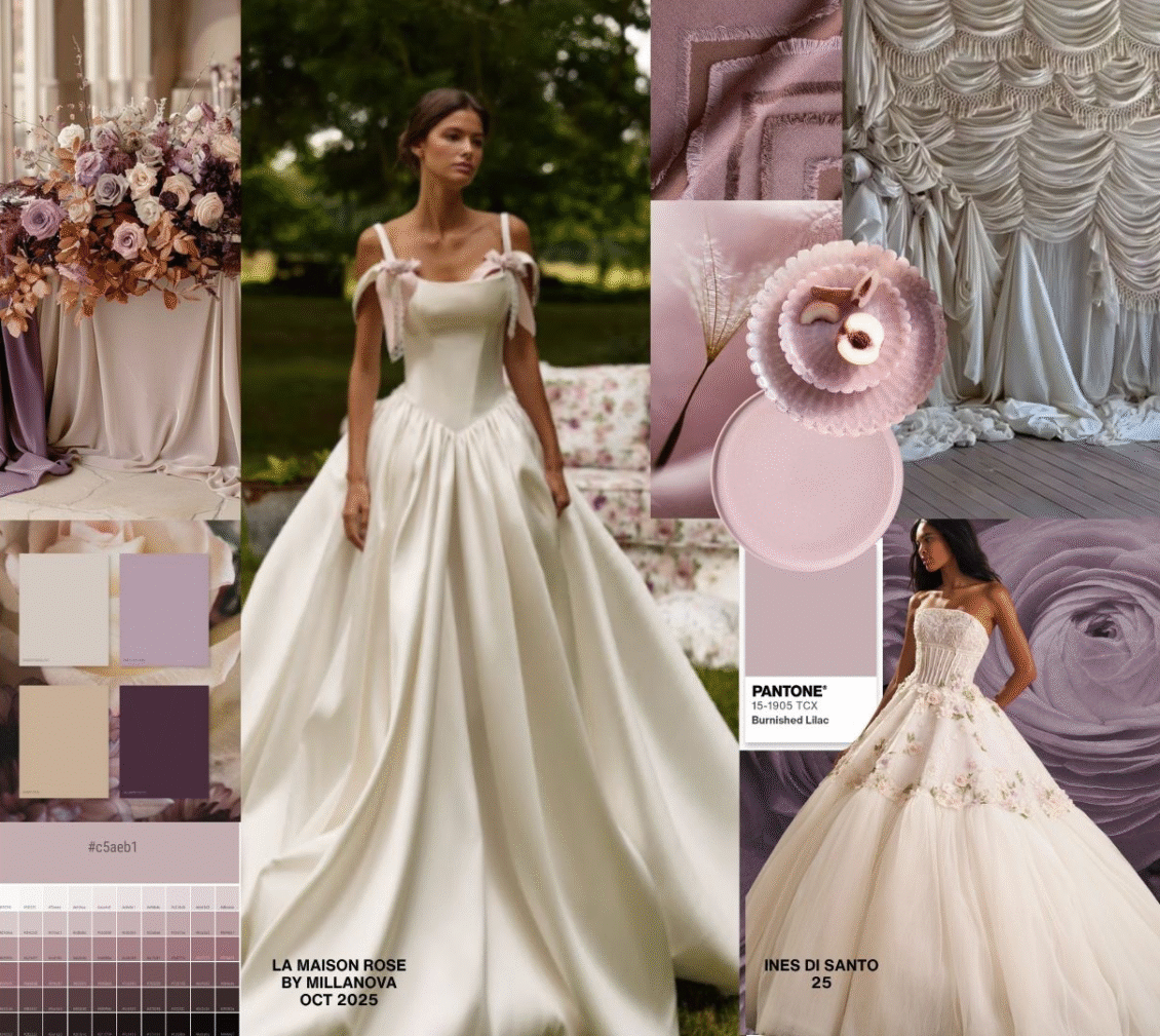 There’s a quiet magic in lilac this season as it moves beyond cottagecore whispers into moments of elevated elegance. For Spring/Summer 2026, warm-hued lilacs are appearing in gowns, matching suits, and sheer layers—offering ethereal romance without ever feeling saccharine. Fabrics with dimension, like ruched tulle, sheer overlays, and fluid satin, add a sense of depth and refinement. Styling embraces sheer layering, textured draping, and floral embroidery interpreted with modern romanticism, while the palette glows with burnished lilac, blush-dust tones, soft lavender, and warm neutrals for a dreamy yet sophisticated effect.