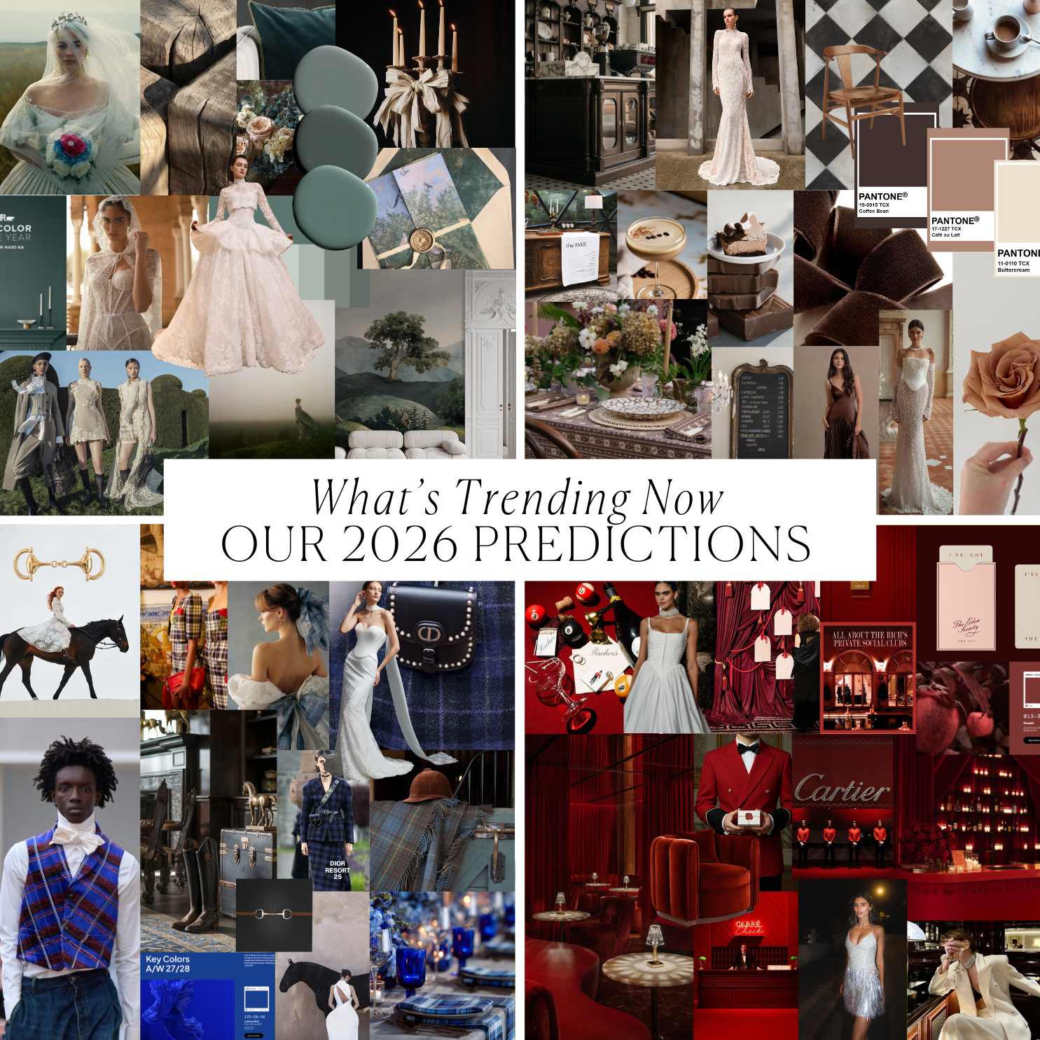 It’s trend-spotting season, and as we move through winter 2025, a few clear wedding design and fashion directions are emerging. From moody Brontë-inspired romance to sun-drenched Italian hues and aristocratic plaids, 2026 and beyond are shaping up to be a study in contrasts—where old-world nostalgia meets modern expression. The private members club aesthetic continues to gain traction, with rich coffee browns and tobacco tones evoking a coffee house revival that feels both intellectual and indulgent. Expect windswept gothic moods, Dolce Vita vibrancy, equestrian elegance, and a renewed fascination with lilac’s quiet magic. Below, we’ve rounded up the standout aesthetics defining what’s next in wedding and fashion design—each one telling its own story through color, texture, and silhouette.