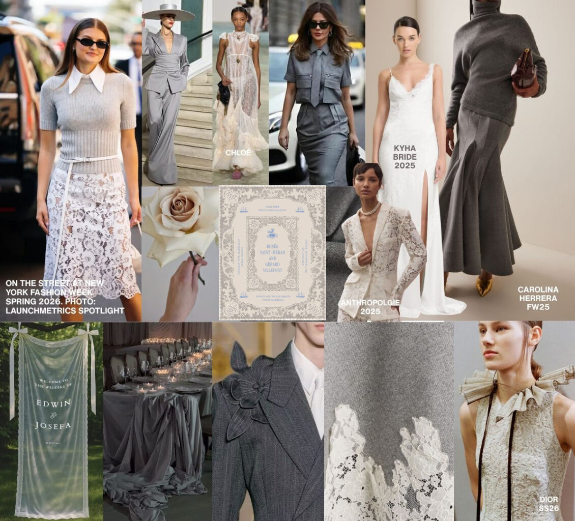 Grey is officially stepping into black’s territory as the new power neutral for 2026. From pewter to charcoal, shades of grey are redefining formality, especially when paired with the deconstructed tailoring and suiting silhouettes dominating runways. Think layered textures—tweed, wool, silk blends—that bring depth and dimension to the palette. At the same time, lace is EVERYWHERE, softening structure with romance: peeking from sweater dresses, layered into eveningwear, and woven through nearly every bridal gown (and stationery piece!) we adore! Designers are using lace in new, tactile ways that bring softness and dimension to modern celebrations. Together, grey’s refined edge and lace’s delicate allure create a striking duo—modern, elegant, and undeniably wedding-worthy.