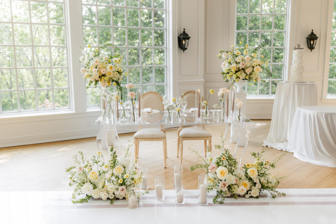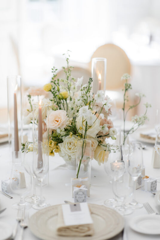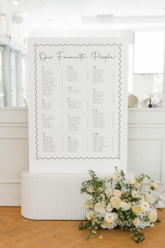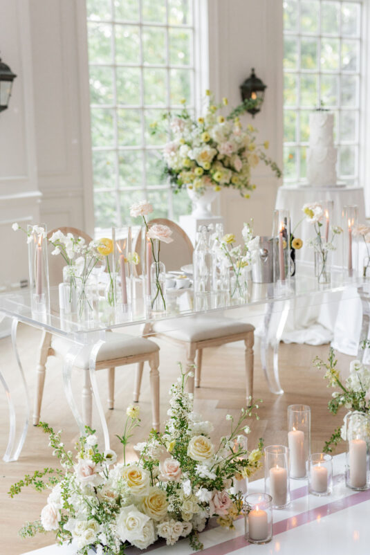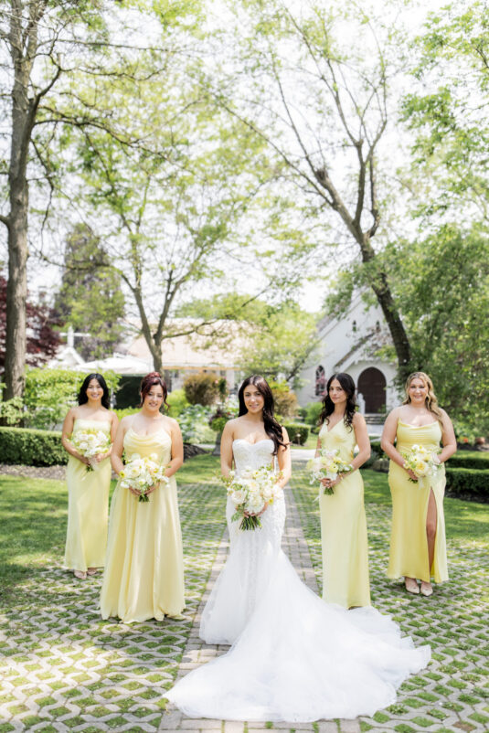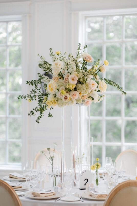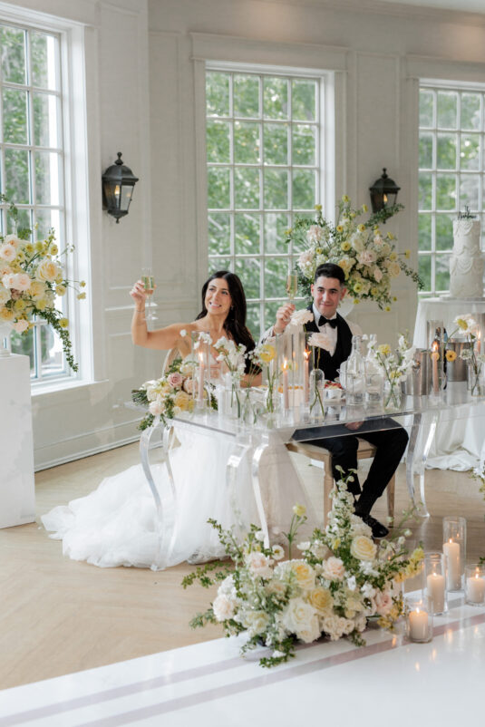 Drawing inspiration from the effortless beauty of an English garden party, the couple envisioned a chic garden soirée that felt sun-kissed, joyful, and intimate. Butter-yellow florals, loose greenery, and a soft pastel palette anchored the design, while delicate arrangements and refined tablescapes created an atmosphere of subtle sophistication. The Doctor’s House in Kleinburg – known for its charming grounds and idyllic ambiance—became the perfect backdrop for their vision, with each space transformed to echo the dreamy elegance of an alfresco summer celebration.