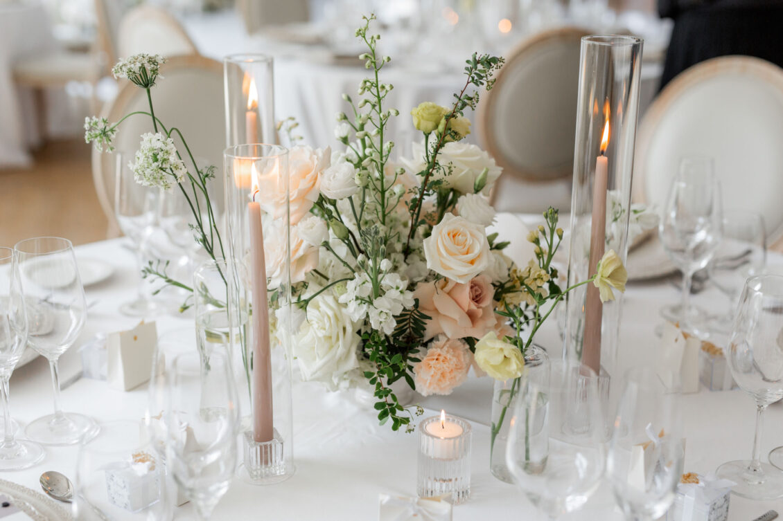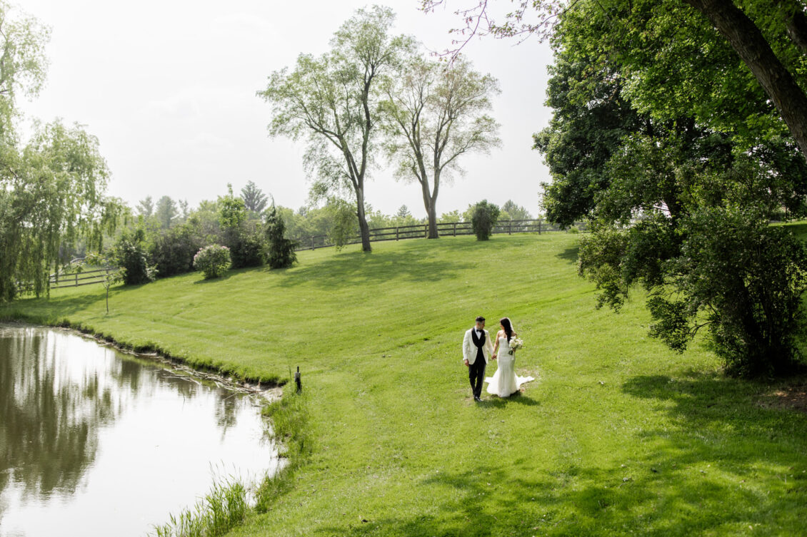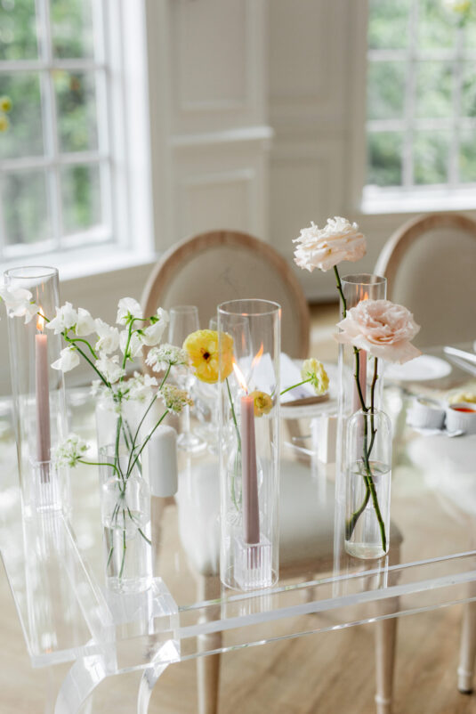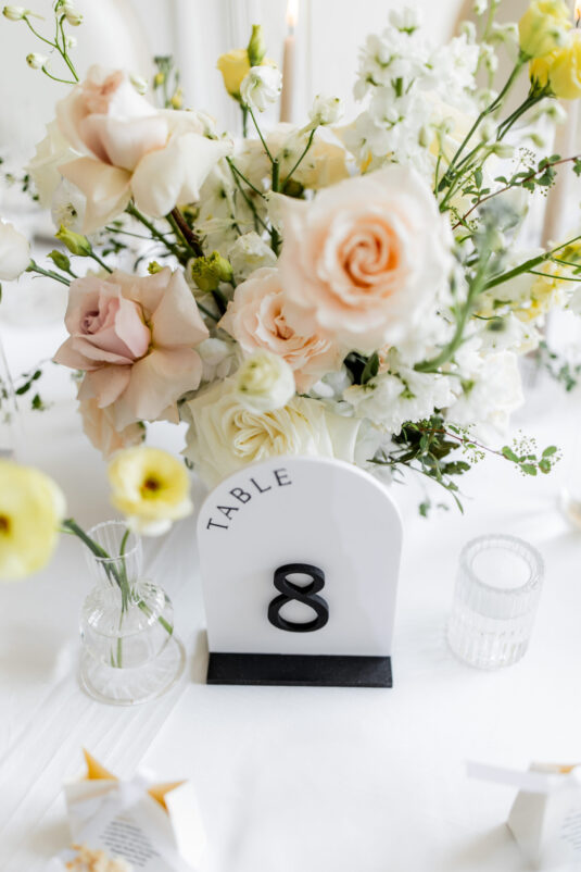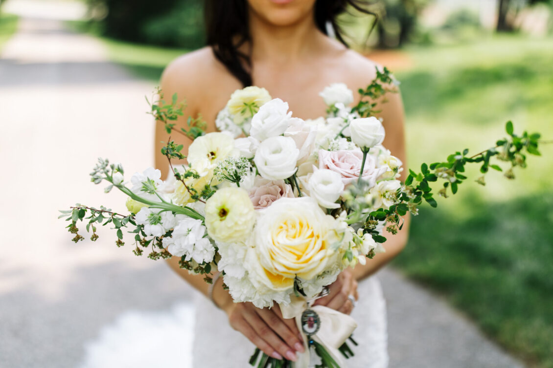 Drawing inspiration from the effortless beauty of an English garden party, the couple envisioned a chic garden soirée that felt sun-kissed, joyful, and intimate. Butter-yellow florals, loose greenery, and a soft pastel palette anchored the design, while delicate arrangements and refined tablescapes created an atmosphere of subtle sophistication. The Doctor’s House in Kleinburg – known for its charming grounds and idyllic ambiance—became the perfect backdrop for their vision, with each space transformed to echo the dreamy elegance of an alfresco summer celebration.