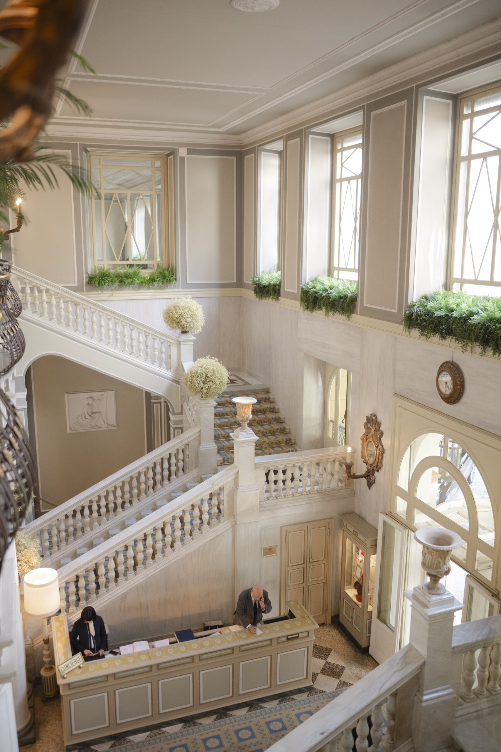 A spacious, elegant hotel lobby with a marble staircase, tall windows letting in natural light, and lush green plants along the window ledges—perfect for capturing memories before your Villa d’Este wedding.