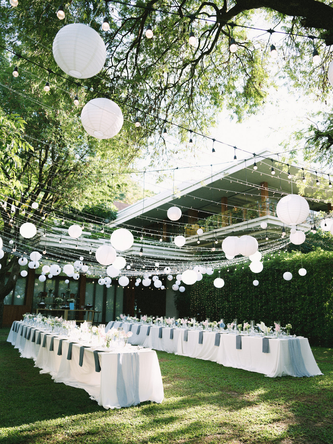 Outdoor wedding reception with long tables covered in white cloths, elegant place settings, and string lights with round white lanterns, set in a lush garden with a modern house—perfect for a stylish modern destination wedding in Phuket.