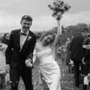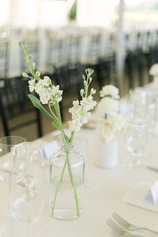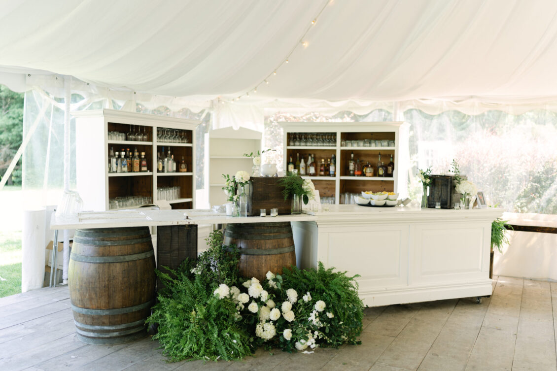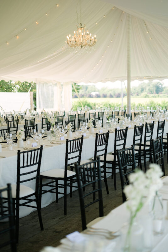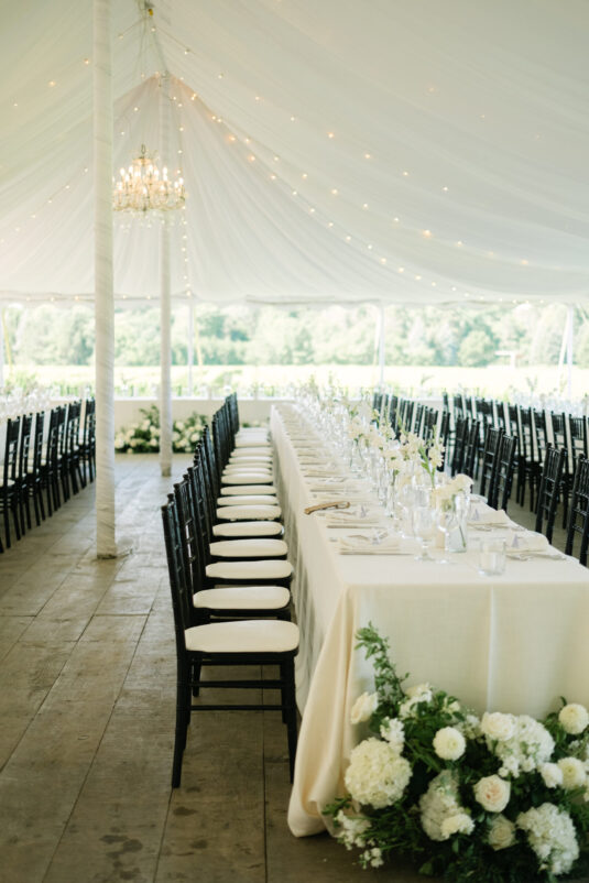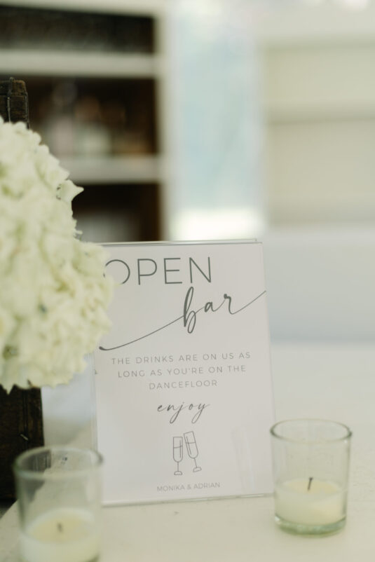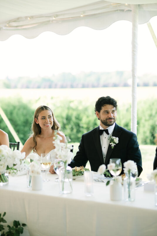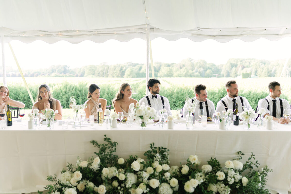 Monika’s bridal look reflected the tone of the celebration perfectly. Her gown was timeless and fluid, moving effortlessly with her throughout the day and feeling entirely at home within the orchard surroundings. The reception continued under a softly draped tent, where long tables, gentle floral accents, and ambient lighting created an inviting environment that encouraged guests to linger. Rather than feeling staged, the space felt lived-in—warm, welcoming, and designed for conversation, laughter, and shared moments.