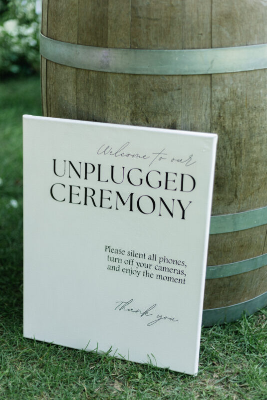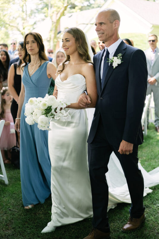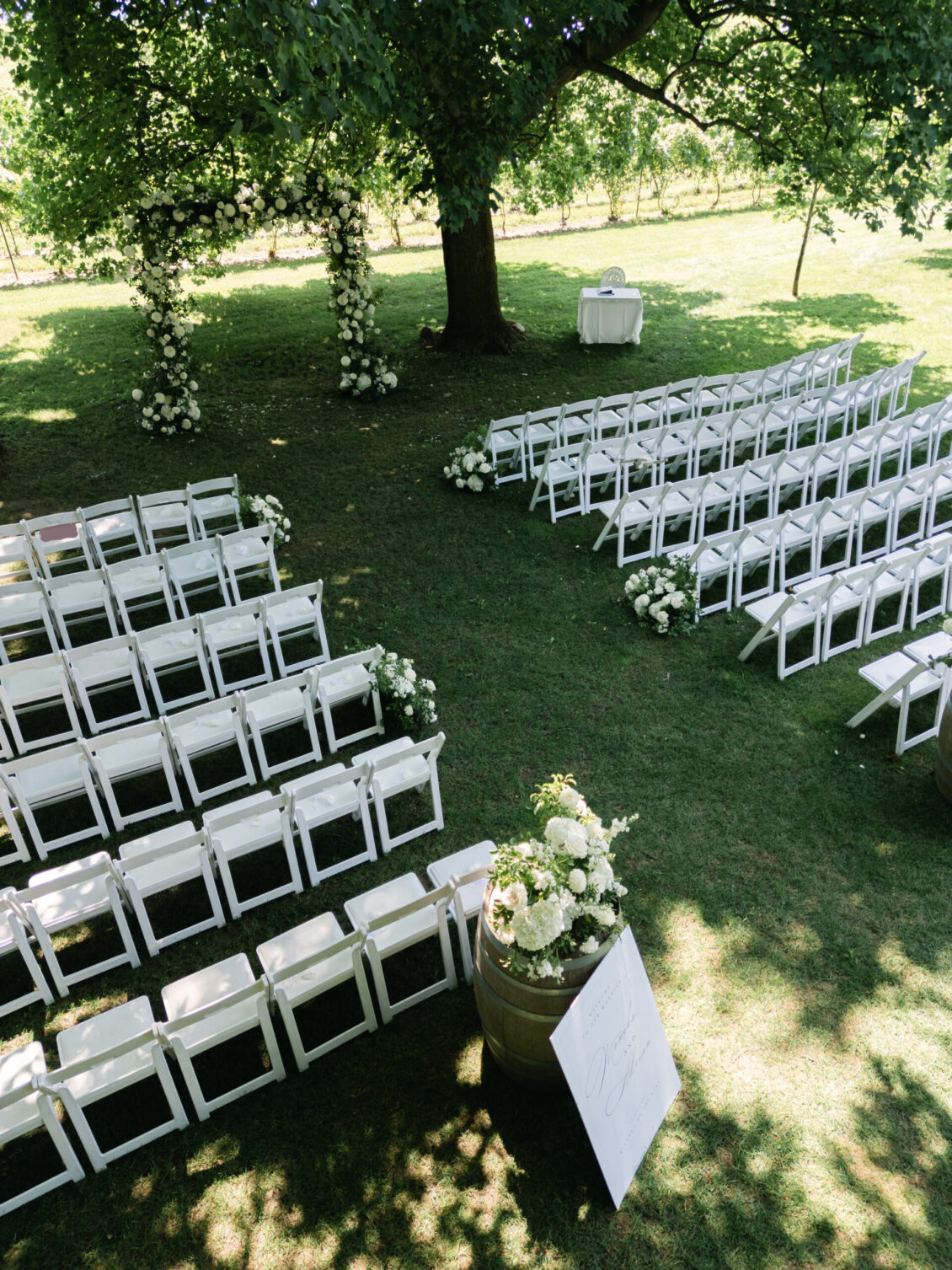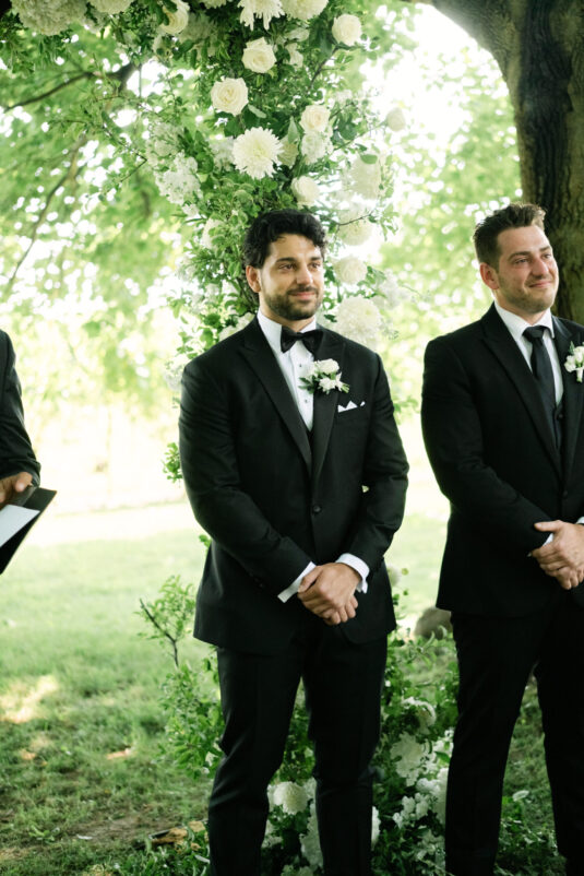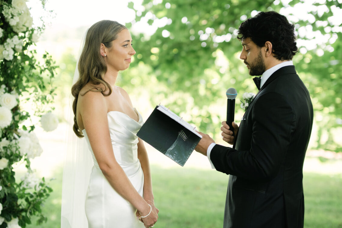 The ceremony unfolded beneath a sculptural floral arch by Bloom & Co., designed to feel organic within the orchard setting while still making a visual statement. Framed by towering trees and bathed in warm summer light, the moment felt quietly intimate despite being surrounded by loved ones. There was a calm, grounded energy as Monika and Adrian exchanged vows—one that invited guests to slow down, be present, and fully absorb the emotion of the day. It was the kind of ceremony that defines a dreamy summer tent wedding: serene, heartfelt, and beautifully understated.