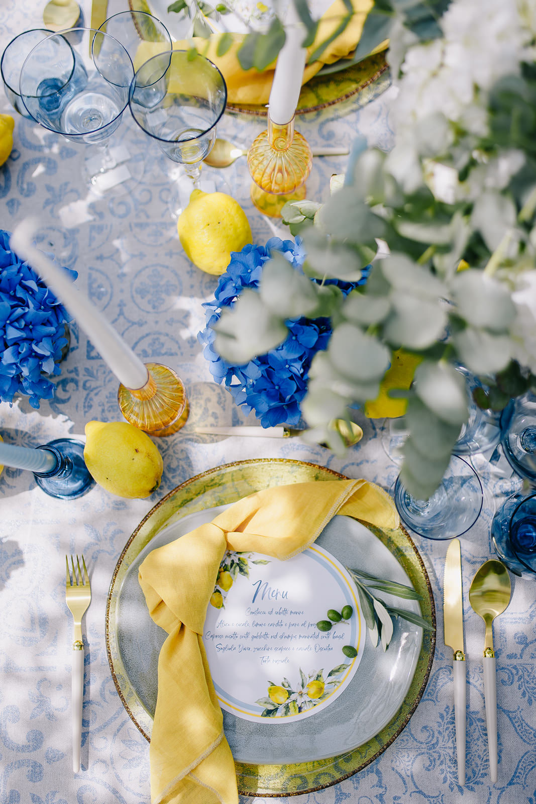 A vibrant table setting for an intimate Italian wedding, with a yellow and blue color scheme, featuring yellow napkins, gold cutlery, blue hydrangeas, fresh lemons, tall white candles, and a floral menu card on a decorative plate.