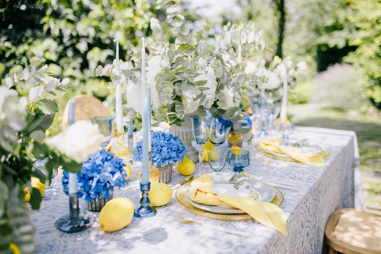 An Intimate Italian Wedding unfolds with an elegant outdoor table setting featuring blue hydrangeas, lemons, white flowers, glassware, candles, yellow napkins, and greenery on a patterned white tablecloth in a sunny garden.