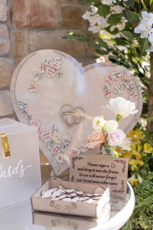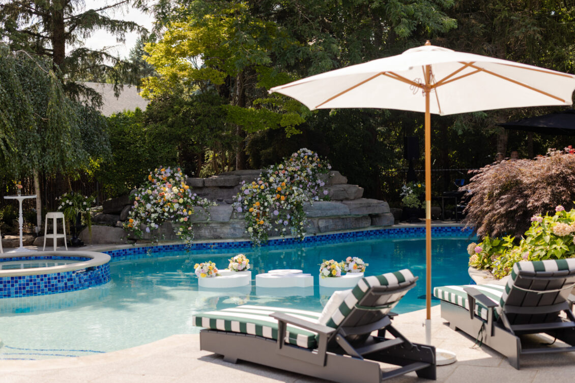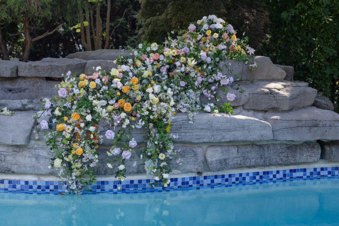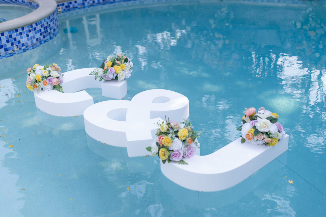 transformed the property into a lush, romantic landscape, with arrangements that felt generous, expressive, and full of movement. Cascading florals flowed dramatically down the estate’s waterfall, while the couple’s monogram appeared to float delicately in the pool—an unexpected, design-driven moment that felt both playful and poetic. These details didn’t just decorate the space; they told a story of romance, intention, and anticipation.