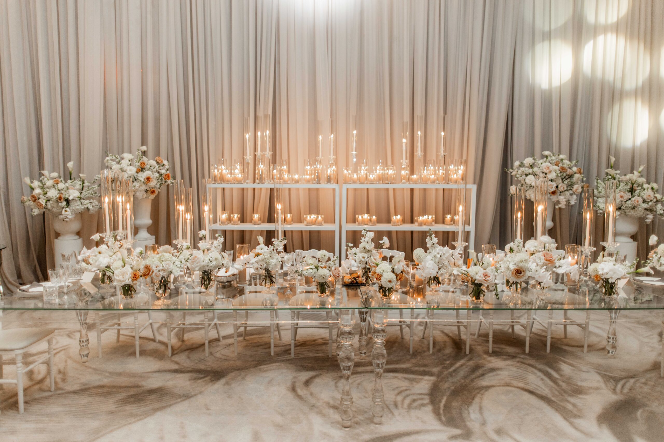 Elegant Ritz-Carlton Toronto wedding reception setup with a long glass table, clear chairs, white and cream floral arrangements, and numerous lit candles against draped beige curtains.