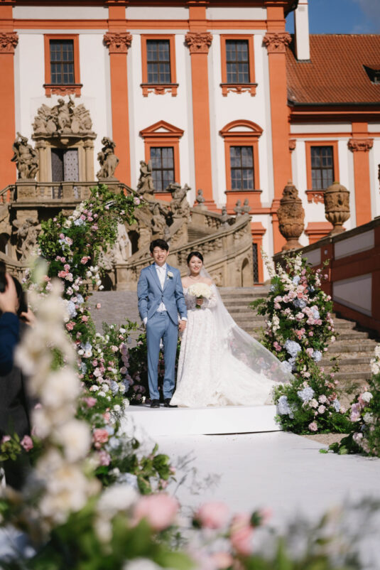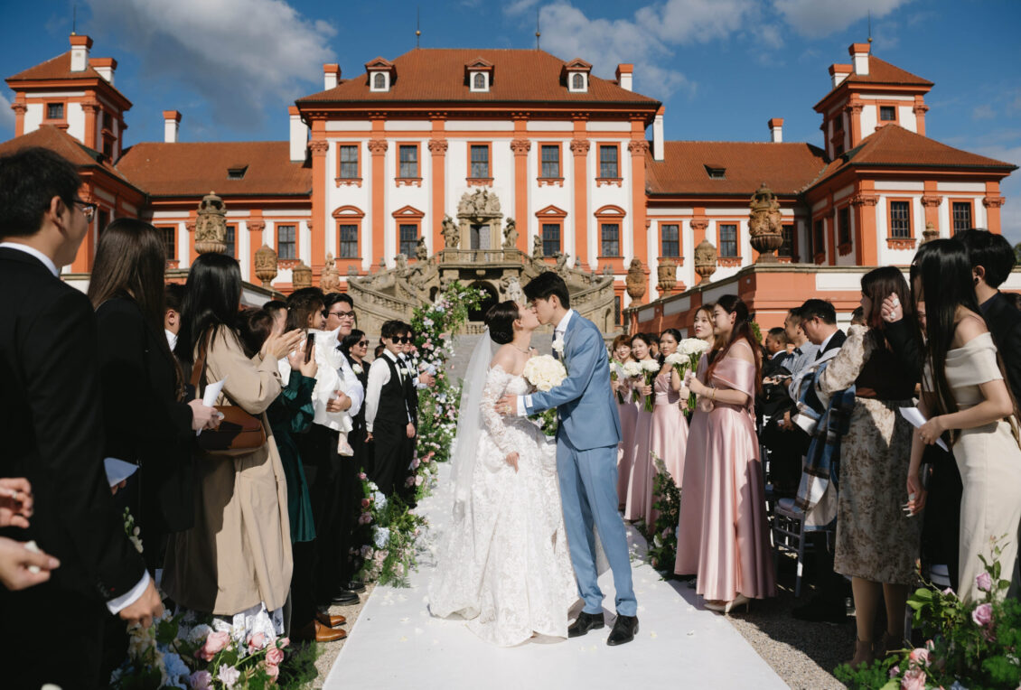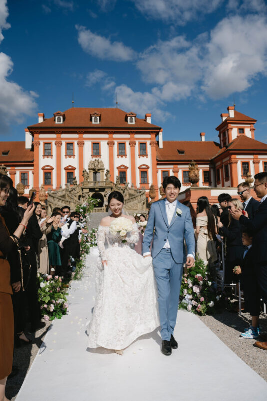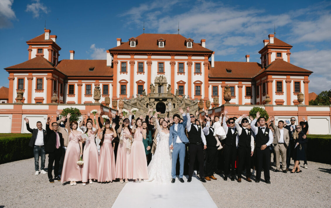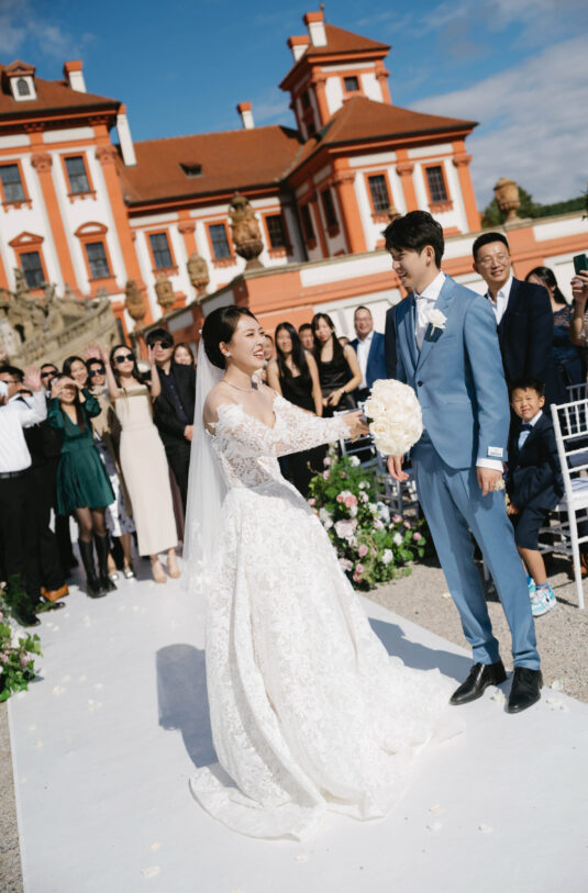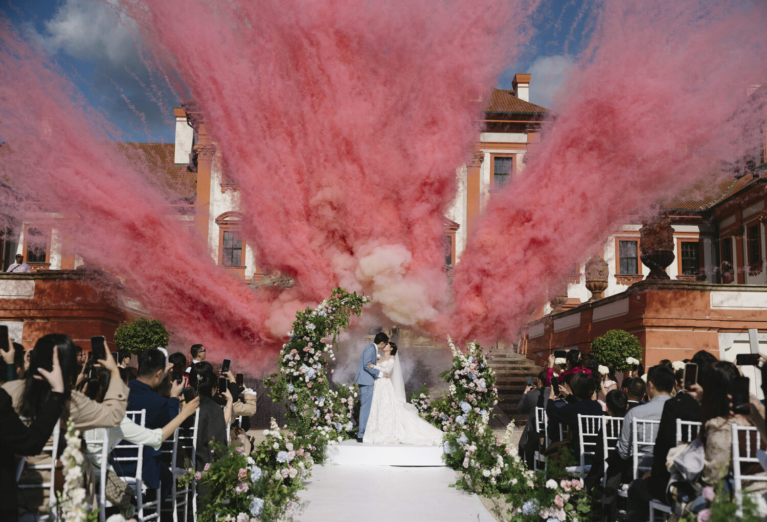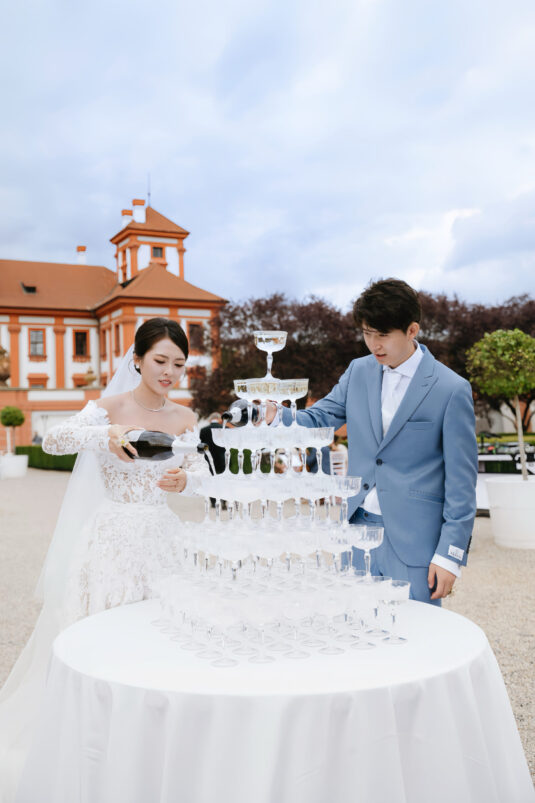 The day began at the couple’s home with an intimate traditional Chinese ceremony. Dressed in a custom red gown tailor-made in China, Vicky honoured her heritage in a moment filled with ritual and meaning. Following the ceremony, a convoy of fifty cars — led by the couple in a charming vintage vehicle — made its way through Prague to the historic Troja Château, setting the tone for what would become a truly cinematic luxury Prague wedding.