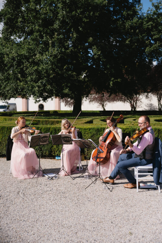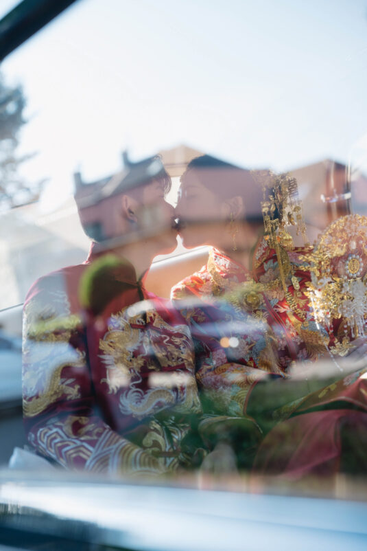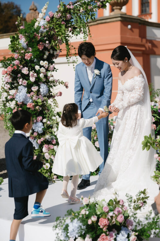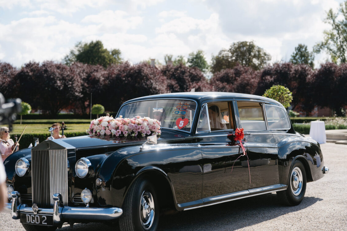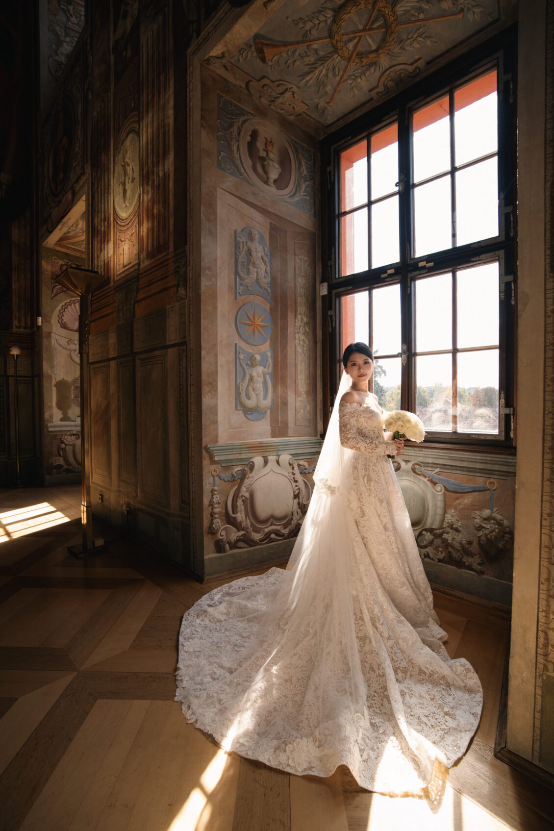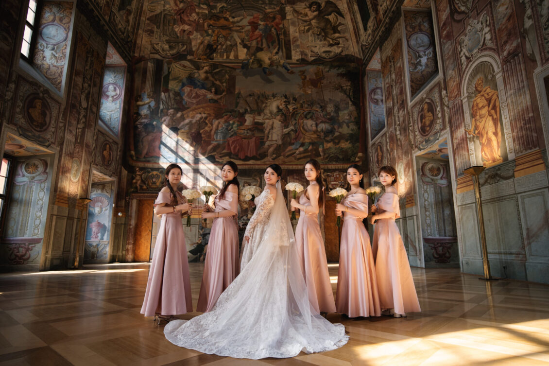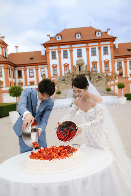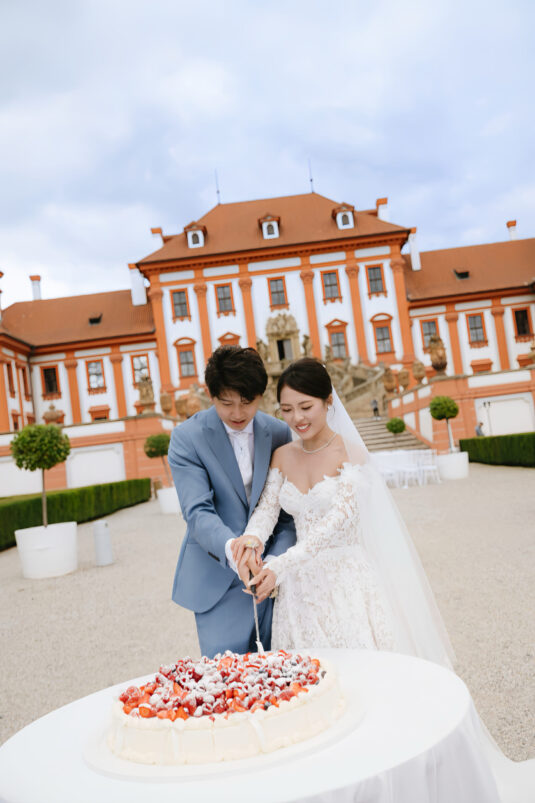 The day began at the couple’s home with an intimate traditional Chinese ceremony. Dressed in a custom red gown tailor-made in China, Vicky honoured her heritage in a moment filled with ritual and meaning. Following the ceremony, a convoy of fifty cars — led by the couple in a charming vintage vehicle — made its way through Prague to the historic Troja Château, setting the tone for what would become a truly cinematic luxury Prague wedding.