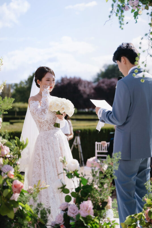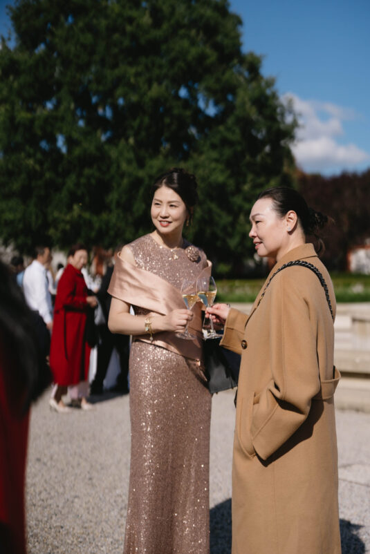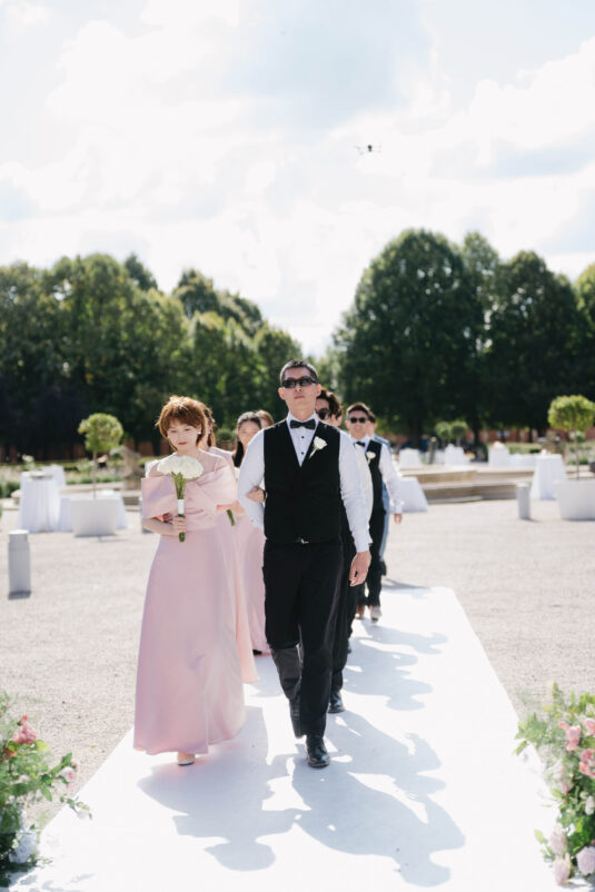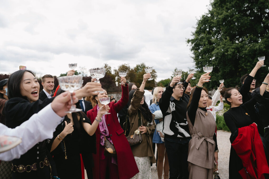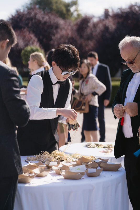 As guests arrived at the château, they were immersed in an interactive garden experience that balanced elegance with playfulness. Thoughtfully designed moments included herb and sauce stations inspired by Chinese tradition, a phone booth for recorded messages, and mirrored Polaroid installations that encouraged guests to engage with the celebration beyond the ceremony itself. Meanwhile, Vicky slipped inside the château for bridal portraits with her bridesmaids, capturing a quieter counterpoint to the lively atmosphere outdoors.