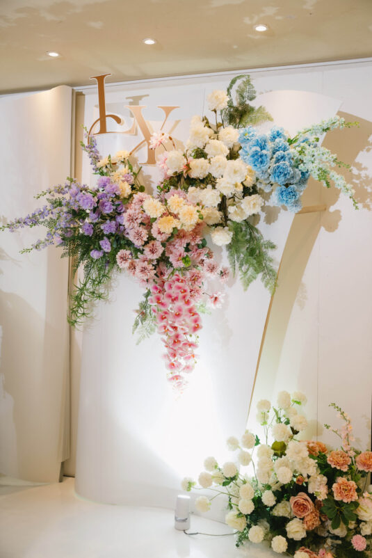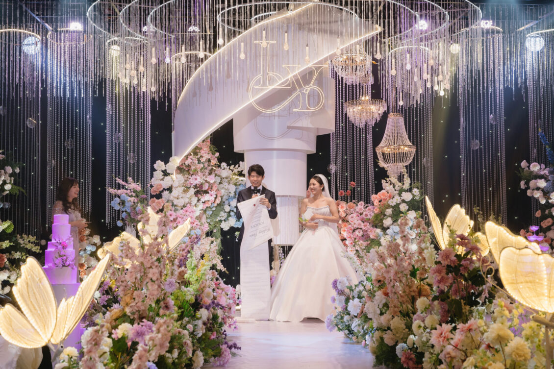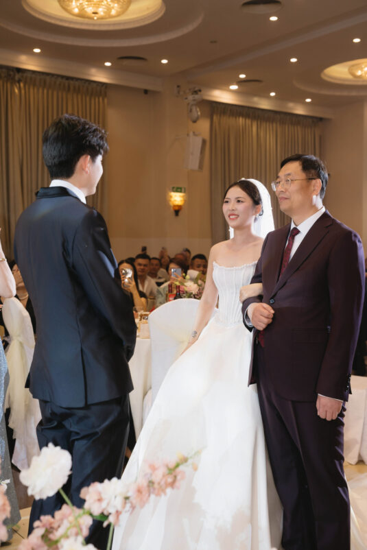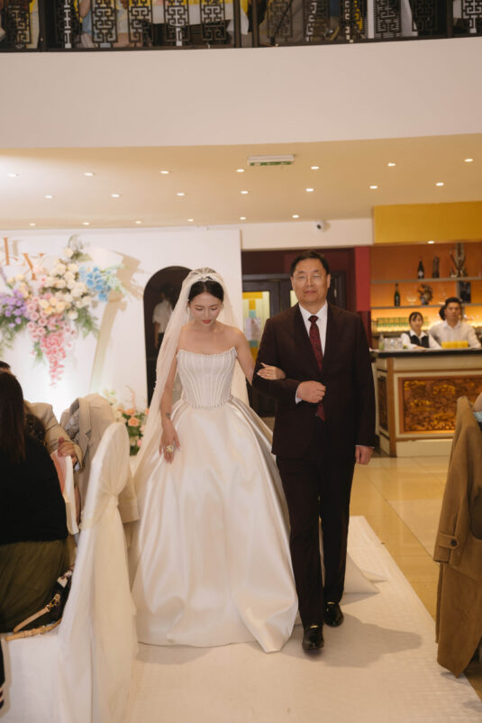 A symbolic ceremony officiated in Chinese followed, culminating in a show-stopping first kiss punctuated by perfectly timed pink fireworks — a detail Vicky had long dreamed of. Lunch was served immediately after, complete with a champagne tower moment and an Italian-style cake ritual where fruit and sugar were added before the first slice, blending yet another layer of cultural meaning into the day.